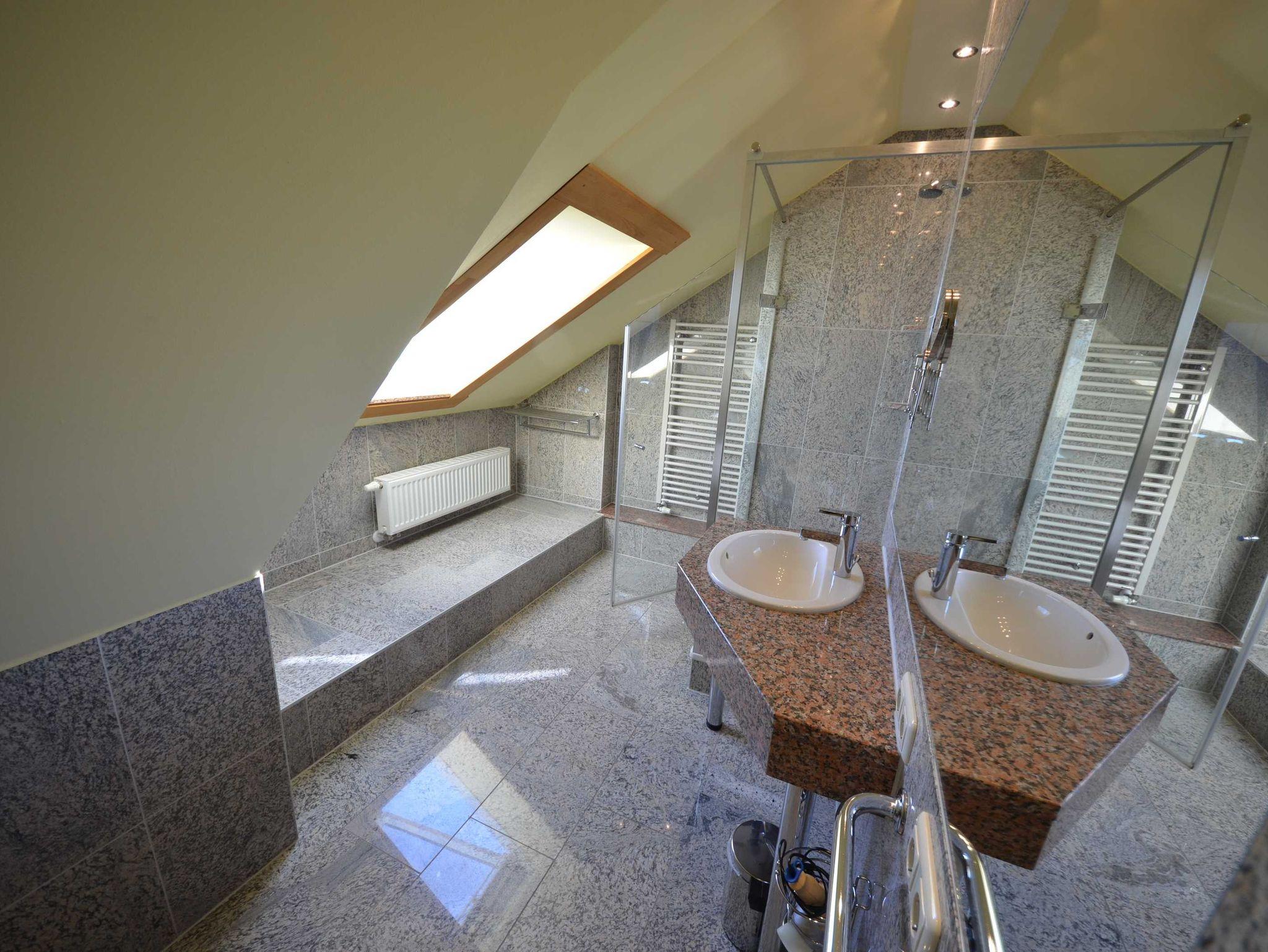 Glas-Dusche mit Sitzbank aus Granit, Fußbodenheizung, Granitabdeckungen, große Spiegel, schöne Sanitärausstattung: Toilette und Bidet, Einbau-Waschbecken mit Granitabdeckungen, beheizbarer Handtuchhalter, Fön, Schminkspiegel.