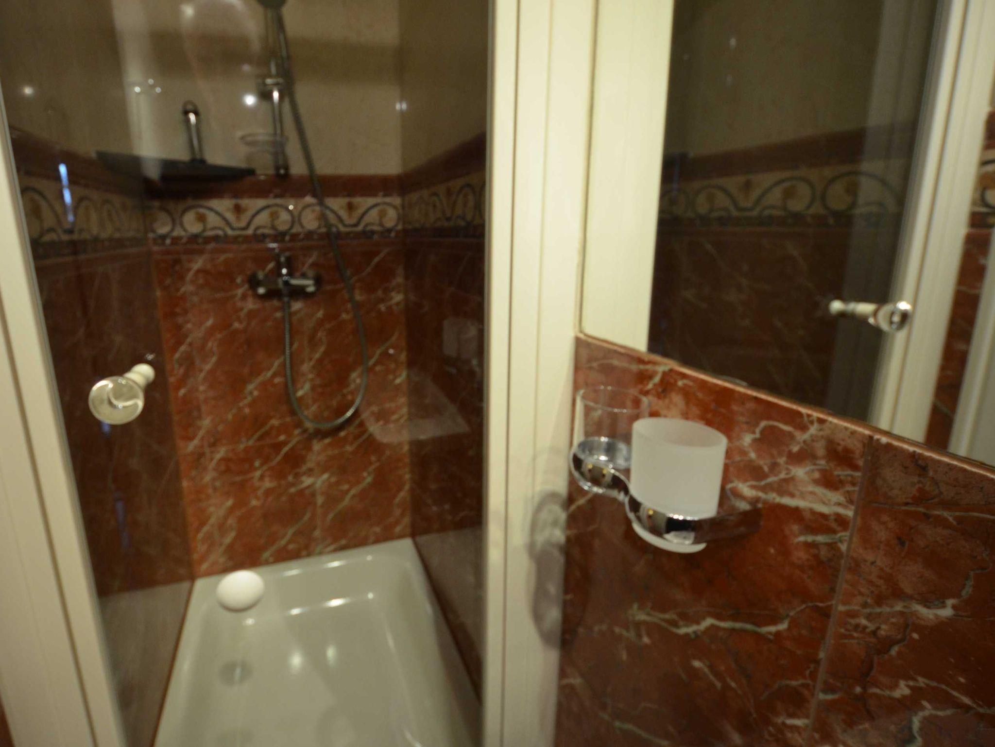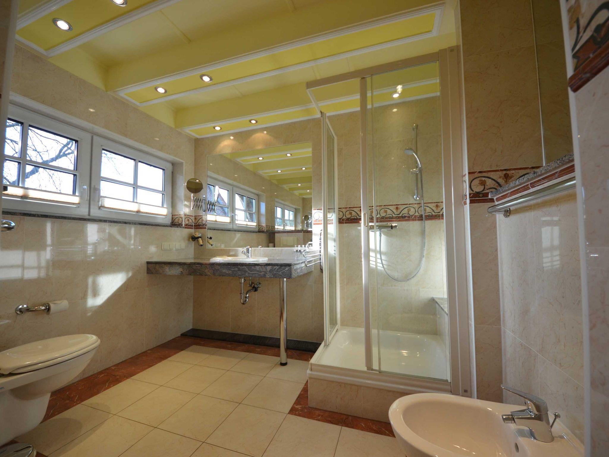 Fußbodenheizung, Naturstein - Abdeckungen, große Spiegel, schöne