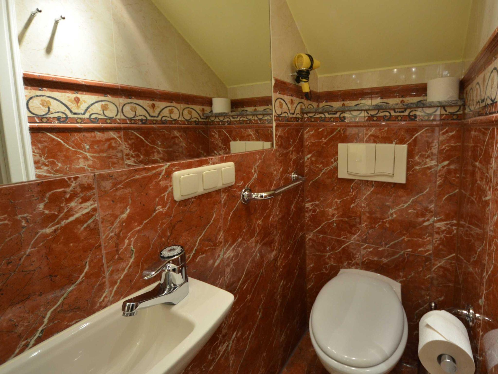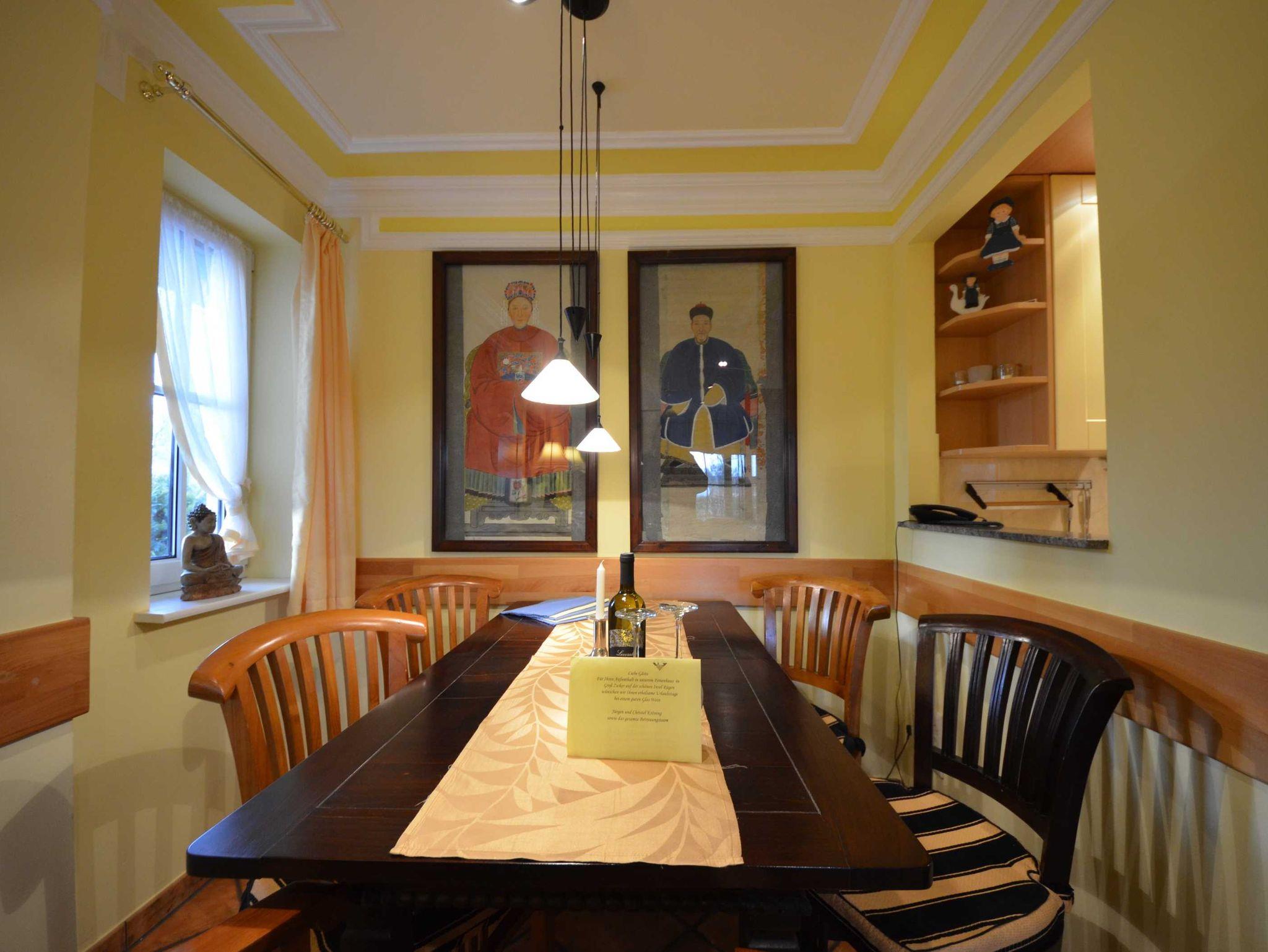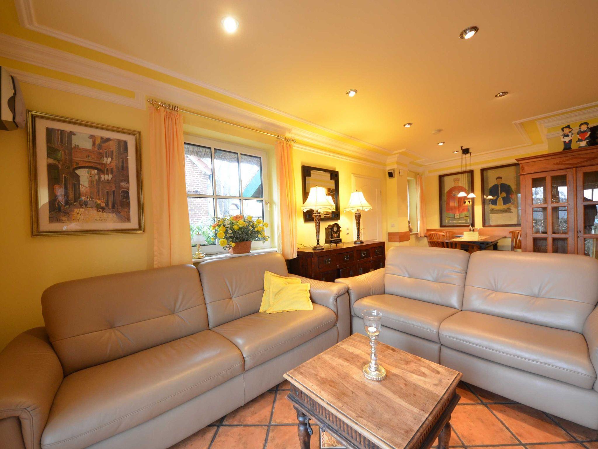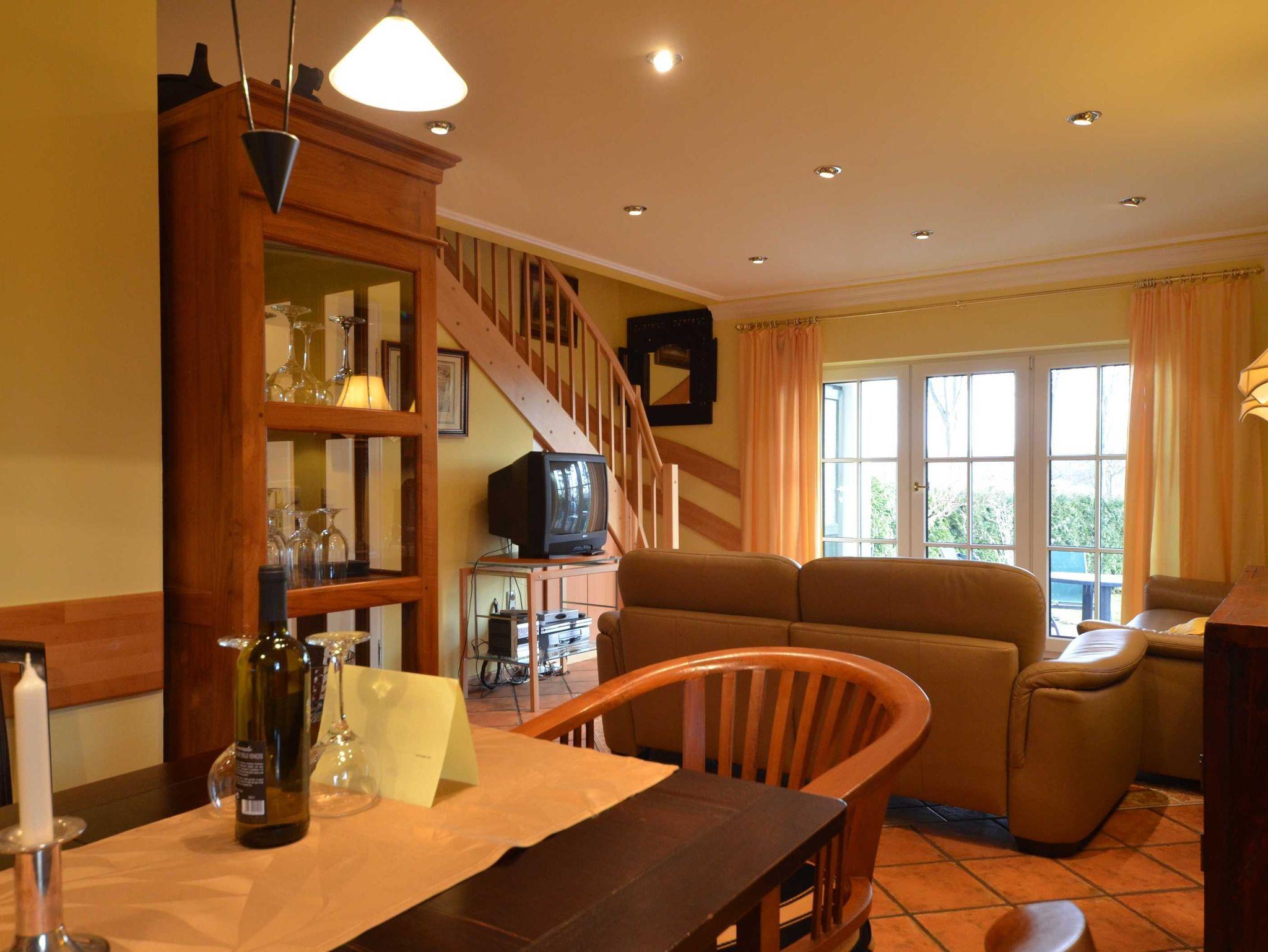 2 Bäder, Fußbodenheizung, schön eingerichtetes Wohn- Esszimmer, Couchgarnitur mit Leder bezogen, Opiumtisch, Speisetafel mit Stühlen, Geschirrschrank, Sat - TV, Telefon, Spiegel pp.
