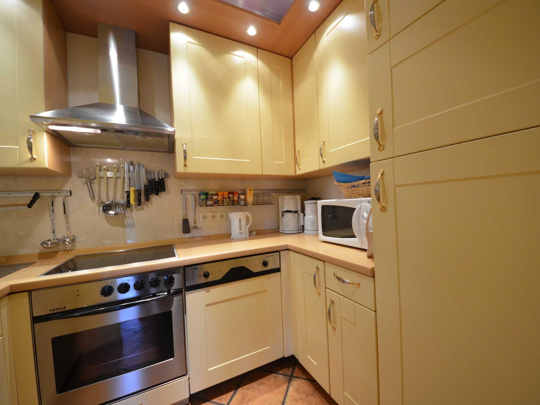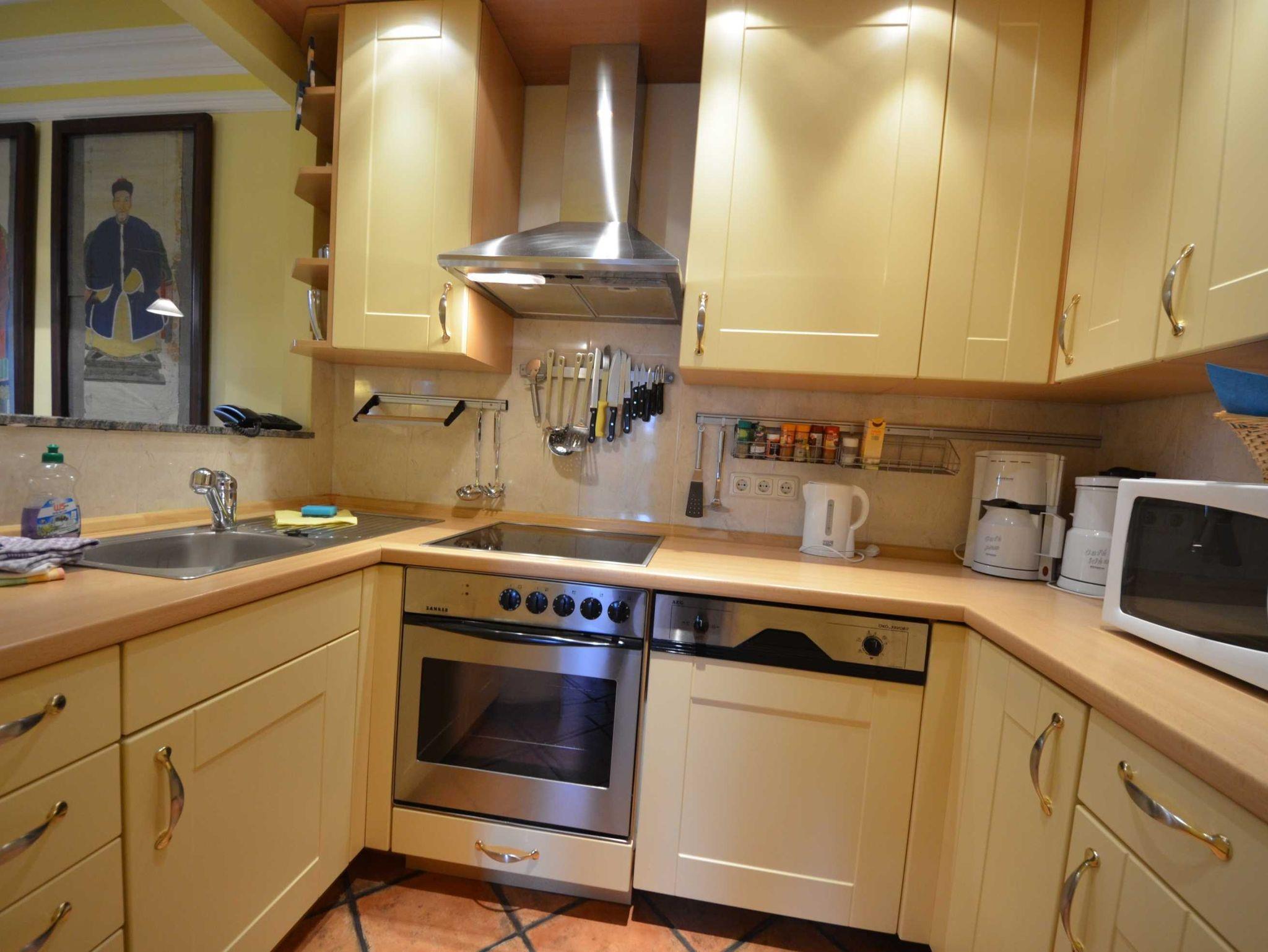 Geschirrspüler, Mikrowelle, Herd mit Ceran - Kochfeld und Backofen, Turmhaube, 2 Kaffeemaschinen, Wasserkocher, Eierkocher, Toaster, Waffeleisen, Mixer,