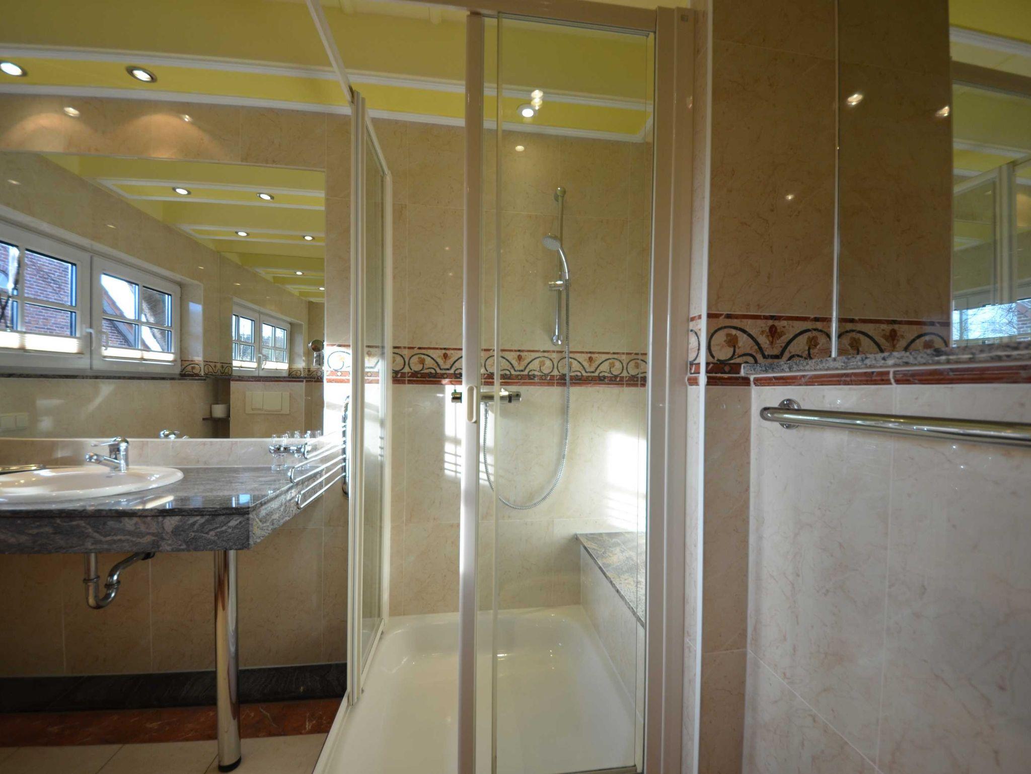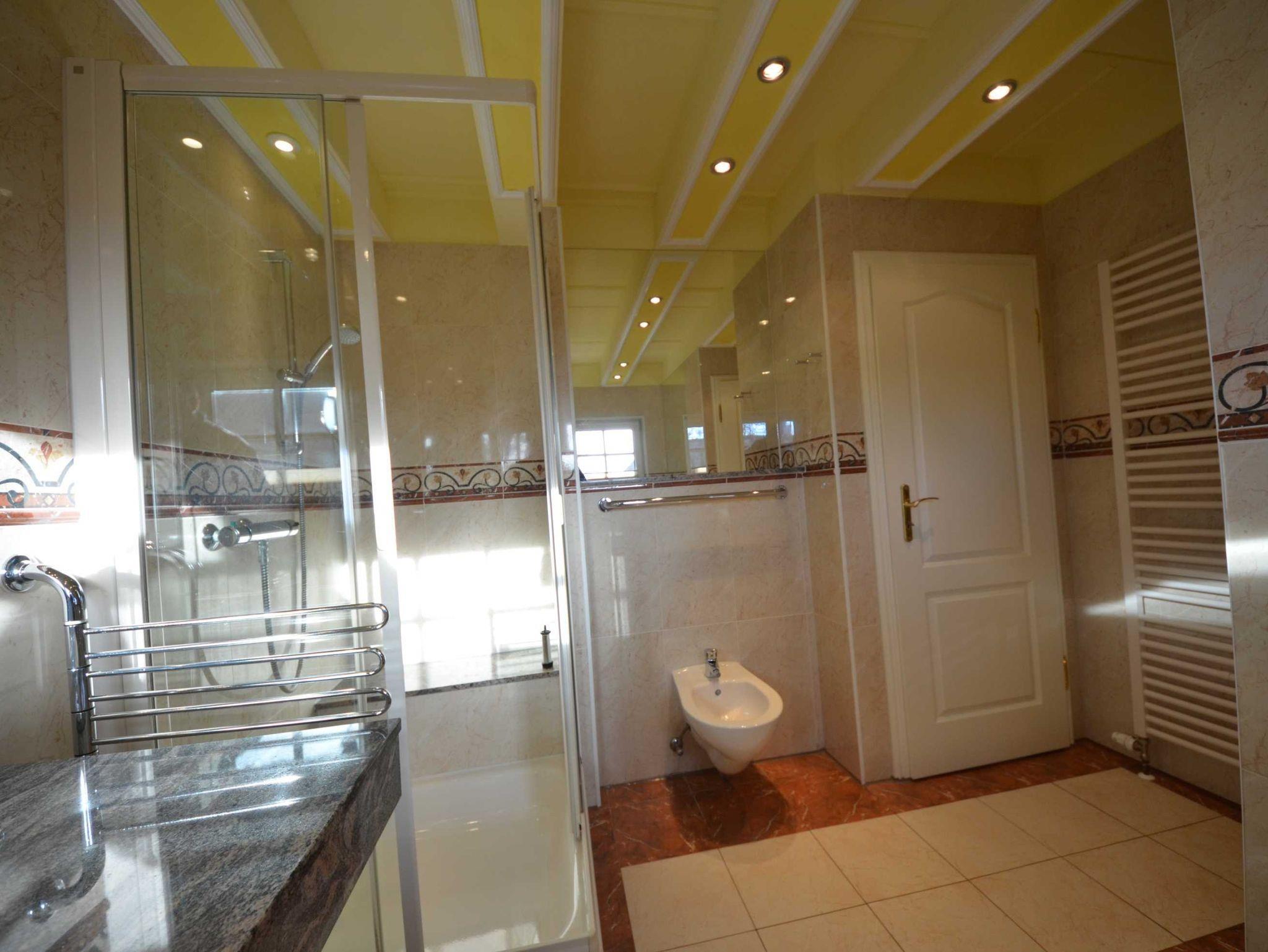 Badezimmer mit Fußbodenheizung, Natursteinverkleidung, große Spiegel, schöne Sanitärausstattung,beheizbarer Handtuchhalter,Bidet, Fön, Schminkspiegel, Glas-Dusche