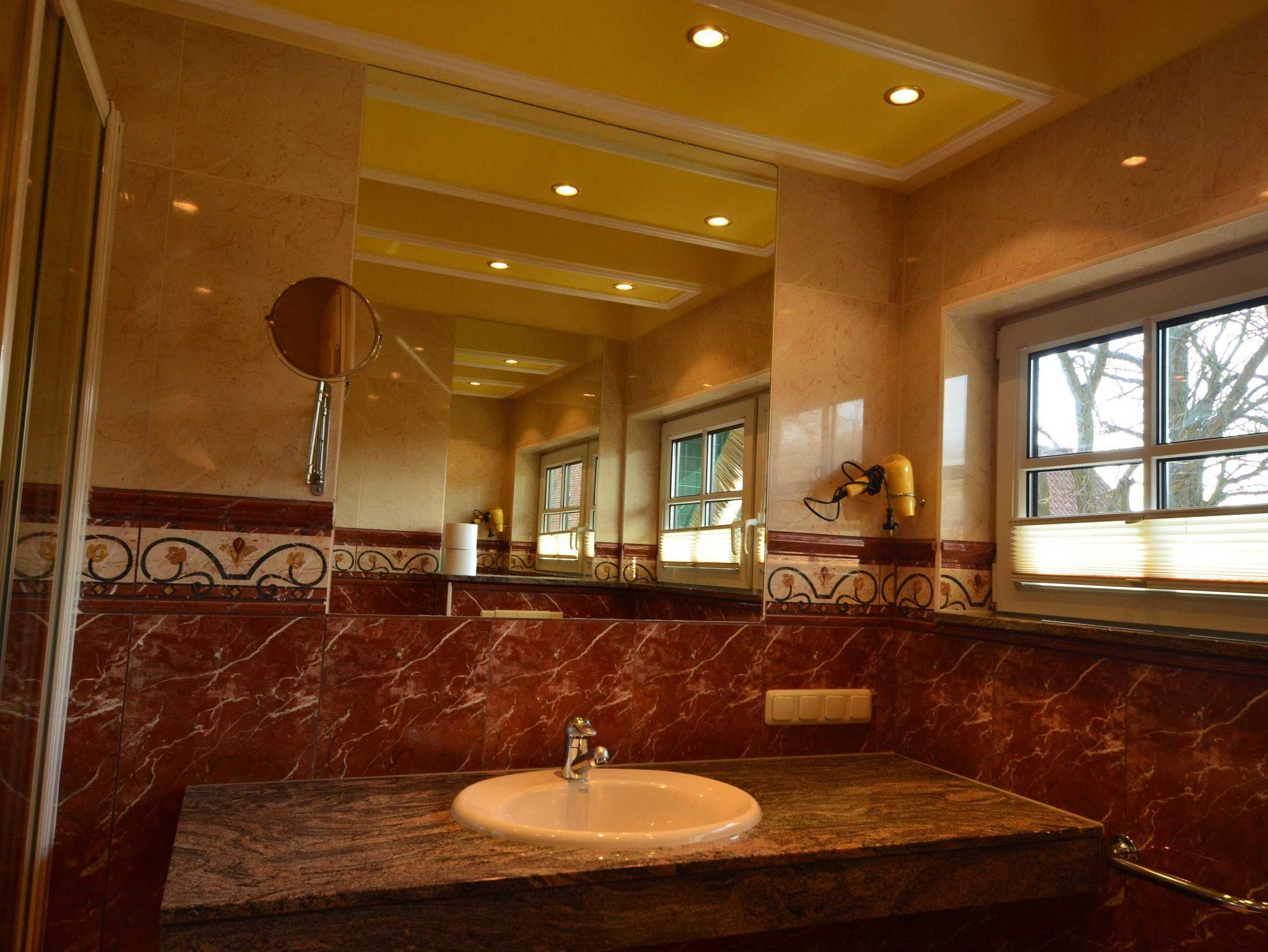 Fußbodenheizung, Naturstein - Abdeckungen, große Spiegel, schöne