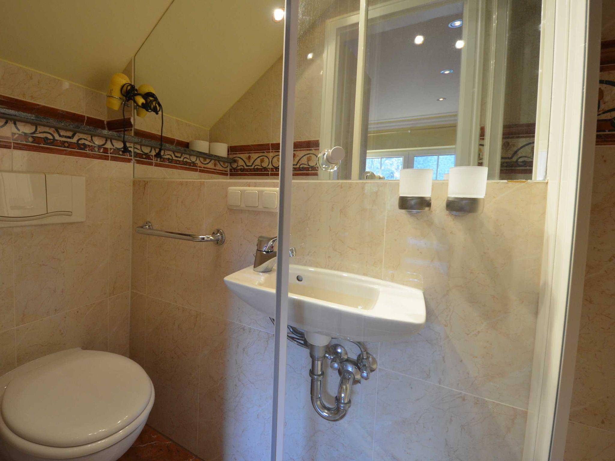 Glas ? Dusche, Toilette, Fußbodenheizung, Fön, kleines Waschbecken
