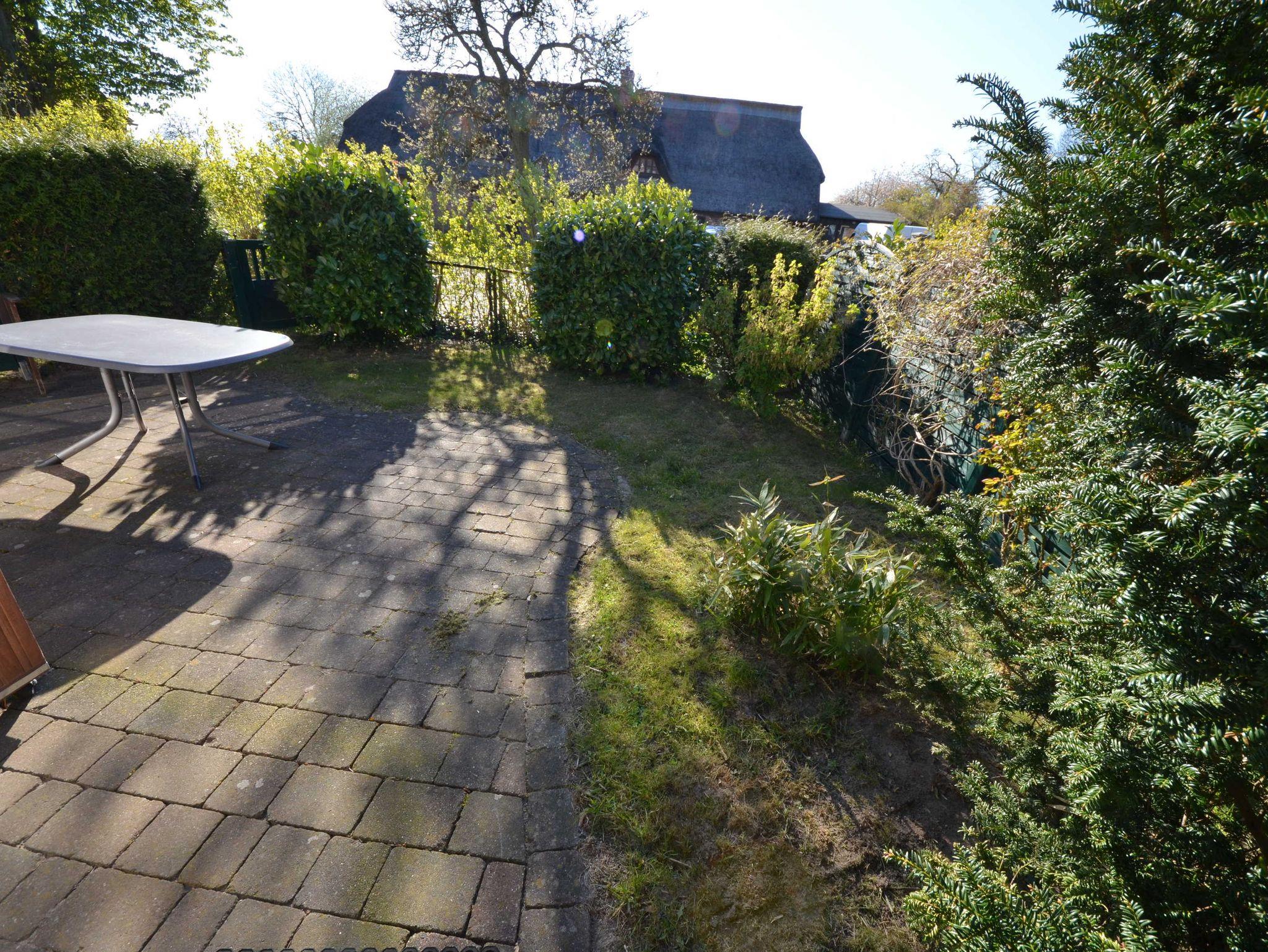 Das Haus hat eine Terrasse mit Gartenmöbeln, eigenem Gartenteil, Doppelstrandkorb