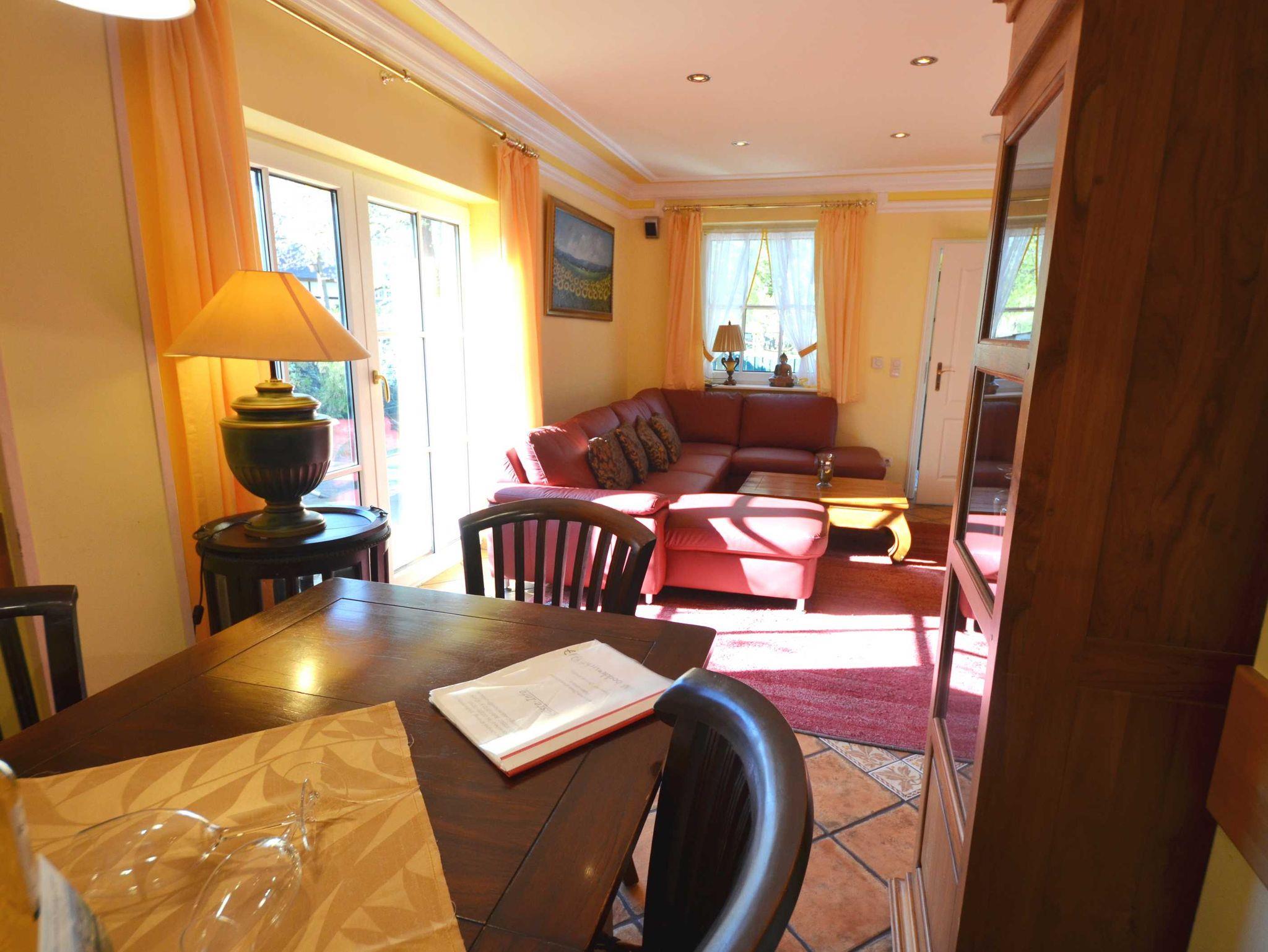 2 Bäder, Fußbodenheizung, schön eingerichtetes Wohn- Esszimmer, Couchgarnitur mit Leder bezogen, Opiumtisch, Speisetafel mit Stühlen, Geschirrschrank, Sat - TV, Telefon, Spiegel pp.