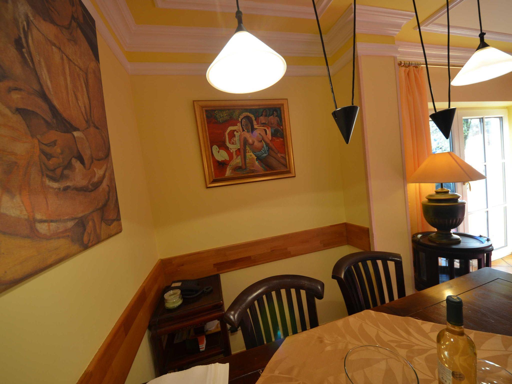 Kinderhochstuhl, Wände dekoriert mit Bildern, Ausgang zur Terrasse