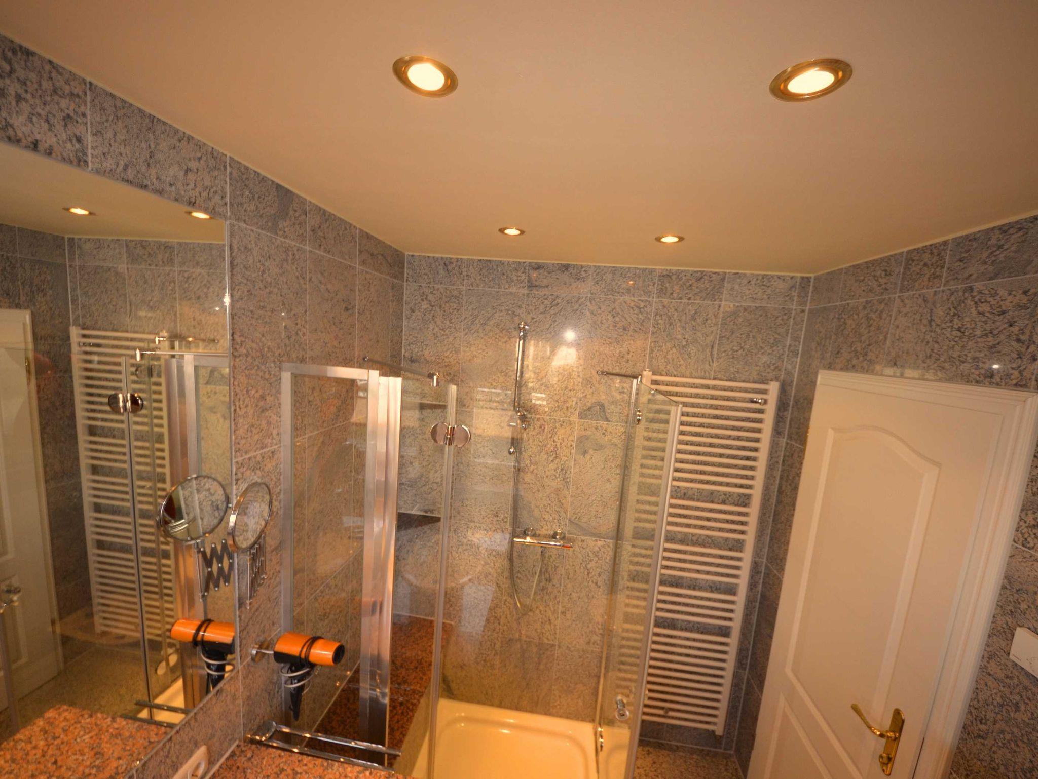 mit Granitabdeckungen, beheizbarer Handtuchhalter, Fön, Schminkspiegel, dekorative Beleuchtung.