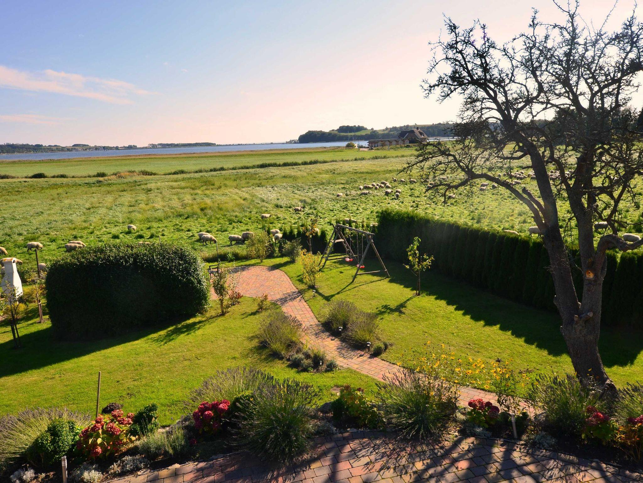 im EG jeweils eine große 80 m² Süd-Terrasse. Im OG schöner Balkon und Garten mit Obstbäumen zum Meer mit Gartenmöbel, Außengrill und Kinderschaukel. Der Garten kann von der Ferienwohnung im EG und OG genutzt werden.