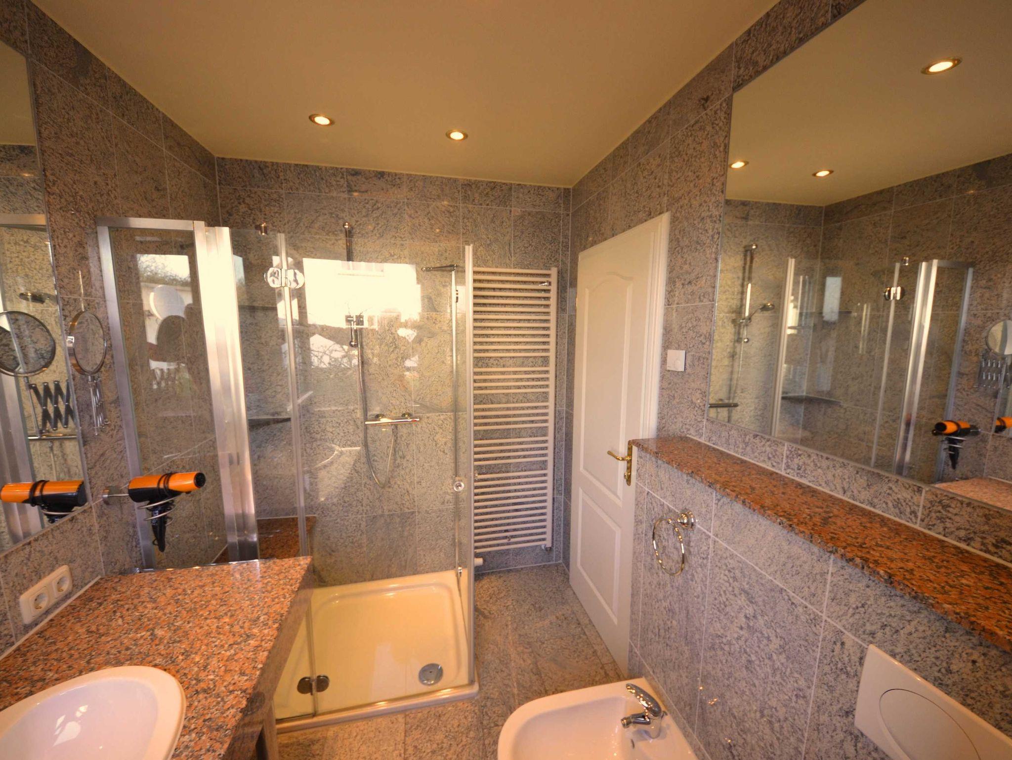 Glas-Dusche mit Sitzbank aus Granit, Fußbodenheizung, Granitabdeckungen, große Spiegel, schöne Sanitärausstattung: Toilette und Bidet, Einbauwaschbecken