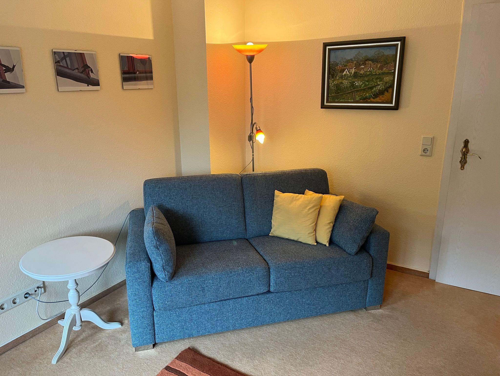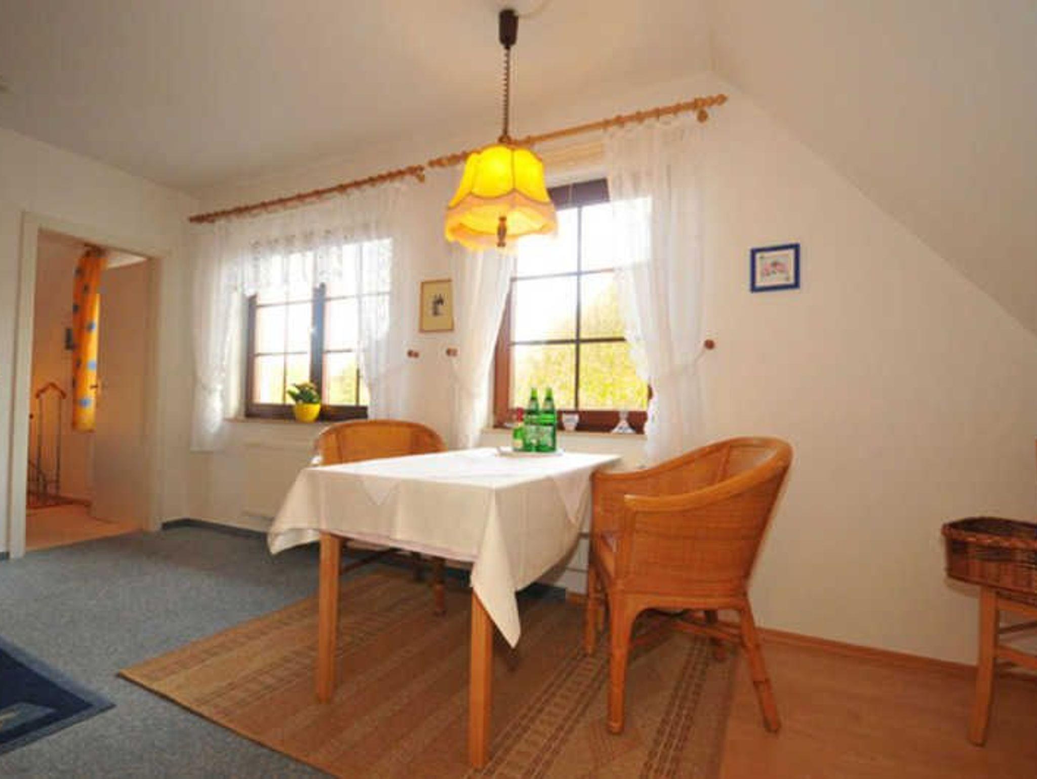 Die Ferienwohnung befindet sich im Obergeschoß und besteht aus einem Wohnraum mit Sitzgruppe und TV sowie einem Schlafraum mit einem Doppelbett. Die Ferienwohnung verfügt zudem über ein Duschbad und eine moderne Küchenzeile. Auf dem großen Grundstück steht Ihnen eine Liege und Spielwiese sowie ein Grillplatz zur Verfügung.