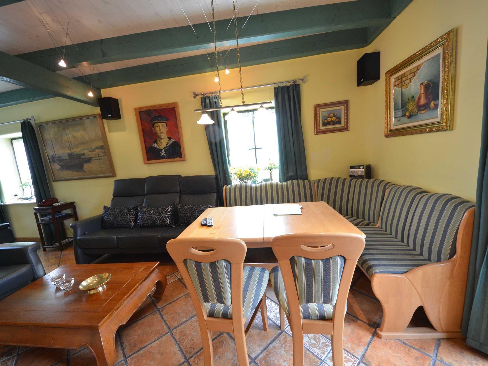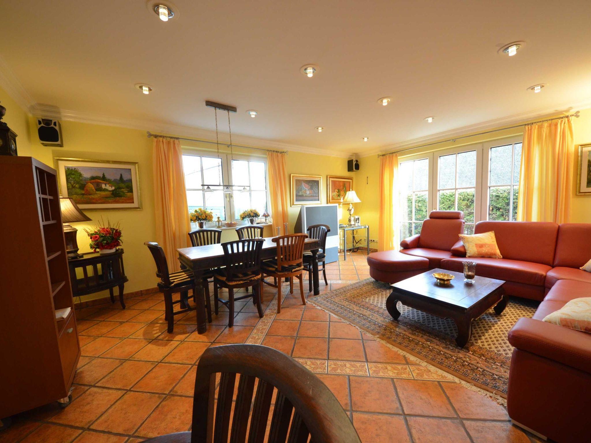 Erdgeschoss: Eingangsflur mit Garderobe und Schuhschrank, Fußbodenheizung, schön eingerichtetes Wohn- Esszimmer, Leder - Couchgarnitur, Opiumtisch, Speisetafel mit Stühlen, Geschirrschrank, Sat - TV, Telefon, Spiegel pp. Babybett und Hochstuhl.