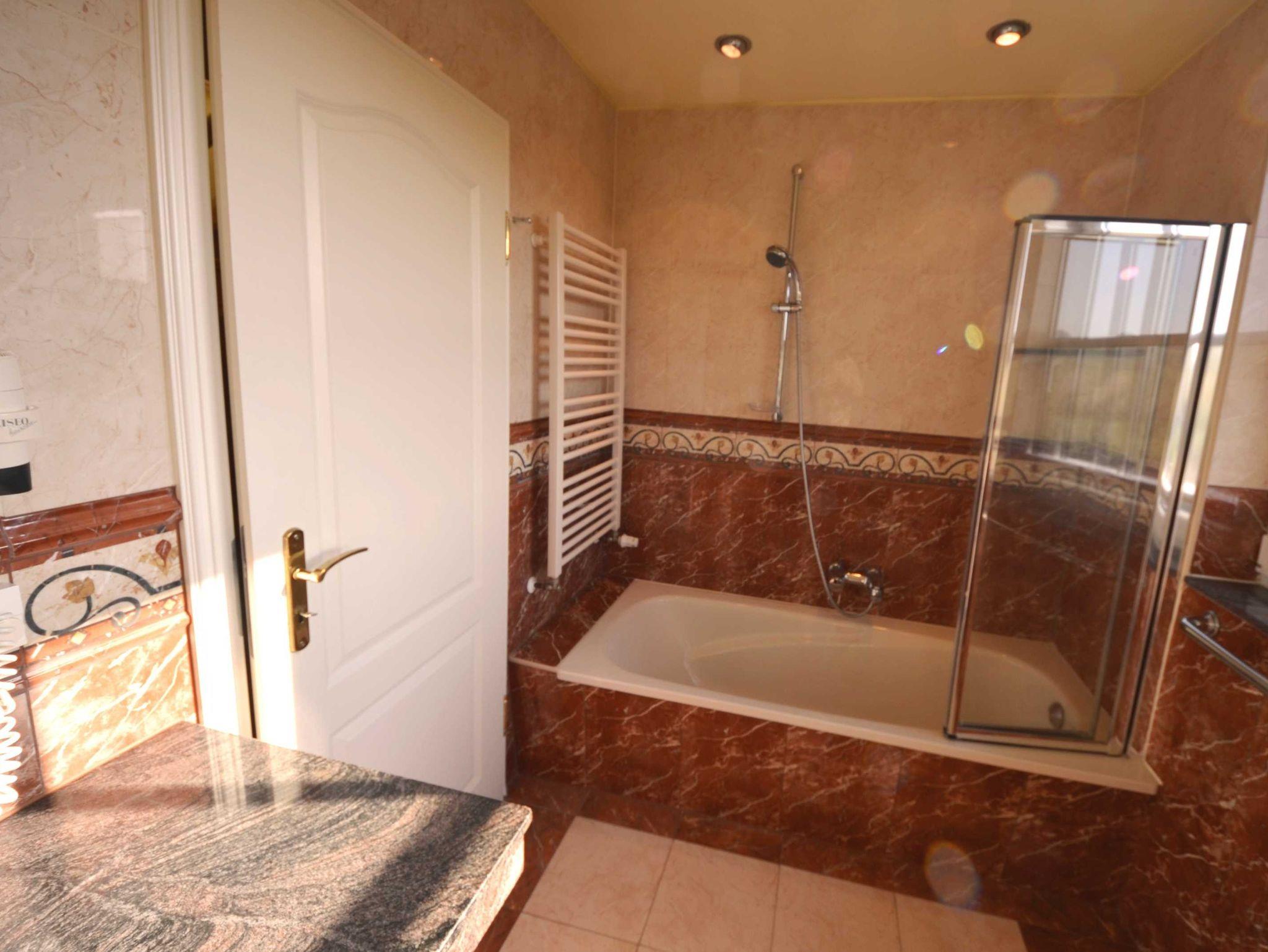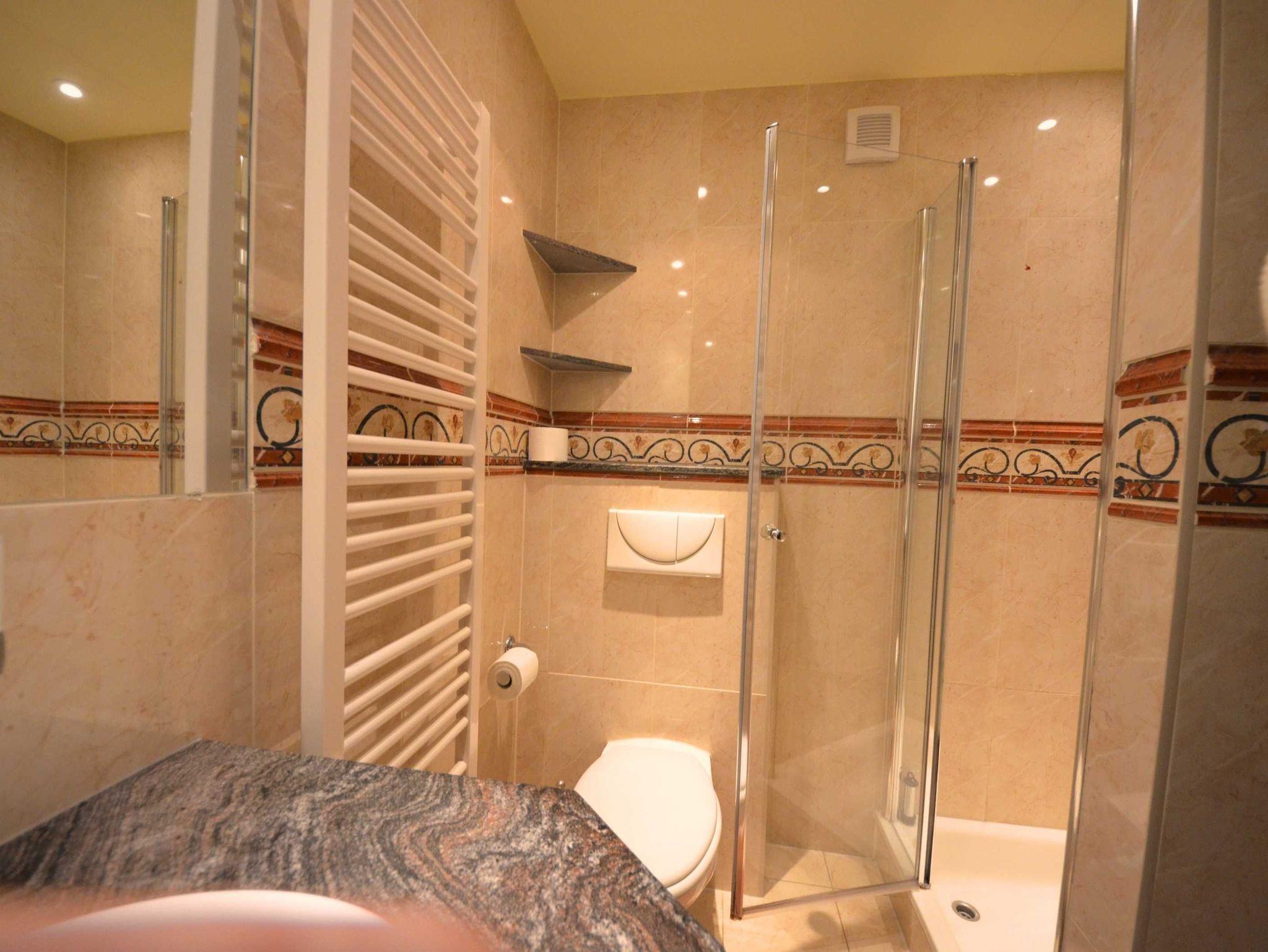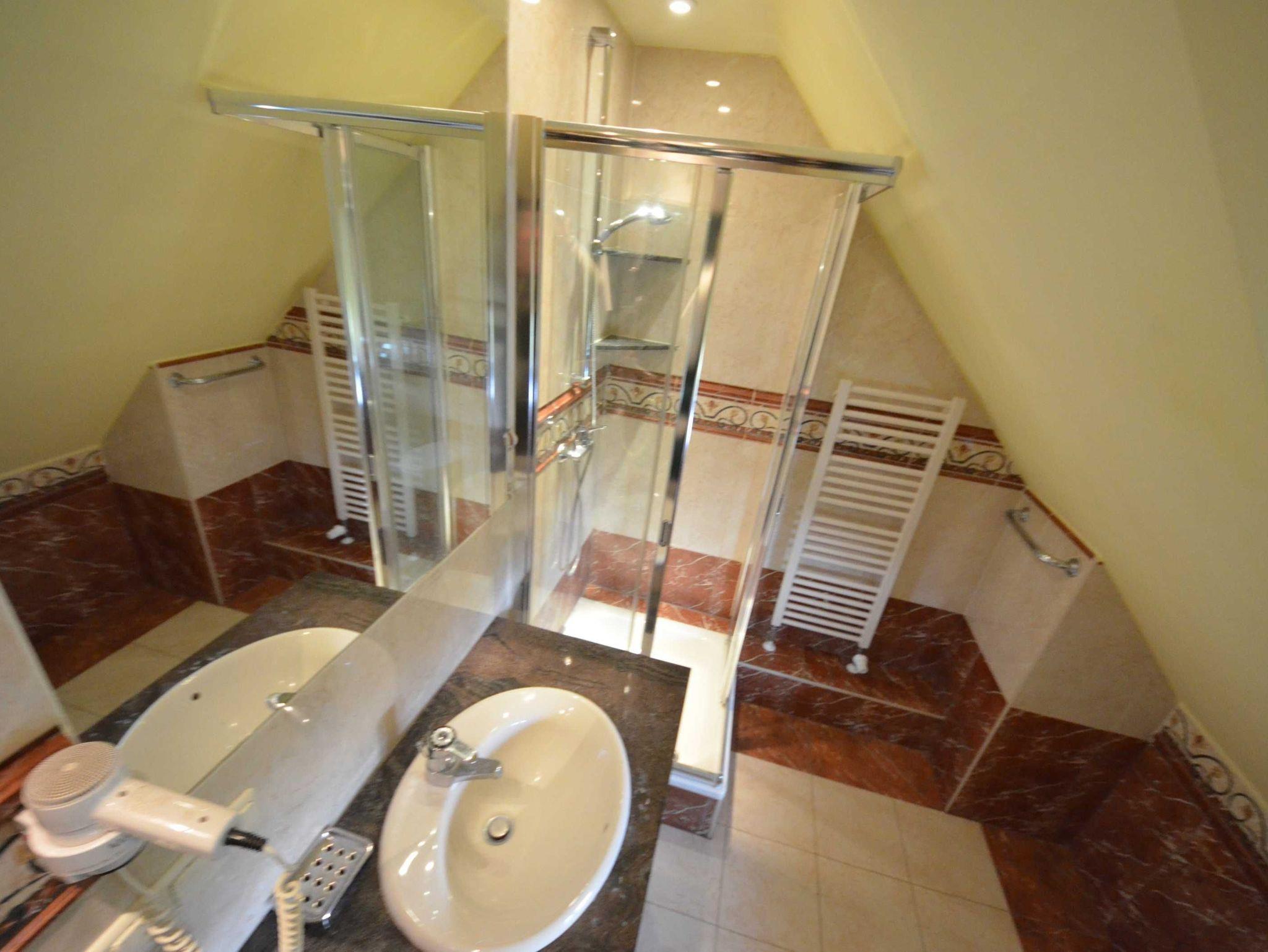 Naturstein, große Spiegel, schöne Sanitärausstattung beheizbarer Handtuchhalter, Fön, Schminkspiegel