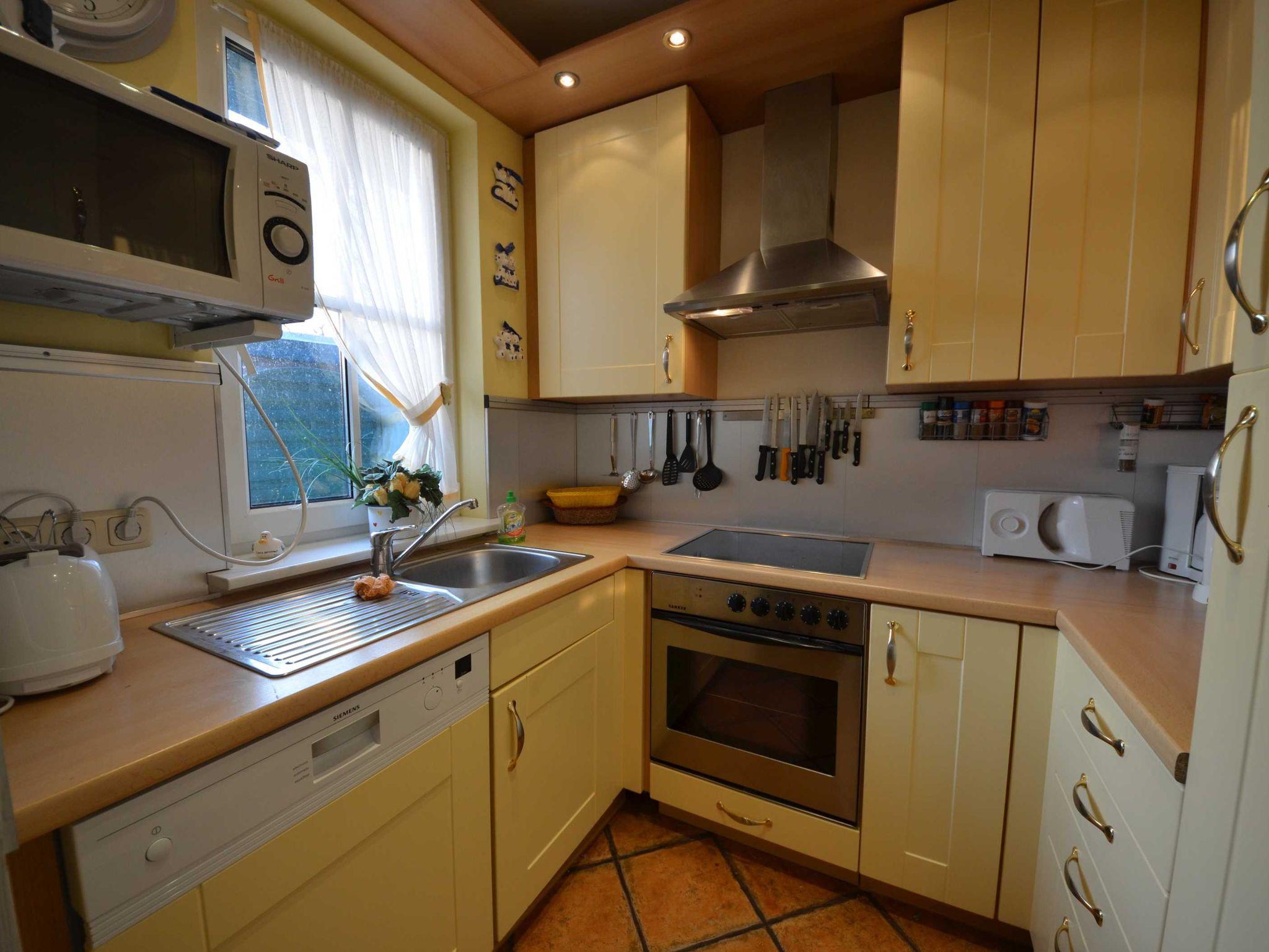 Fußbodenheizung, moderne Einbau-Landhausküche in arktisgelb, Geschirrspüler, Mikrowelle, Herd mit Ceran - Kochfeld Turmhaube und Backofen, Kühlschrank mit Gefrierteil,