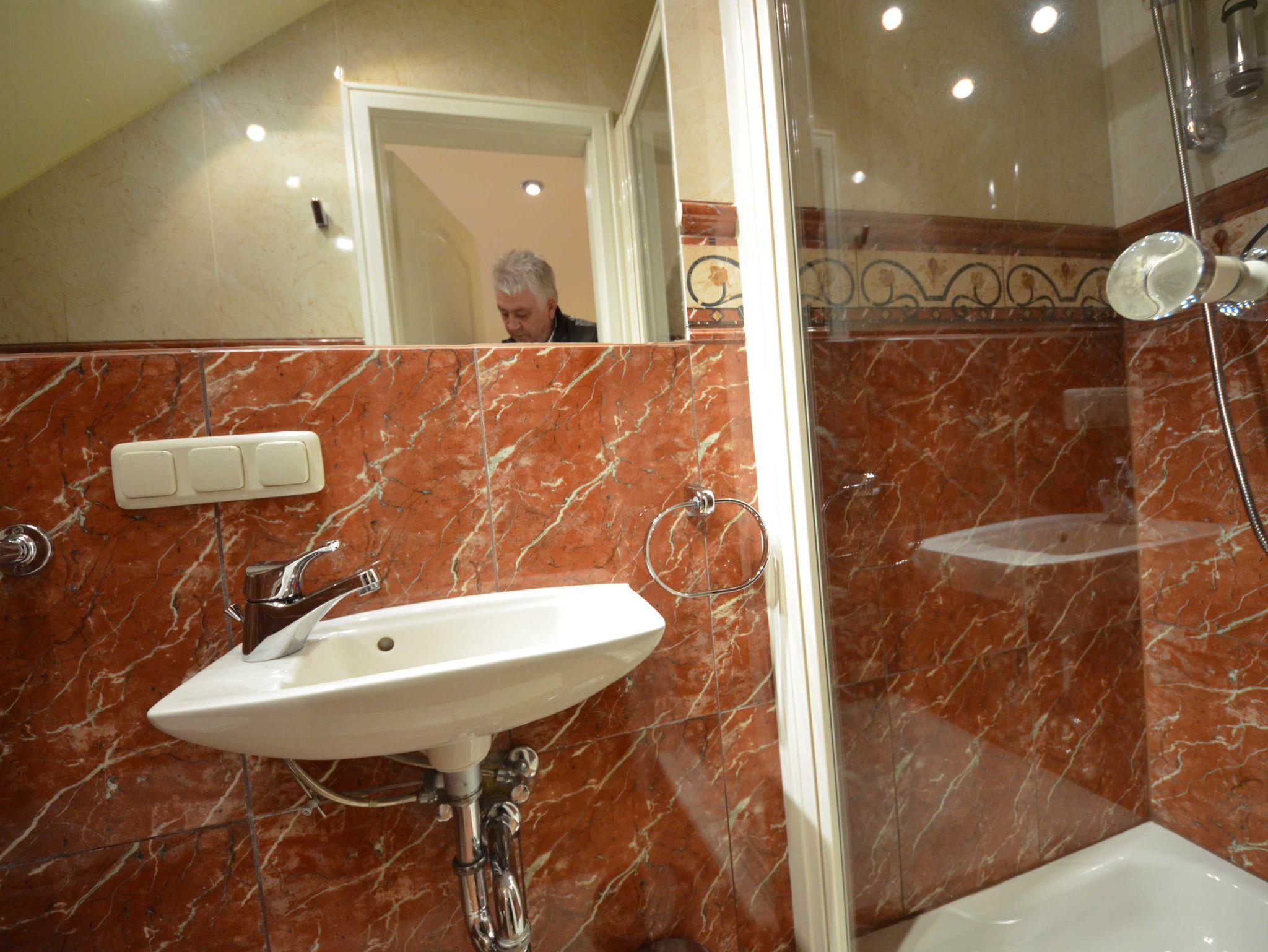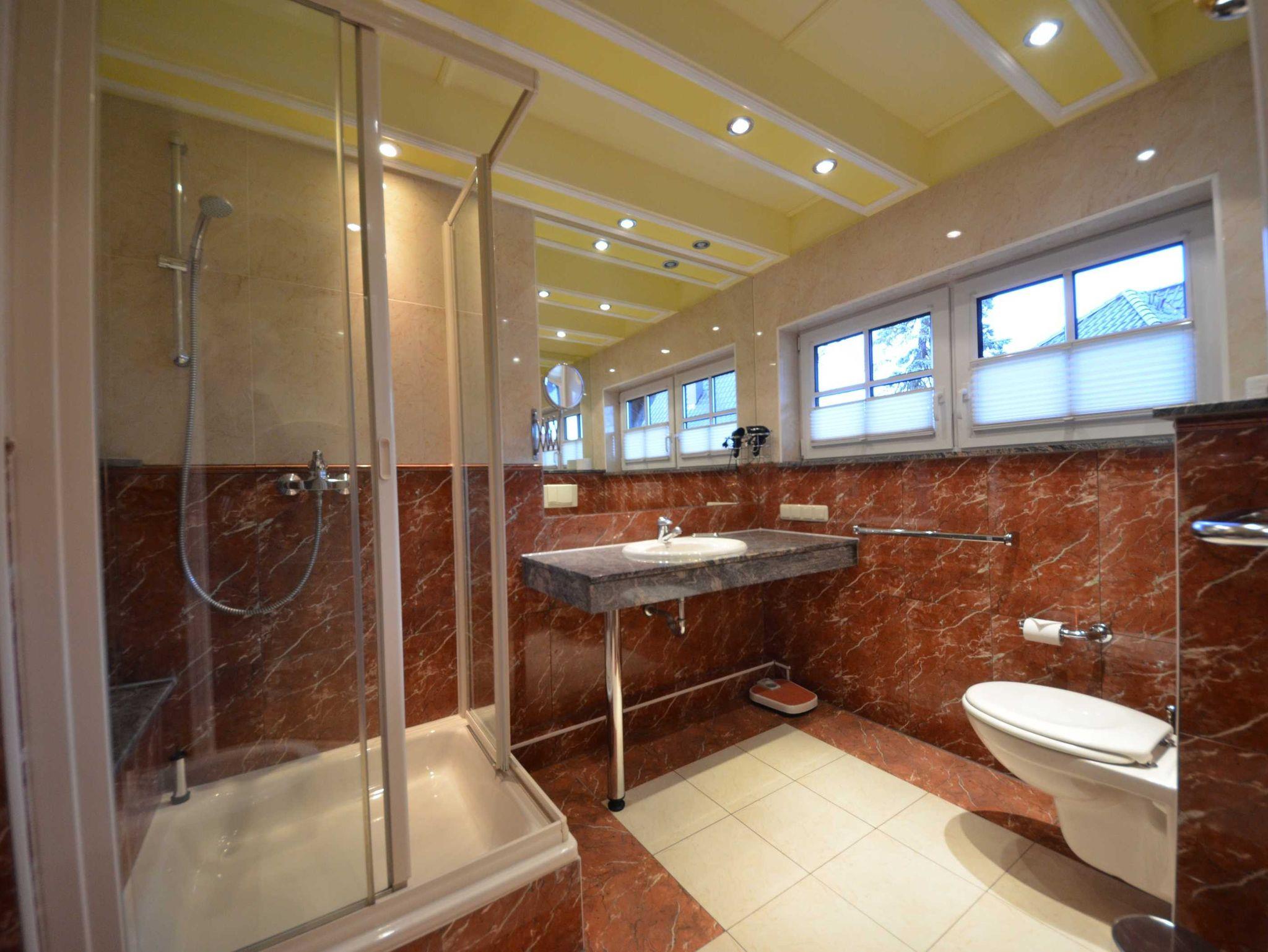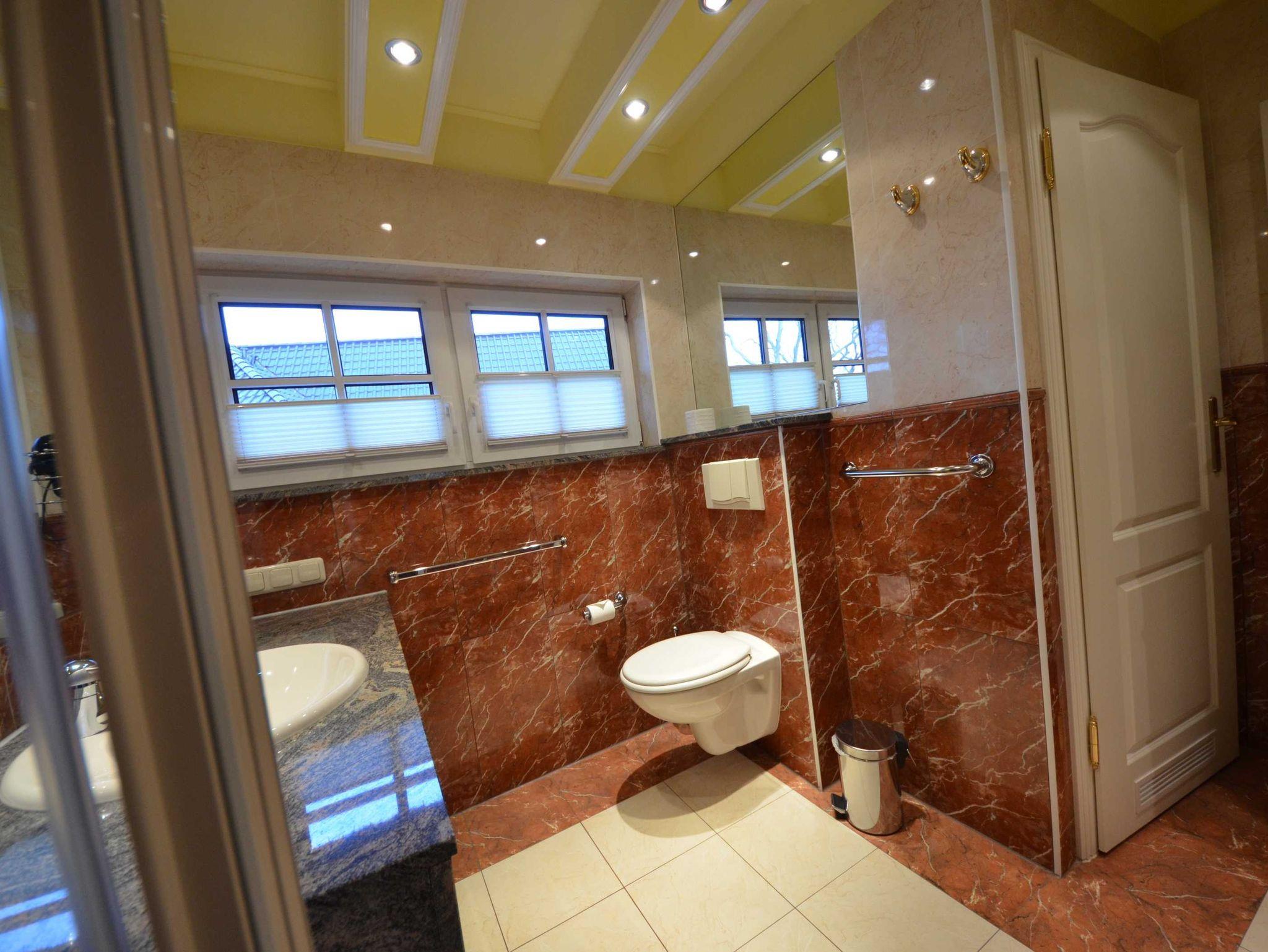 Fußbodenheizung, Naturstein - Abdeckungen, große Spiegel, schöne