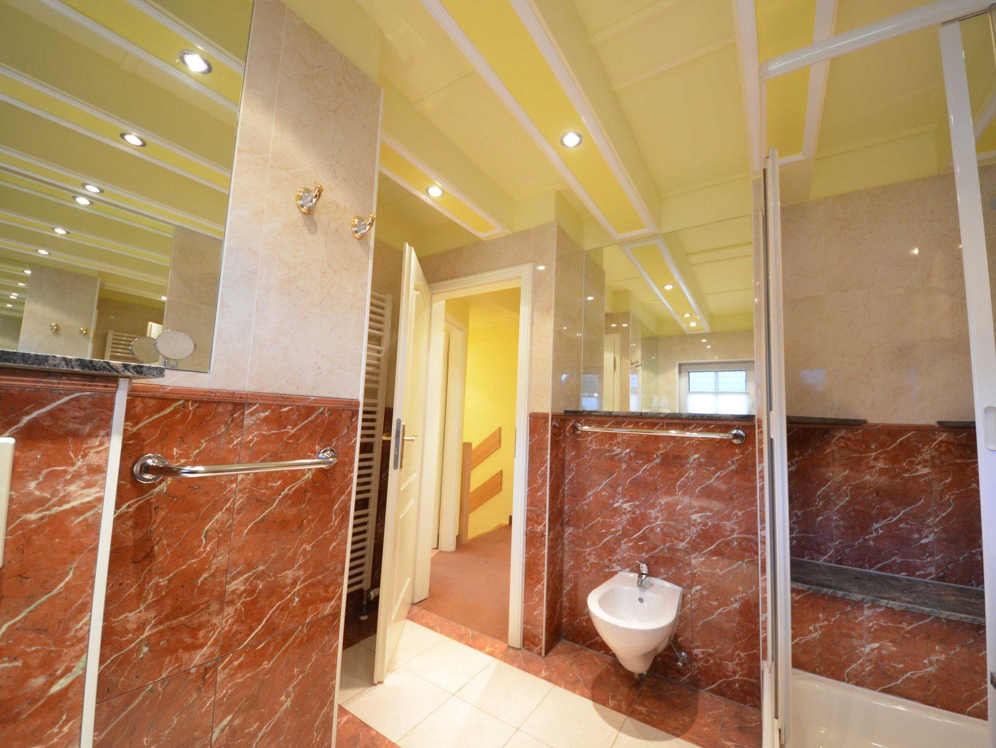 Badezimmer mit Fußbodenheizung, Natursteinverkleidung, große Spiegel, schöne Sanitärausstattung,beheizbarer Handtuchhalter,Bidet, Fön, Schminkspiegel, Glas-Dusche