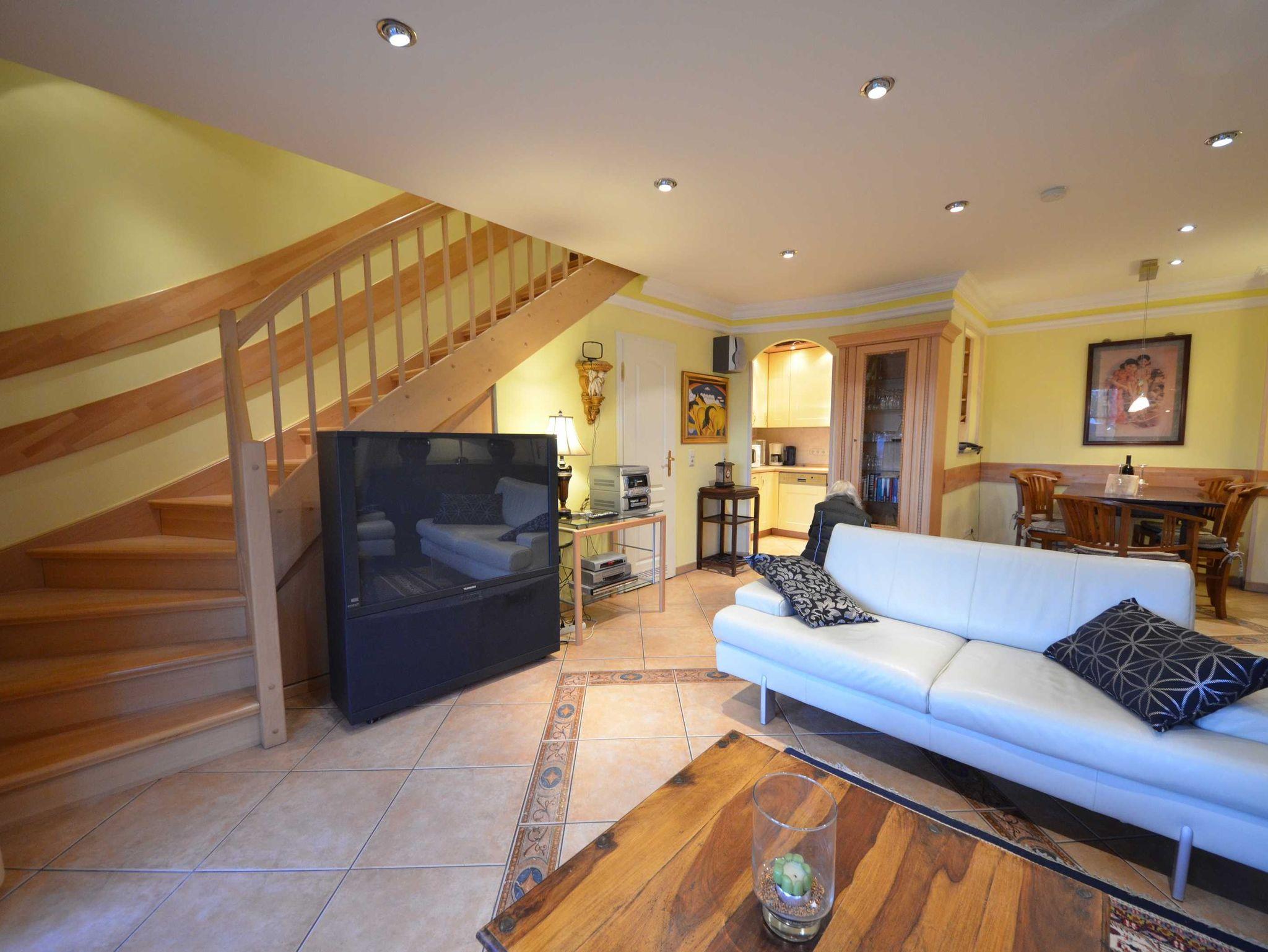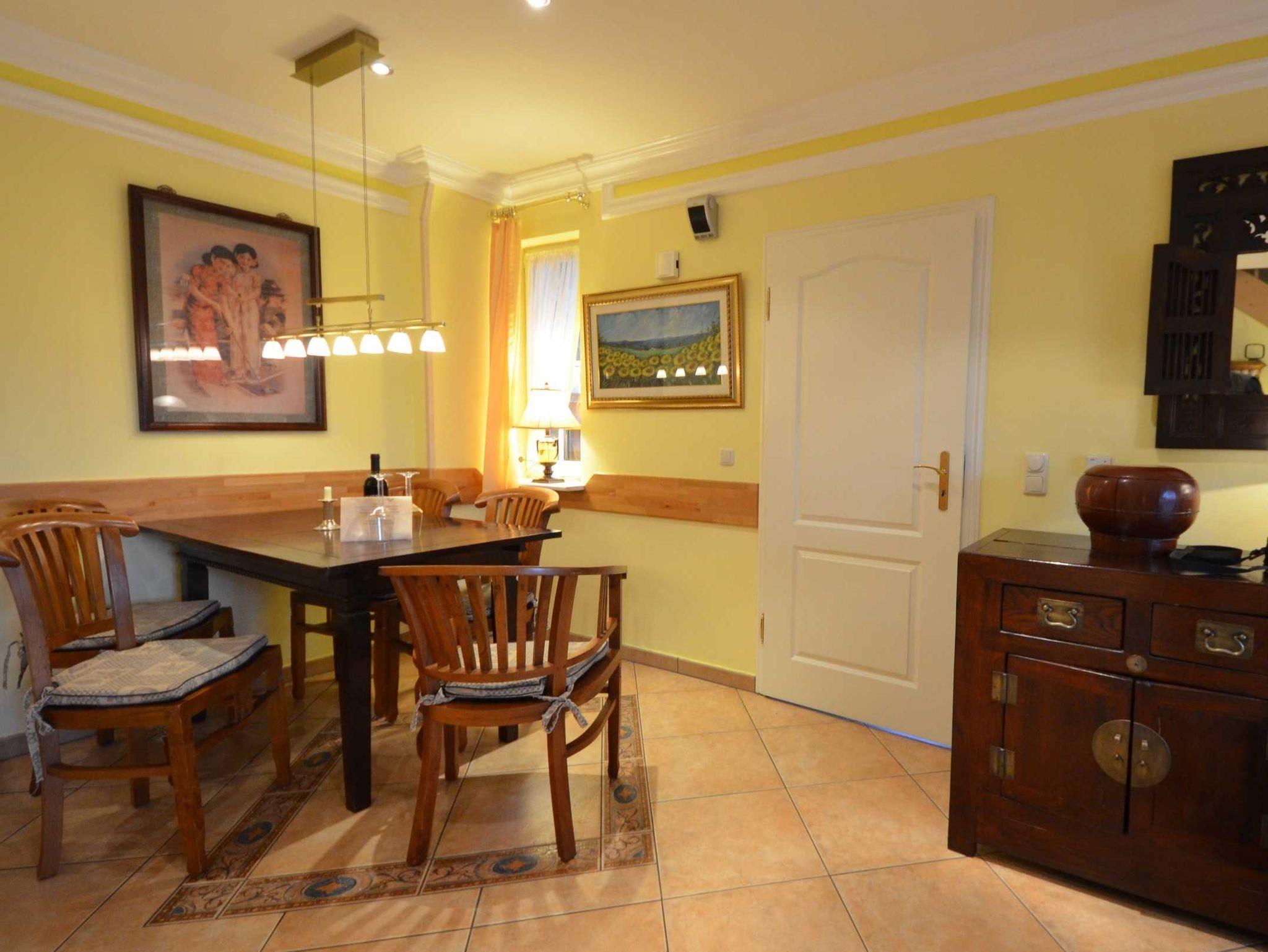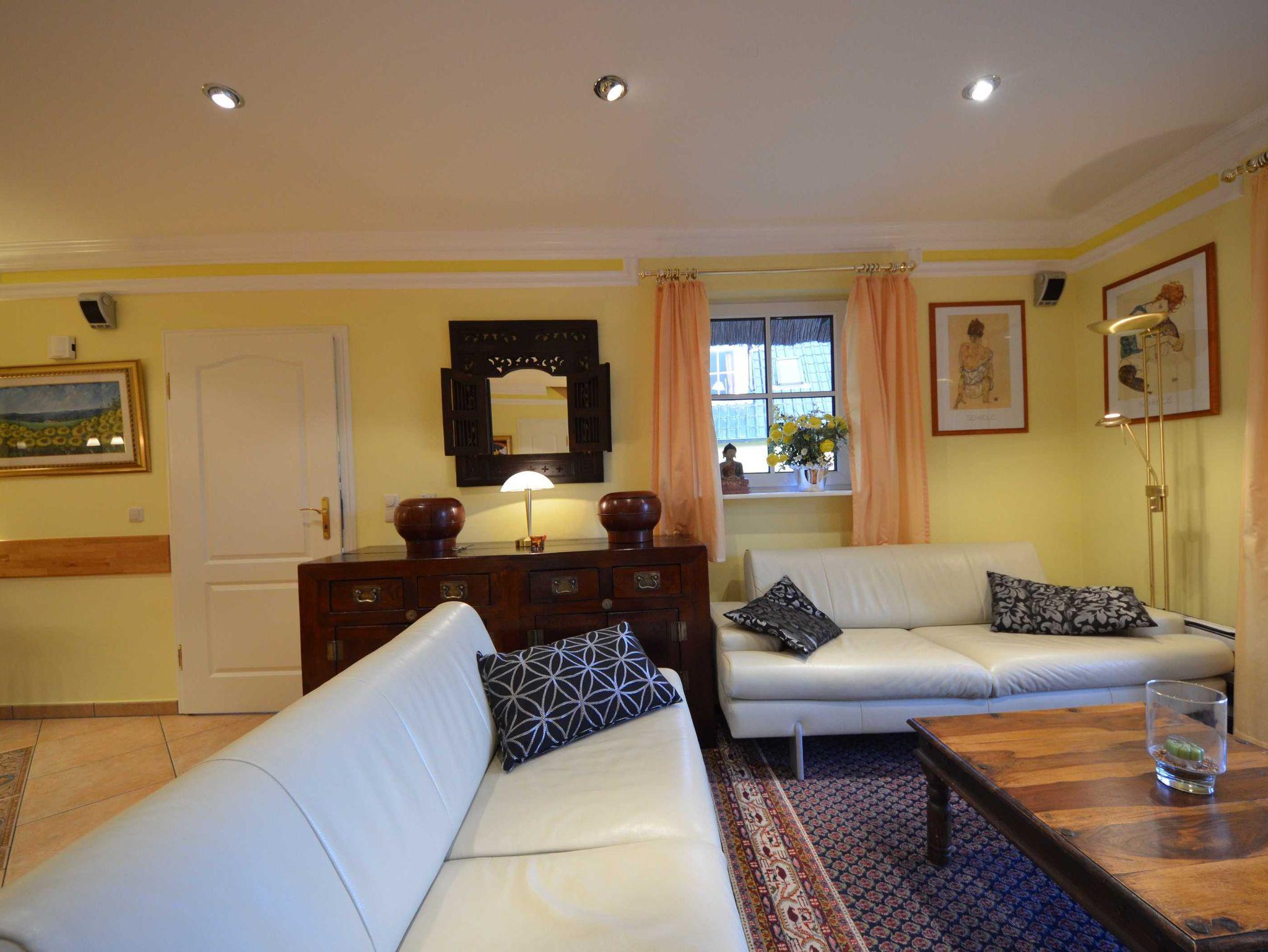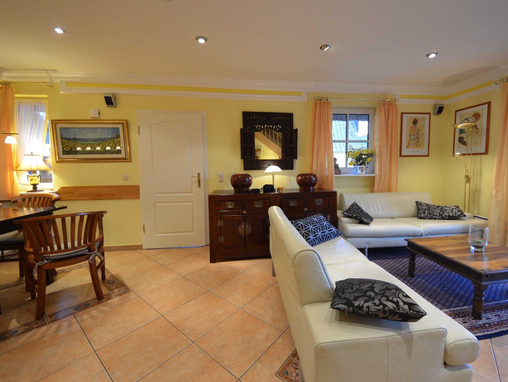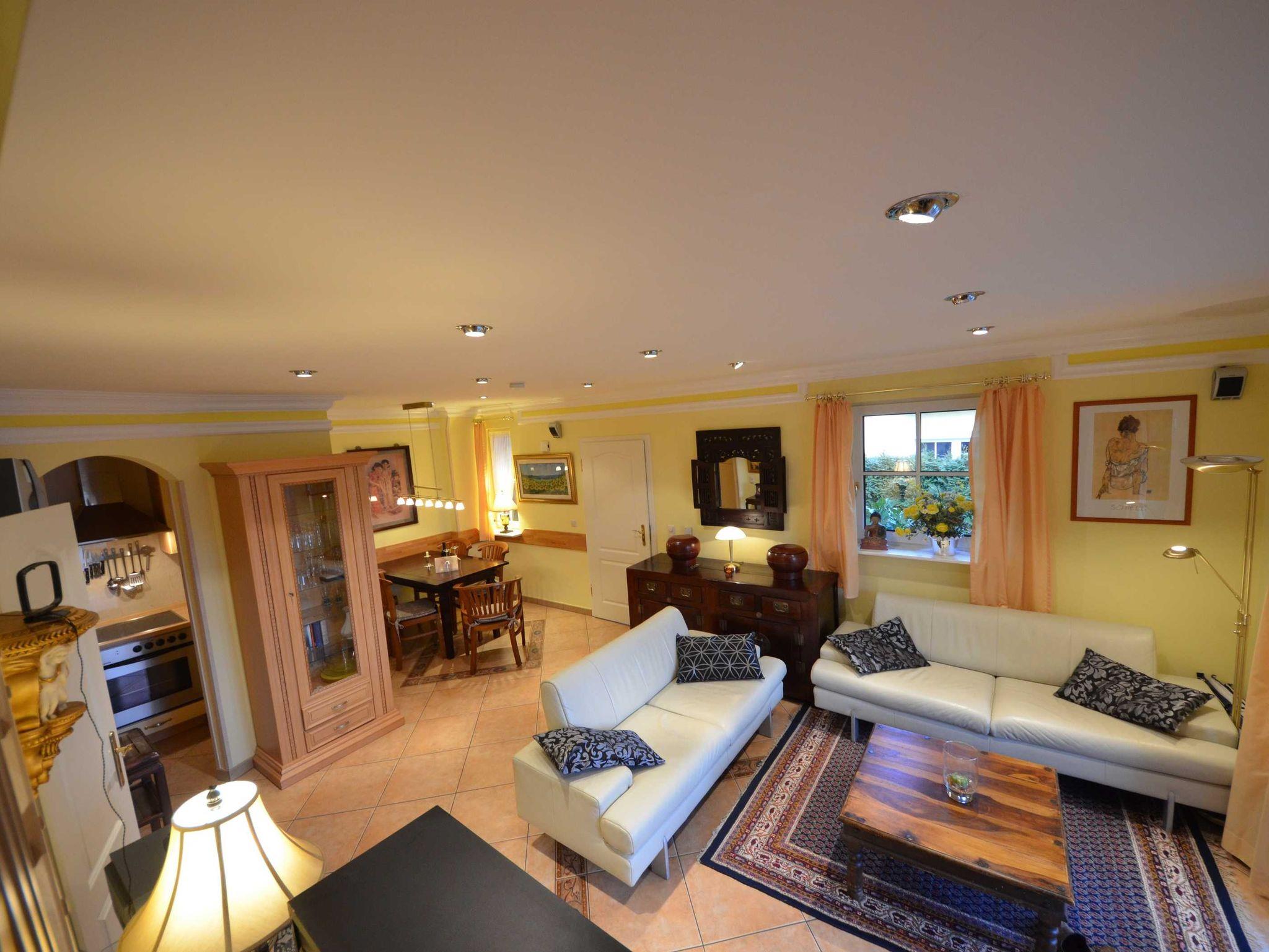 2 Bäder, Fußbodenheizung, schön eingerichtetes Wohn- Esszimmer, Couchgarnitur mit Leder bezogen, Opiumtisch, Speisetafel mit Stühlen, Geschirrschrank, Sat - TV, Telefon, Spiegel pp.