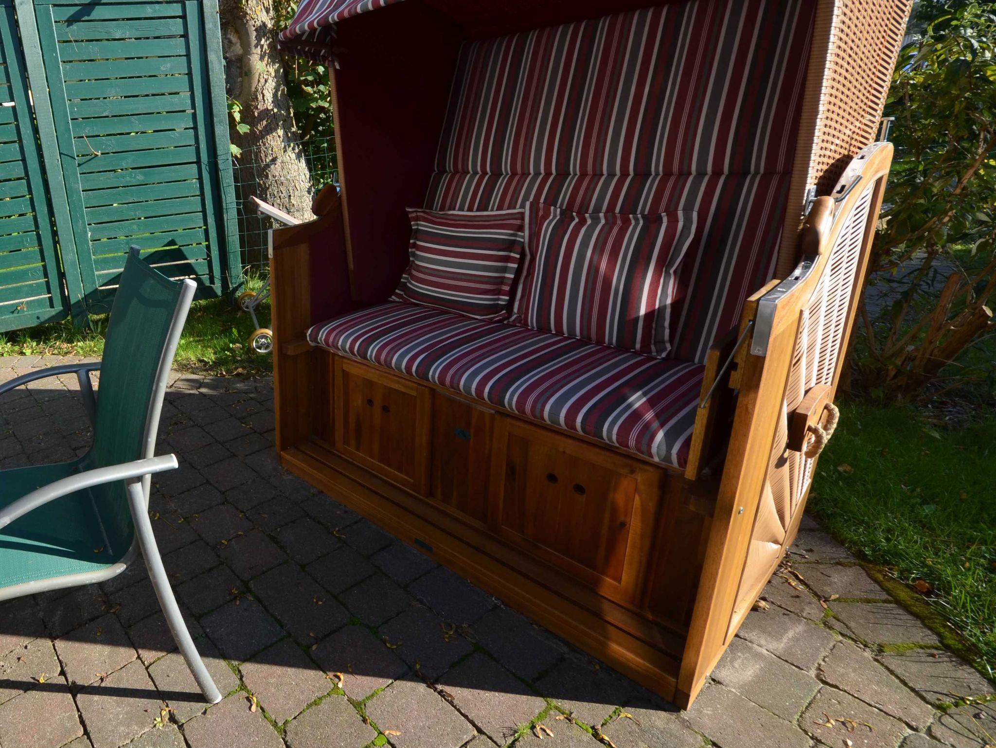 Terrasse: kleiner Gartenteil mit Gartenmöbeln, teilweise Strandkorb