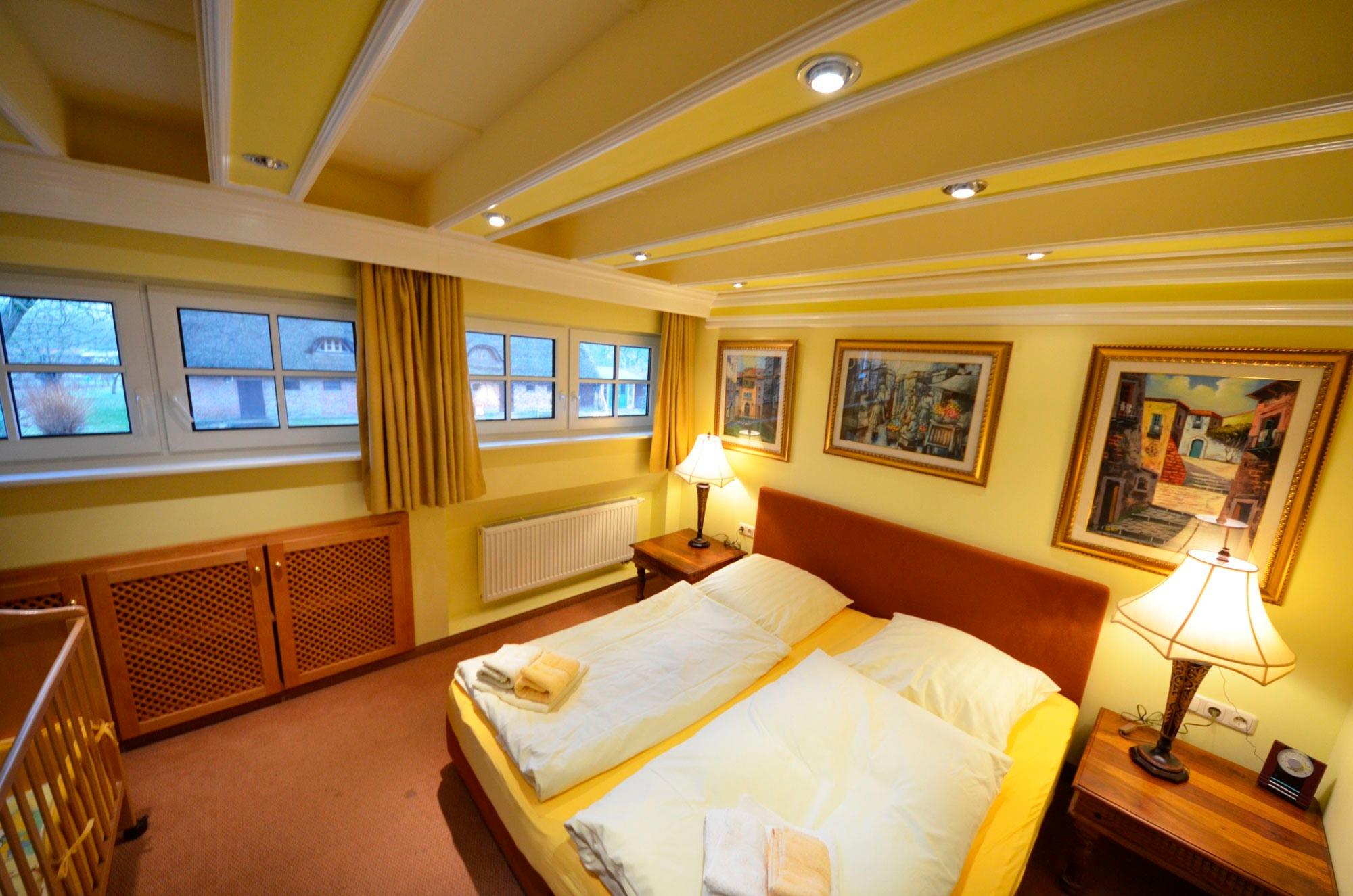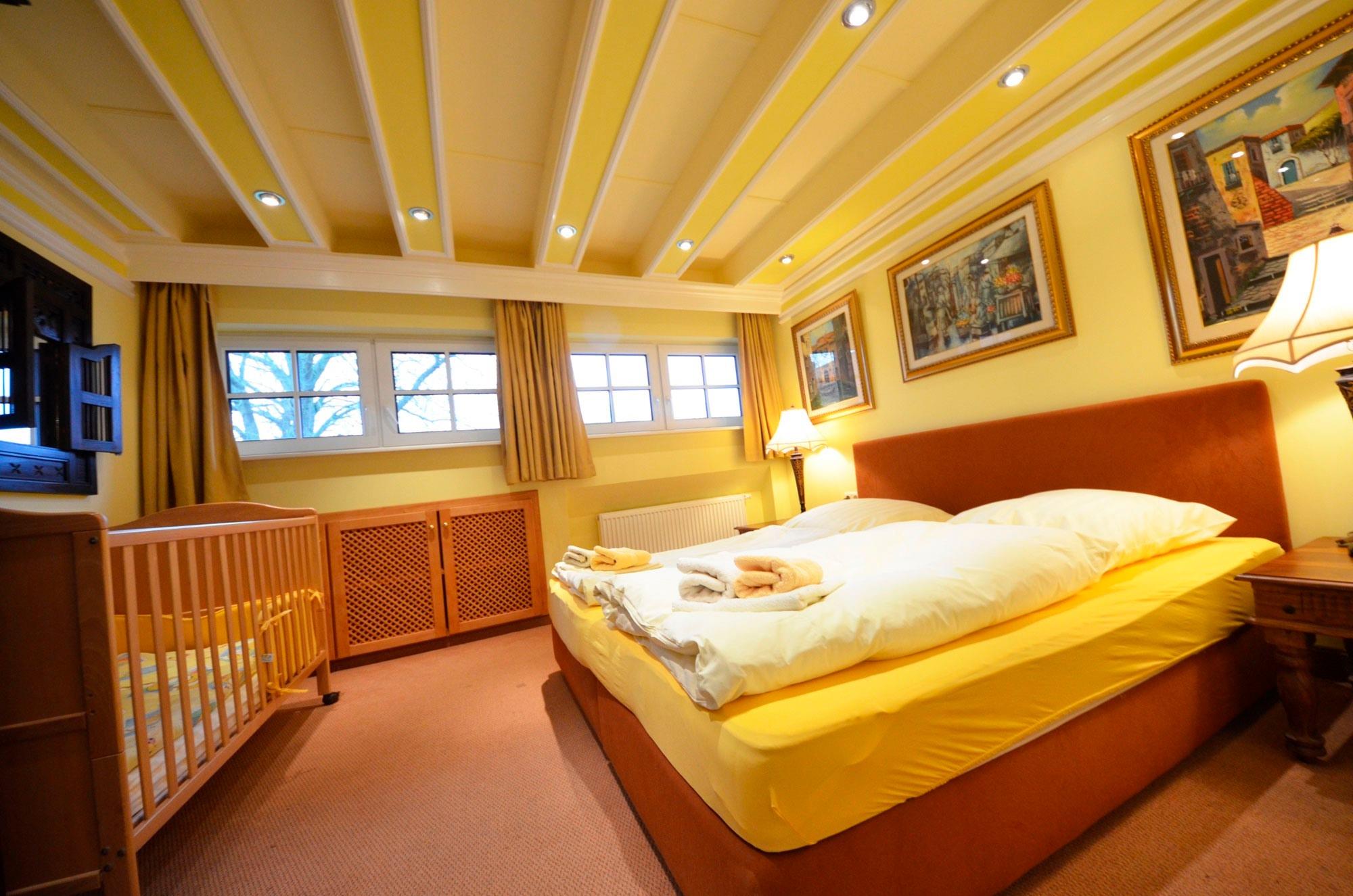 Doppelbetten jeweils 160x200 und 180x200, mit aufgezogener Bettwäsche. Radiowecker, mit Bildern dekoriert. Große Ganzkörperspiegel. Schlafzimmer ein Babybett 70x140 (kostenlos) mit aufgezogener Bettwäsche.