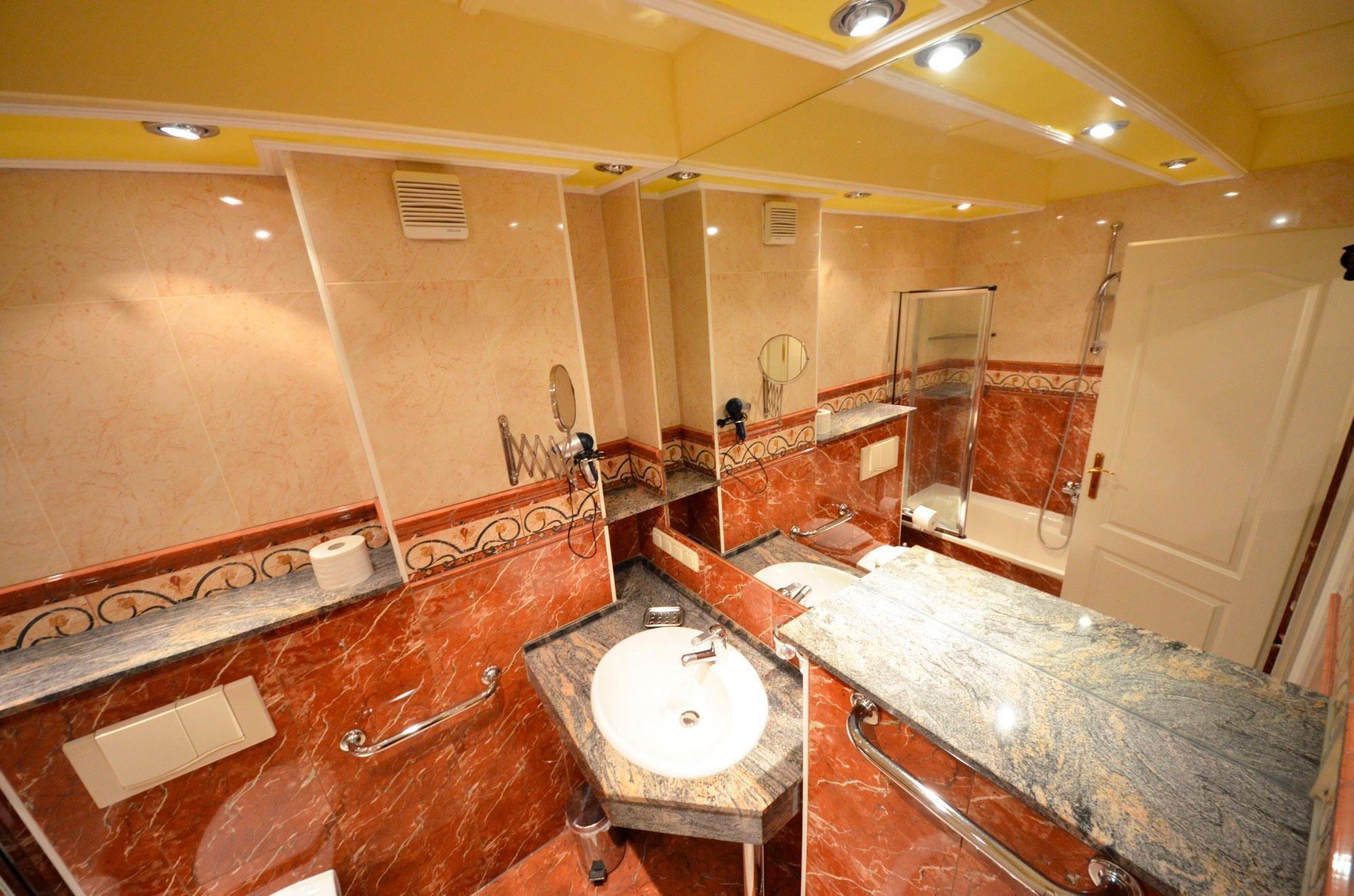 Zweites Badezimmer mit Fußbodenheizung, Naturstein-Abdeckungen, große Spiegel, schöne Sanitärausstattung, Einbau Waschbecken mit Granit - Abdeckungen, beheizbarer Handtuchhalter, Fön, Schminkspiegel, Dusche in der Wanne mit Dusch-Trennwand.