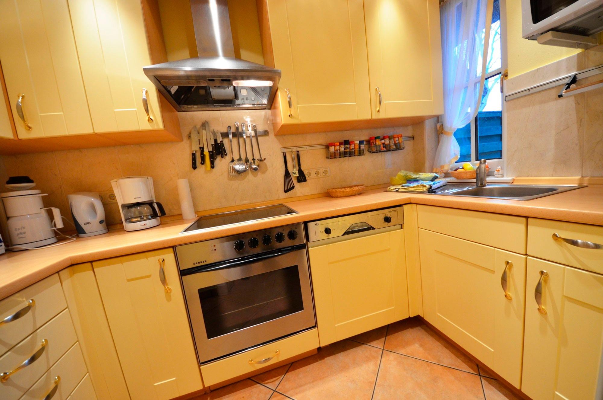 Fußbodenheizung, schöne moderne Einbauküche in arktisgelb, Geschirrspüler höher gelegt, Mikrowelle, Herd mit Ceran-Kochfeld und Backofen, Kühlschrank mit Gefrierteil, Turmhaube, 2 Kaffeemaschinen, Wasserkocher, Eierkocher, Toaster, Waffeleisen, Mixer, ausreichend Edelstahl-Töpfe Schnellkochtopf Gewürze usw.