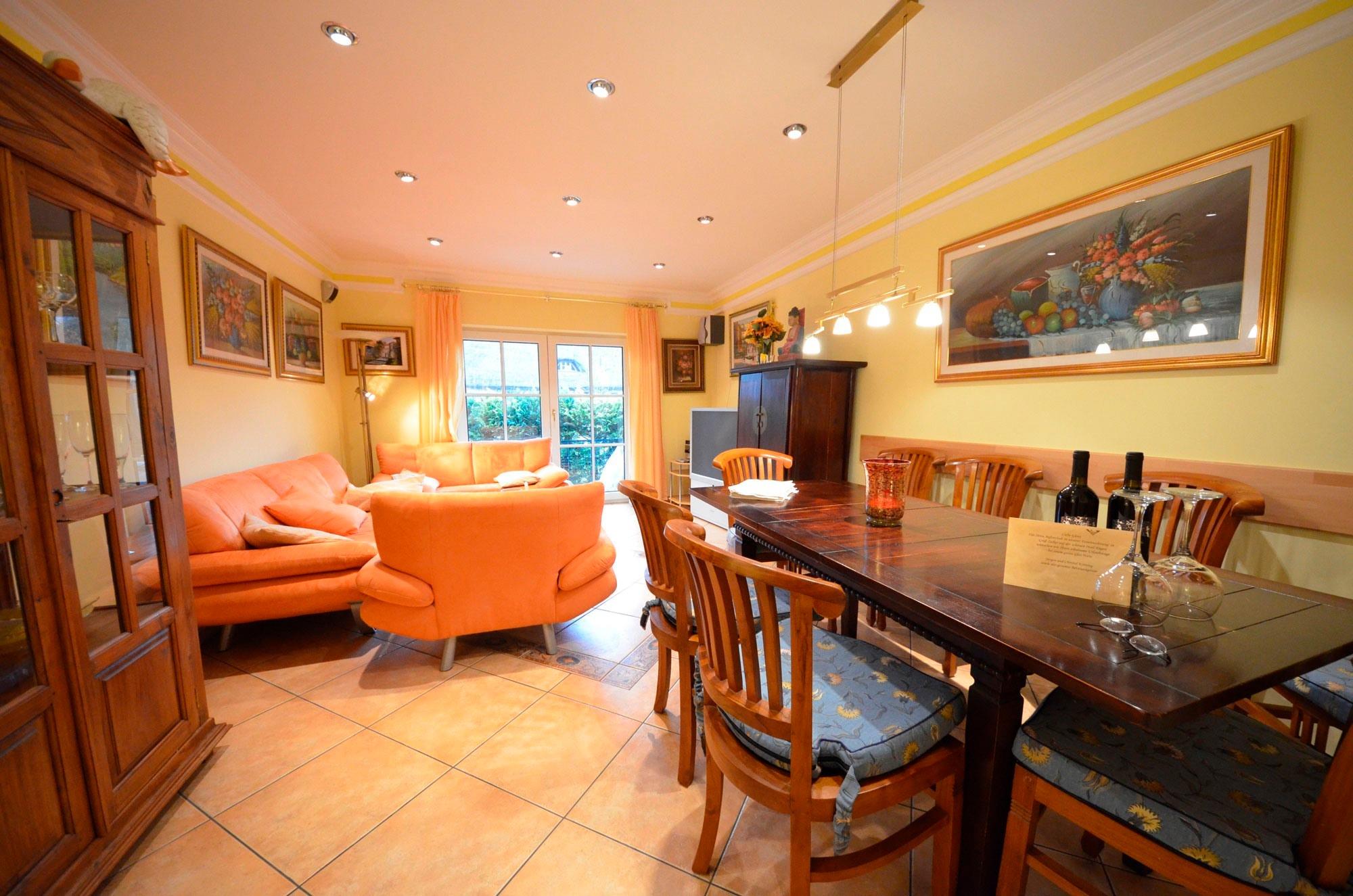 Wohn- Esszimmer mit Ausgang zur Terrasse mit Gartenmöbeln, schöne Couch-Garnitur und Opiumtisch, Telefon, 120er-Flachbild-TV, Stereo/CD, Speisetafel mit 8 Stühlen, Geschirrschrank