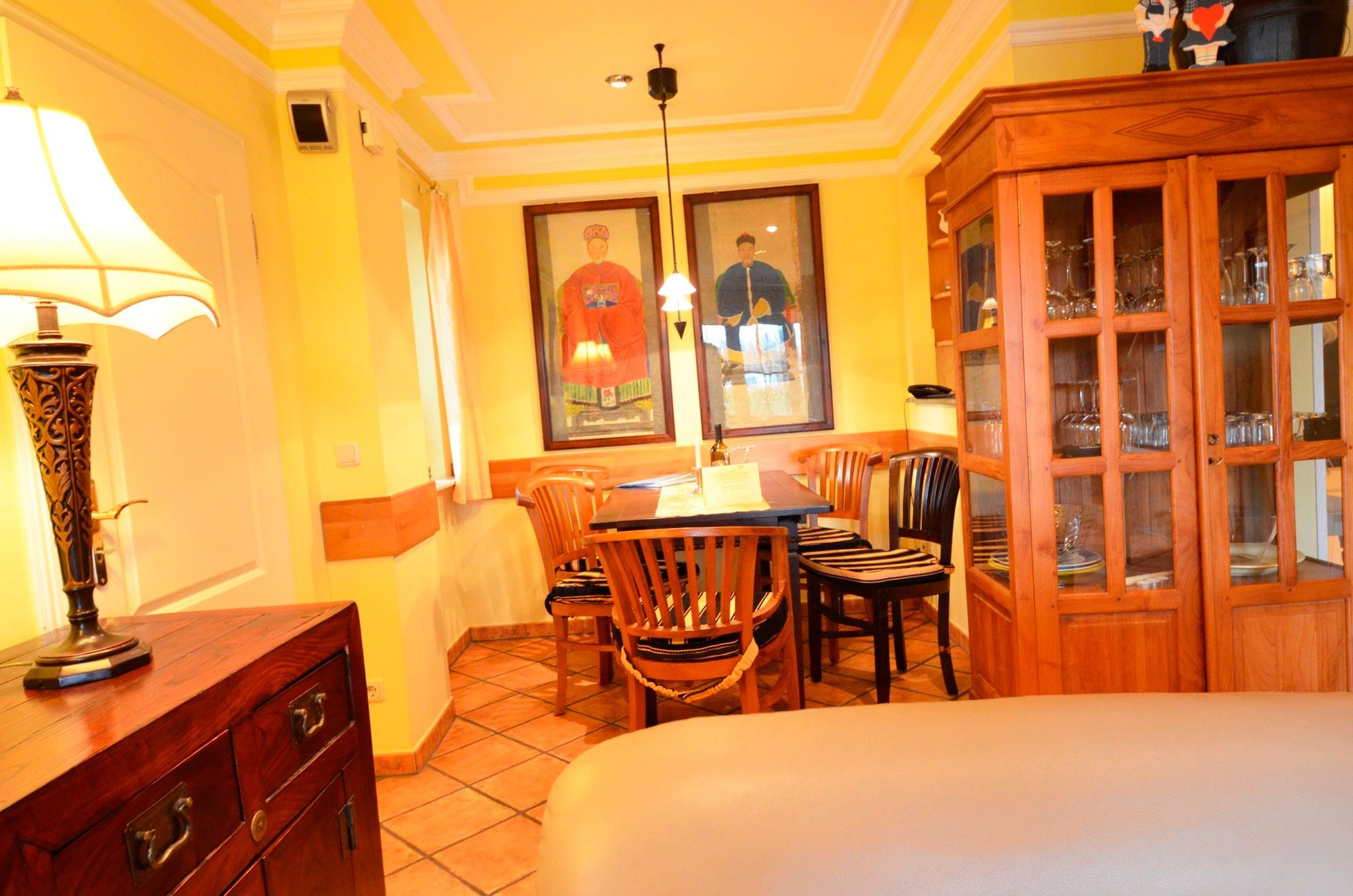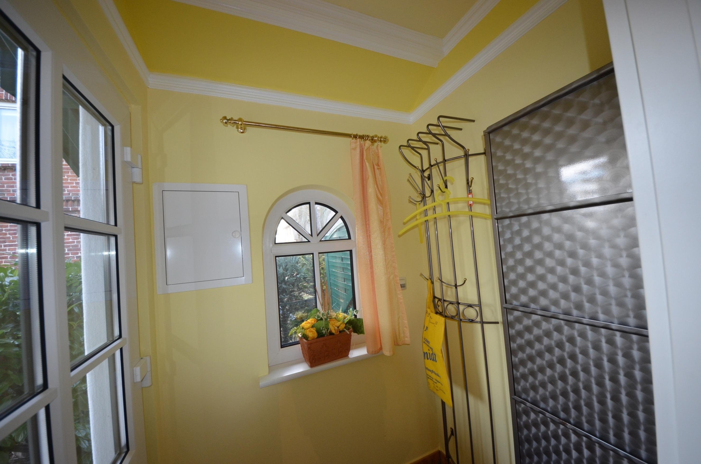 Eingangsflur mit Garderobe und Schuhschrank, Fußbodenheizung, großzügiges Wohn- Esszimmer, schöne Couchgarnitur mit Opiumtisch, Esstisch mit 5 Stühlen, Geschirrschrank, Satt - TV mit 82-106 cm! Großbild mit ca.40 Programmen, Stereoanlage, CD - Player, Telefontisch mit Telefon und balinesischem Spiegel pp.