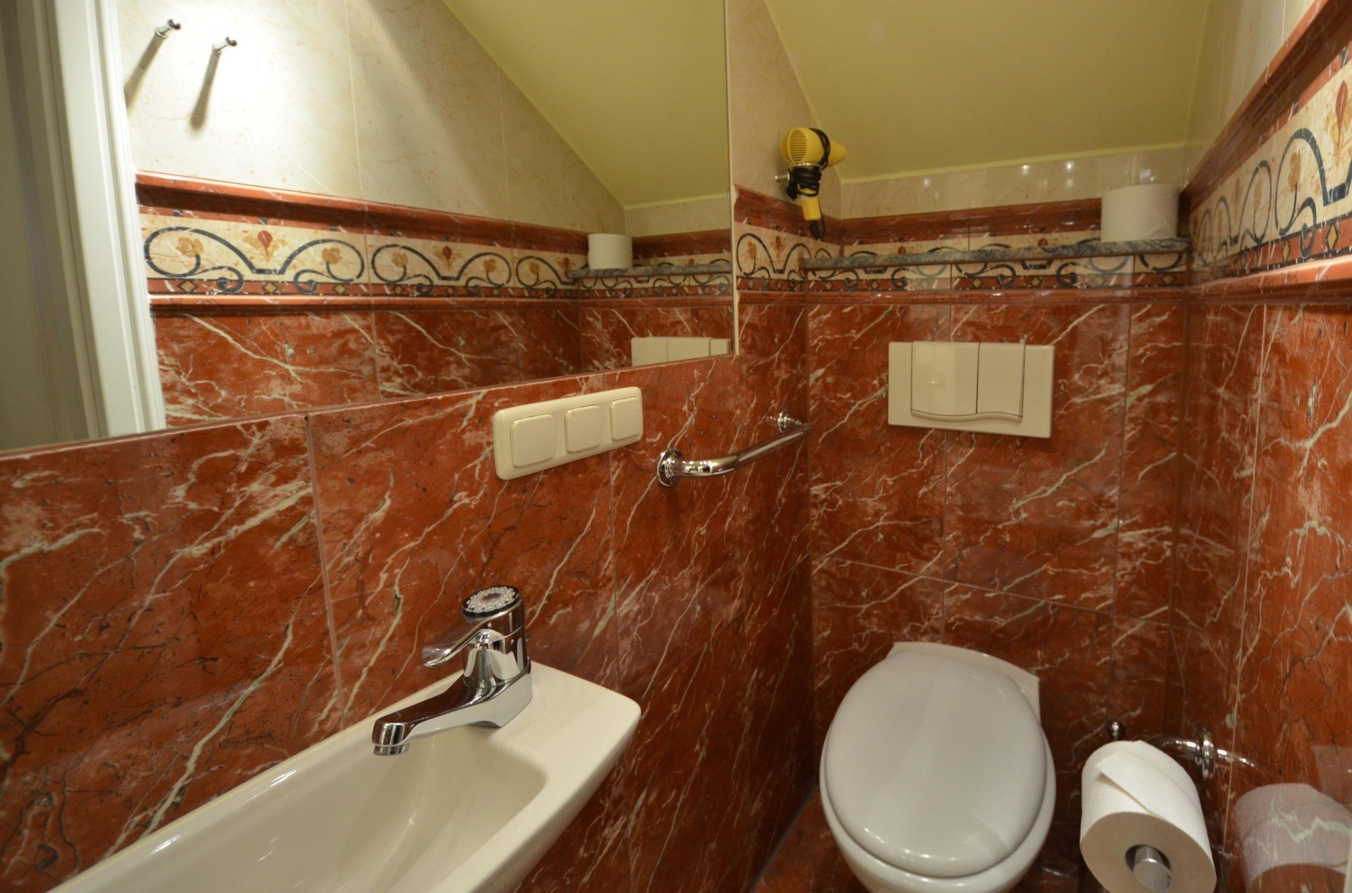 Glasdusche, Toilette, Fußbodenheizung, Fön, kleines Waschbecken
