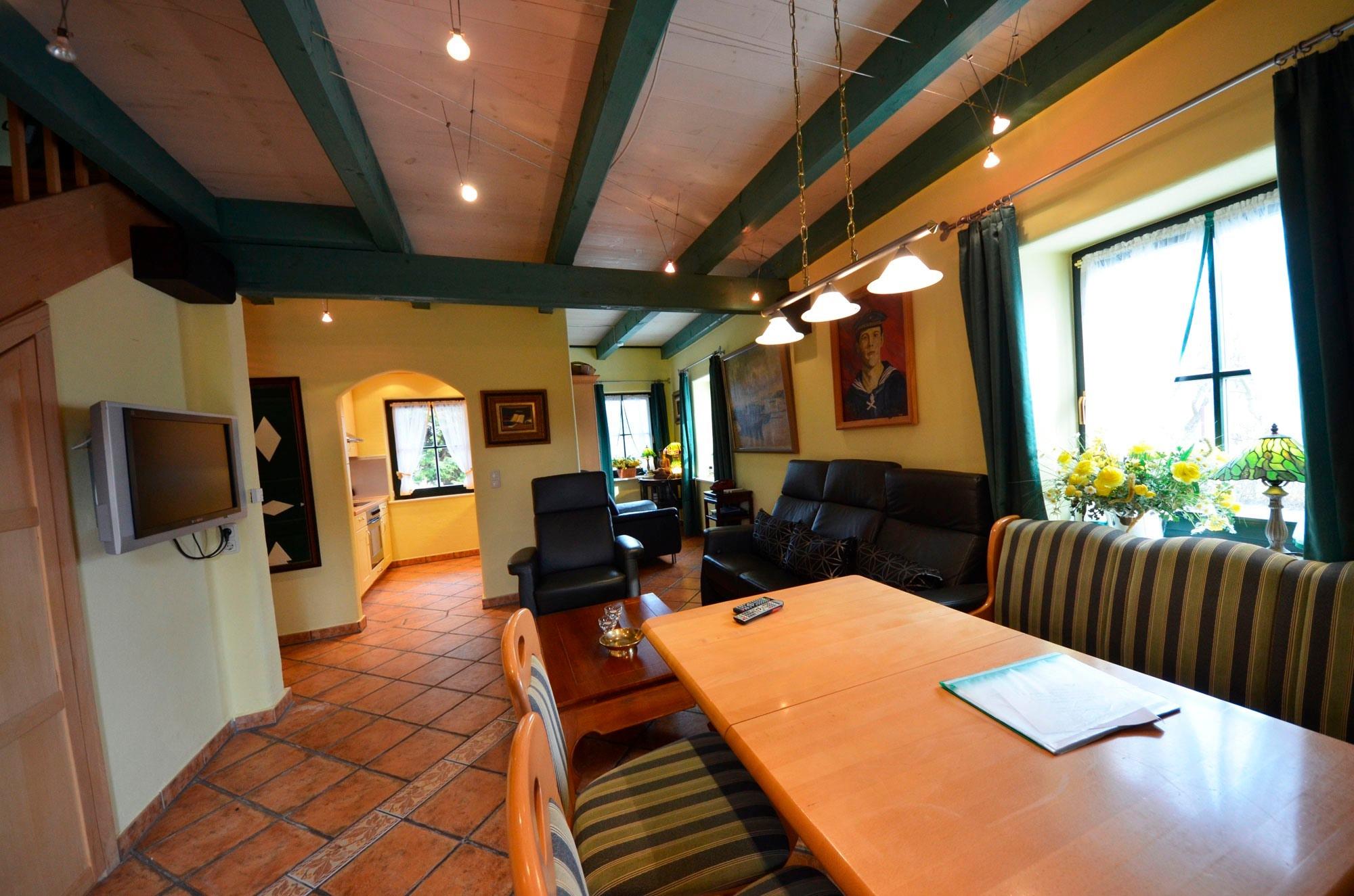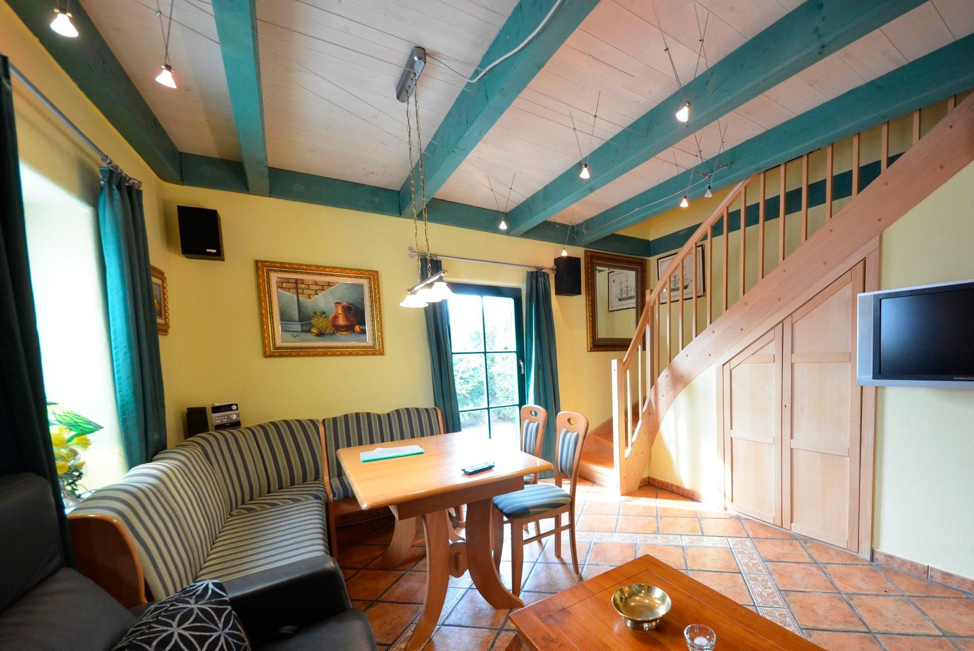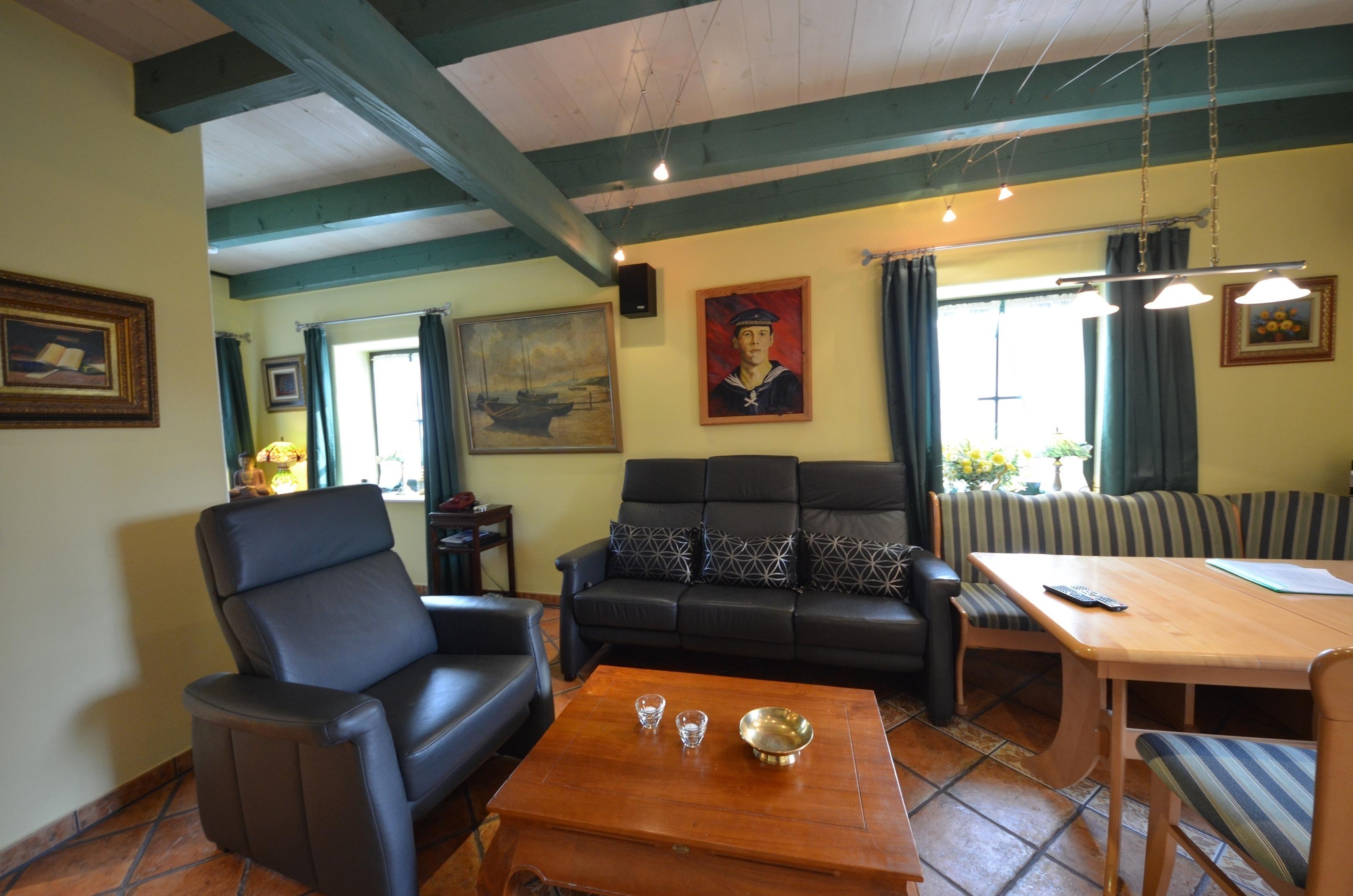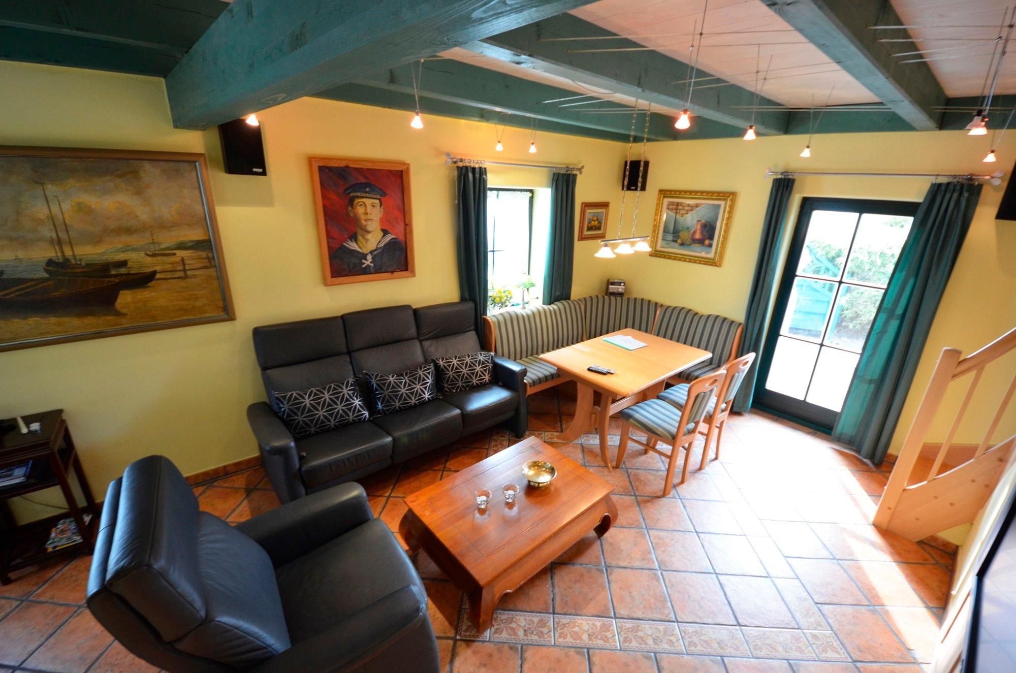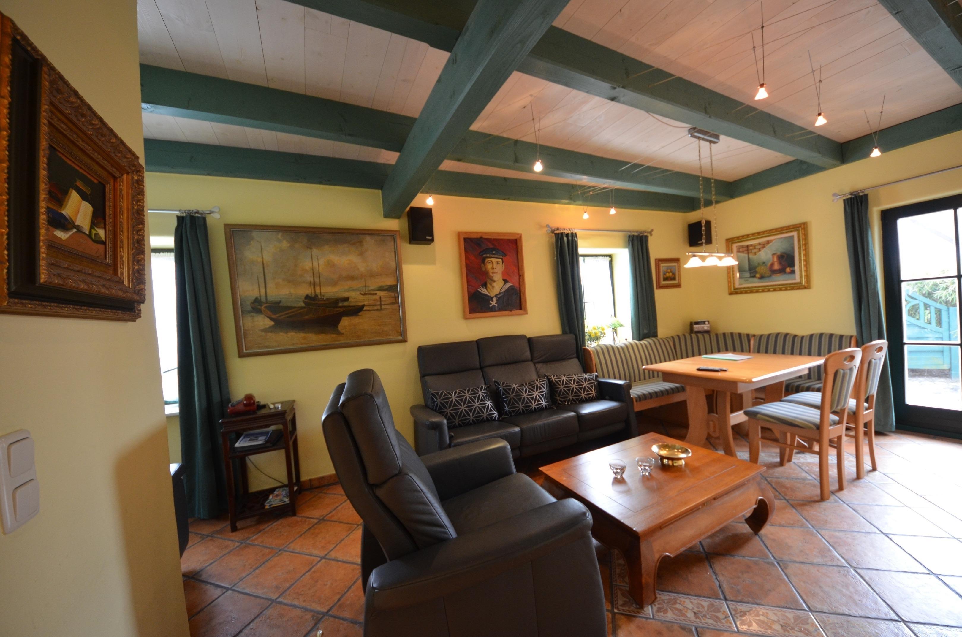 Gemütliches Wohnzimmer mit Deckenbalken und Ausgang zur eingewachsenen Terrasse mit Teak-Gartenmöbeln, Essecke für 6 Personen, schöne Couch-Garnitur und Opiumtisch, Telefon, 90er-Flachbild-TV, Stereo/CD, Geschirrschrank, Fußbodenheizung, Telefontisch mit Telefon und balinesischem Spiegel, Kinderhochstuhl, Wände dekoriert mit Bildern, sehr dekorative Beleuchtung, Fußbodenheizung.