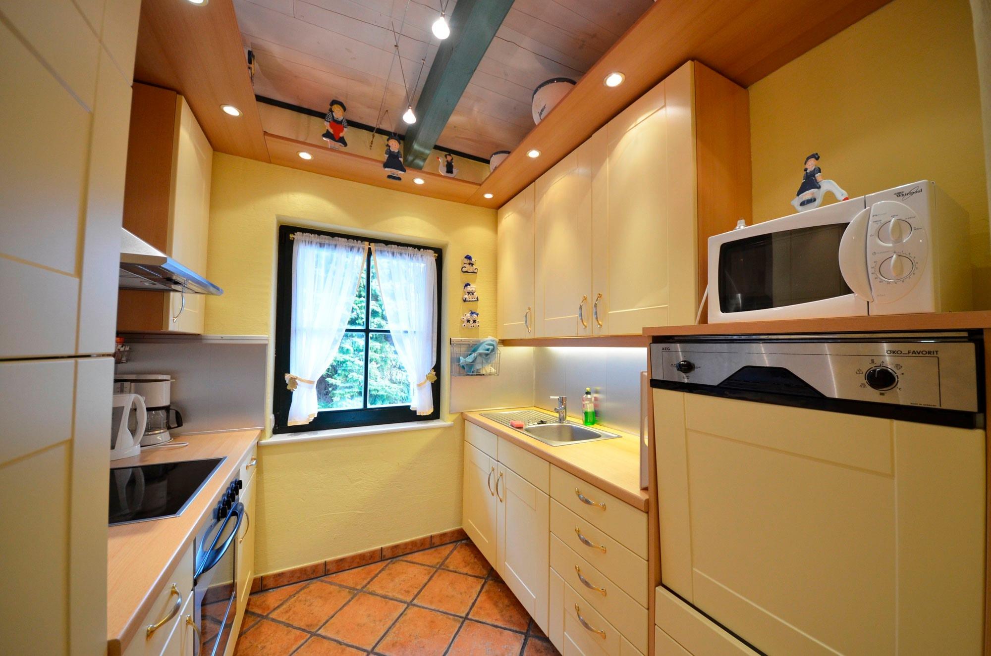 Fußbodenheizung, schöne moderne Einbauküche in arktisgelb, Geschirrspüler höher gelegt, Mikrowelle, Herd mit Cerankochfeld Turmhaube und Backofen, Kühlschrank mit Gefrierteil, 2 Kaffeemaschinen, Wasserkocher, Eierkocher, Toaster, Waffeleisen, Mixer, ausreichend Edelstahltöpfe, Schnellkochtopf Gewürze usw.
