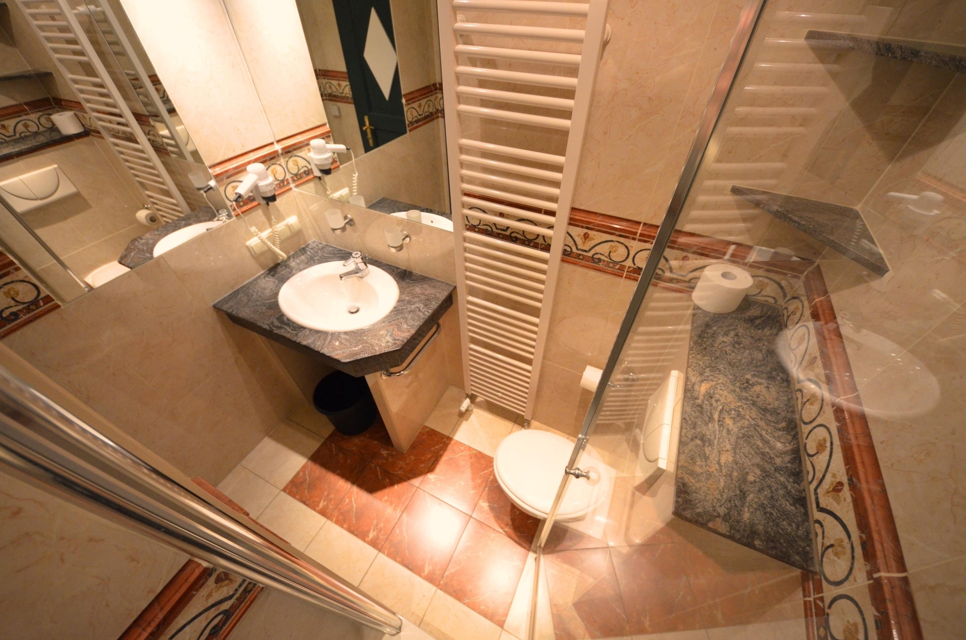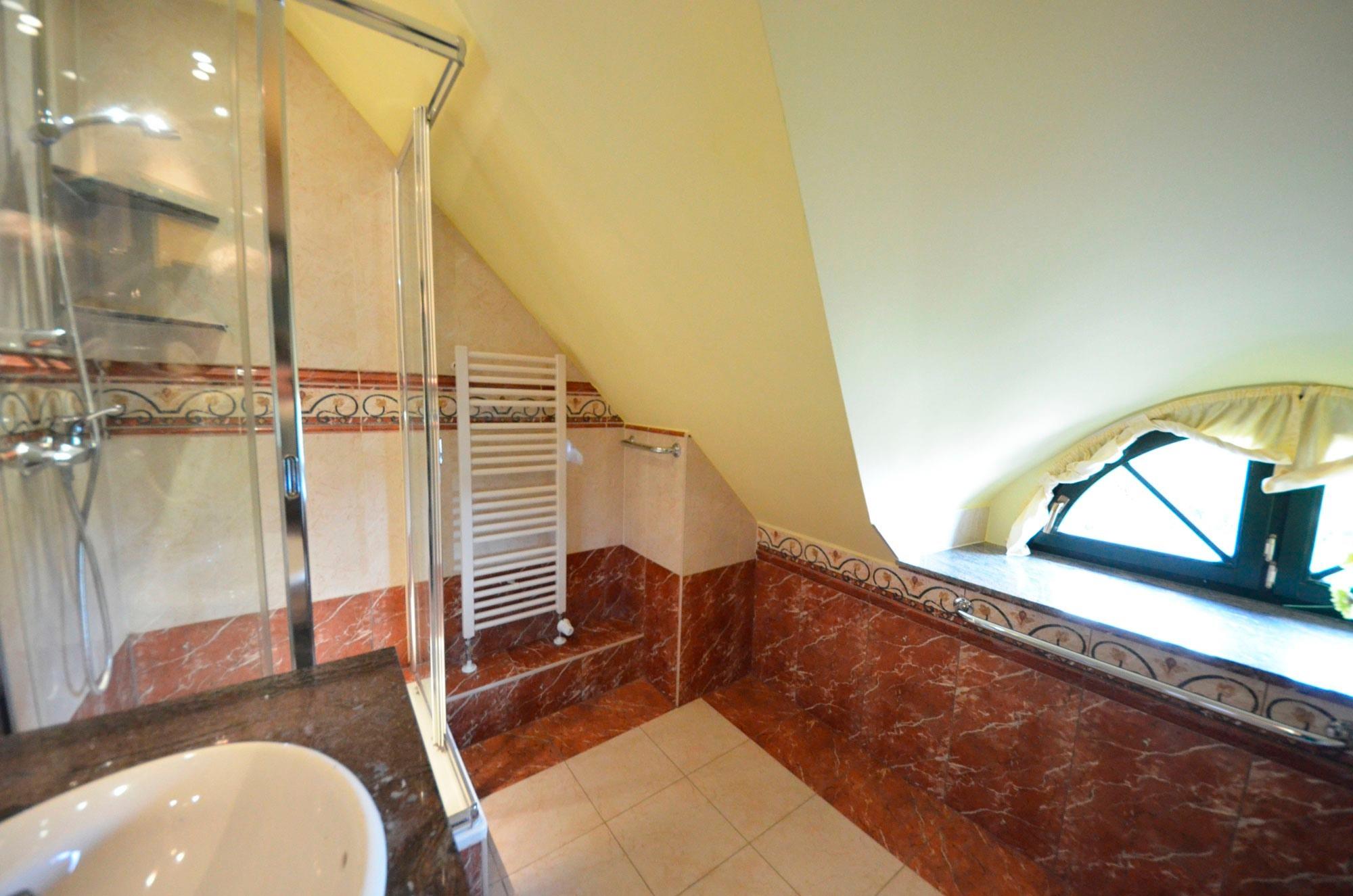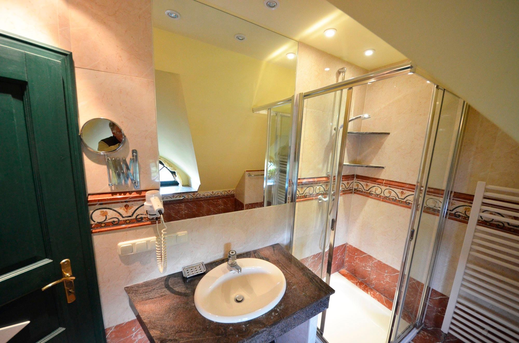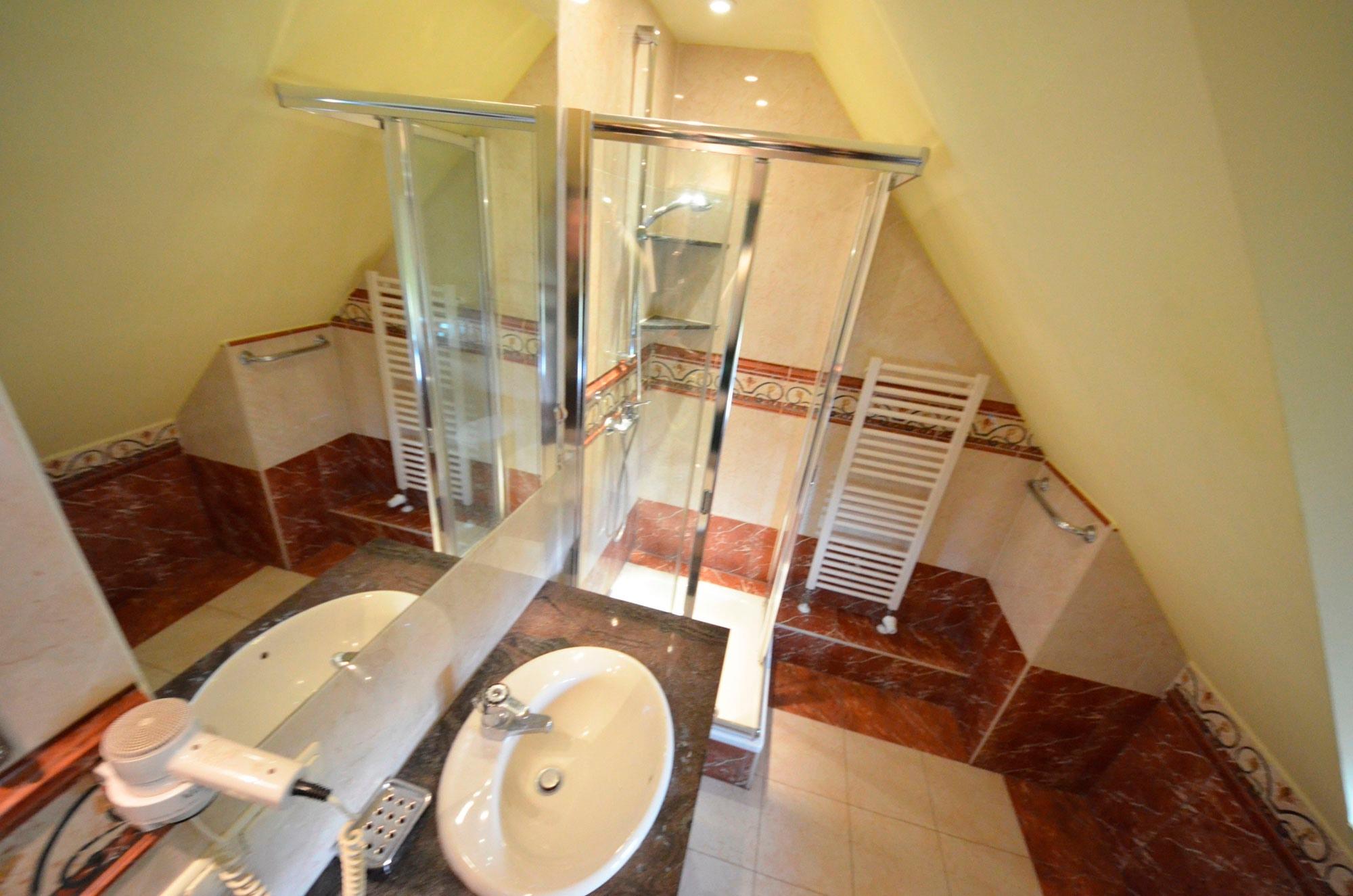 Glas-Dusche, Rundbogenfenster, Fön, Schminkspiegel, Fußbodenheizung, Natursteinabdeckungen, großflächige Spiegel, schöne Sanitärausstattung, beheizbarer Handtuchhalter.