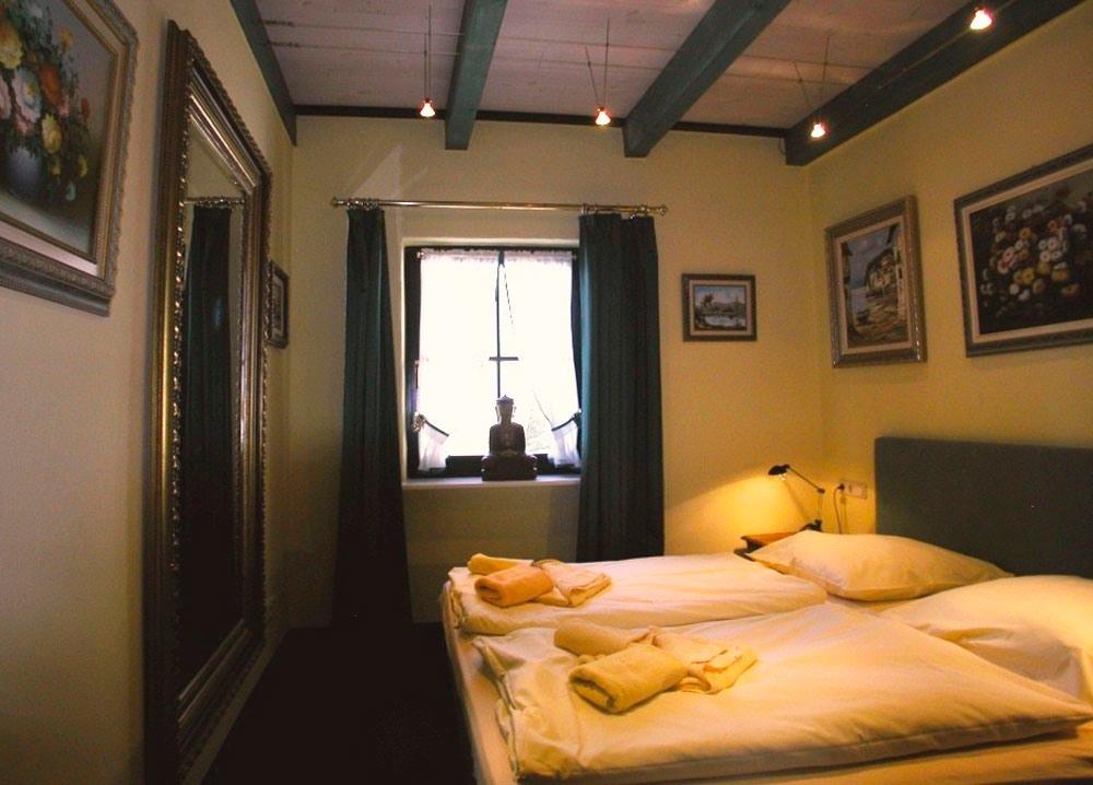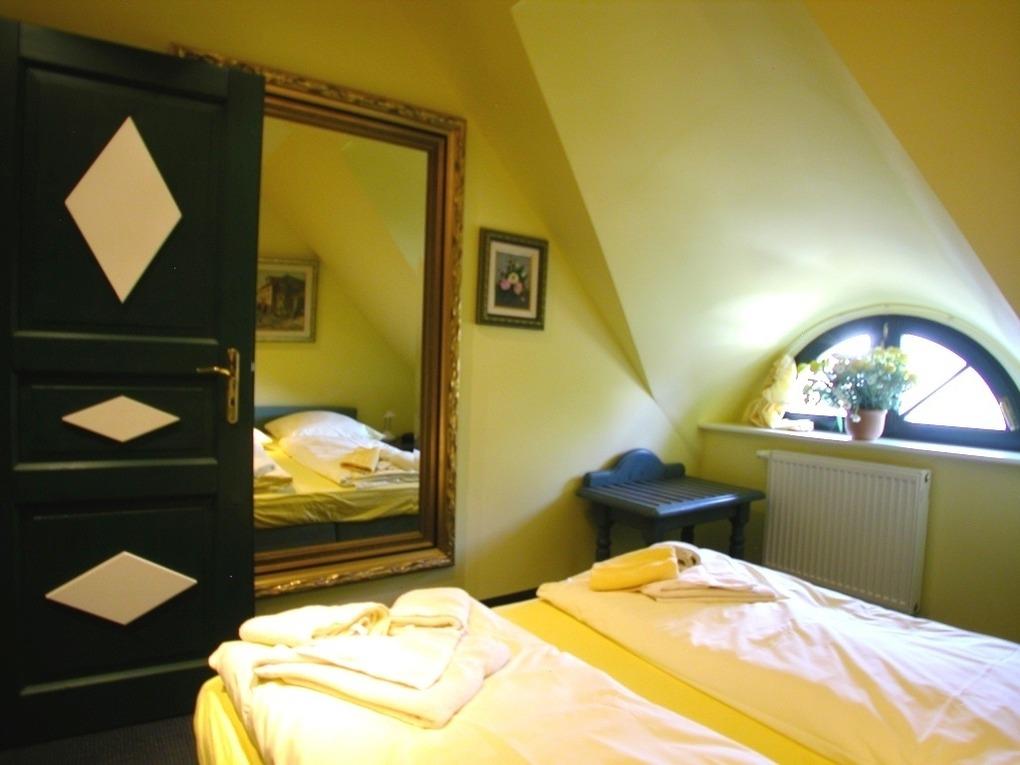 Doppel - Schlafzimmer, je mit einem 180x200 er Bett, aufgezogene Bettwäsche, Kleiderschrank mit ca. 40 Kleiderbügeln, Radiowecker, mit Bildern dekoriert.