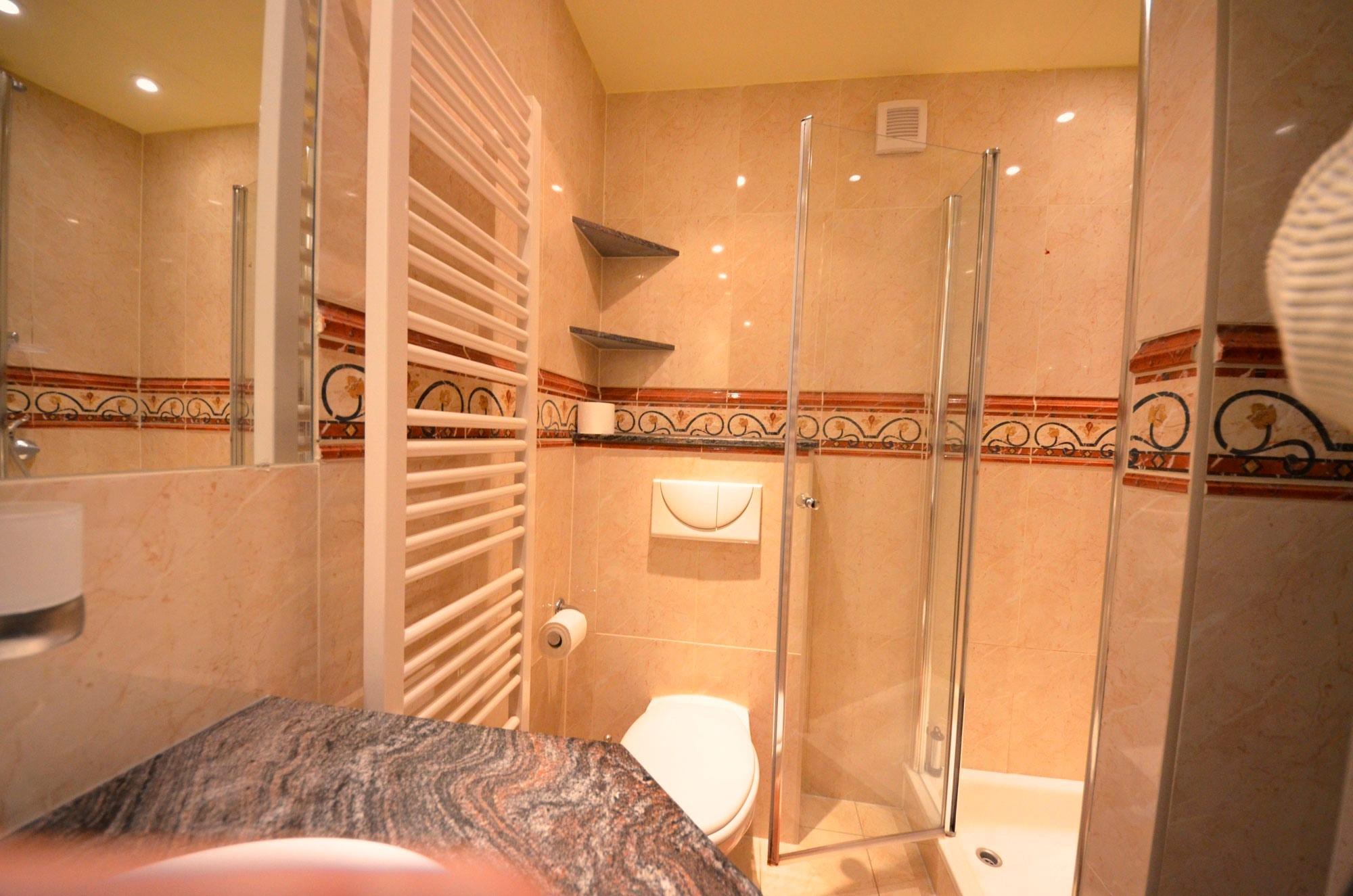 Glasdusche, Granitverkleidung, Fön, Schminkspiegel. Fußbodenheizung, Natursteinabdeckungen, schöne Sanitärausstattung, beheizbarer Handtuchhalter,