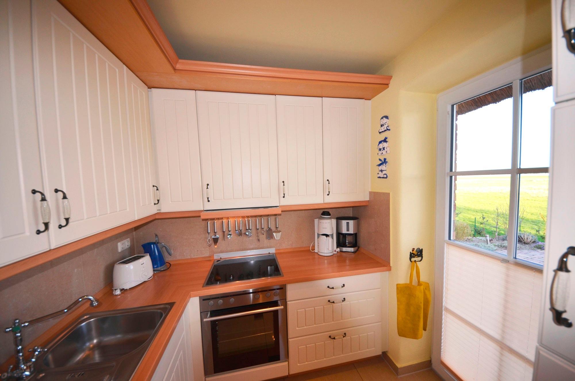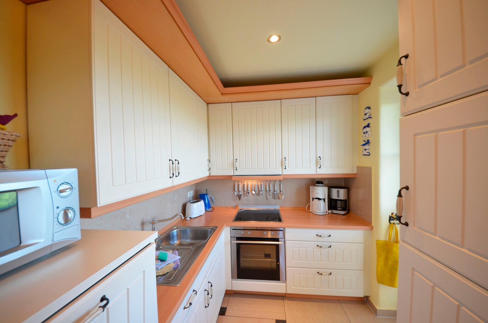 mit Ausgang zur großen Terrasse, schöne moderne Landhaus-Einbauküche in vanillegelb, Geschirrspüler höher gelegt, Mikrowelle, Herd mit Ceran -Kochfeld und Backofen, Turmhaube, Kühlschrank mit 38Ltr. Gefrierteil. 2 Kaffeemaschinen, Wasserkocher, Eierkocher, Toaster, Waffeleisen, Mixer, ausreichend Edelstahl-Töpfe Schnellkochtopf, Gewürze usw.