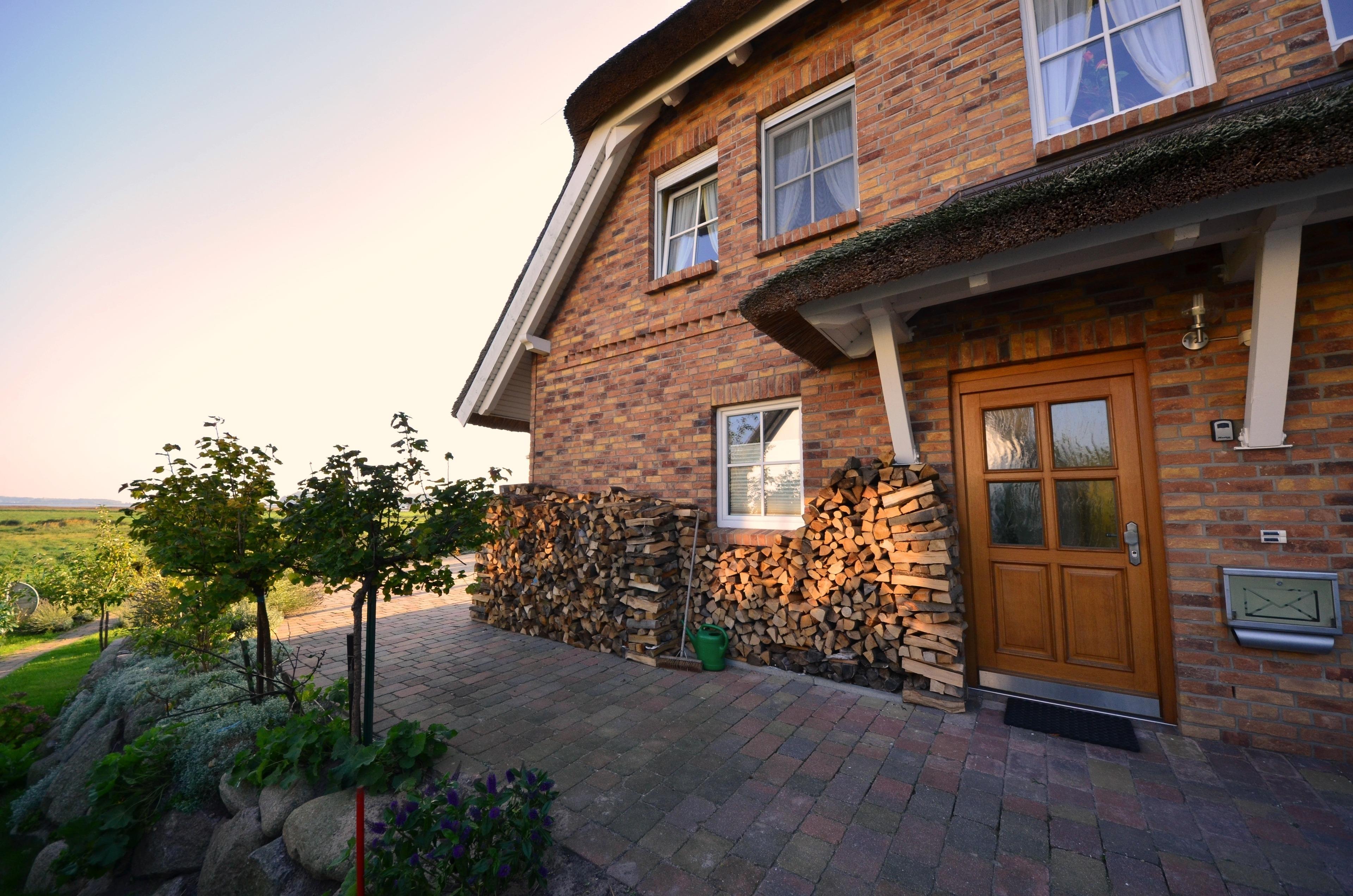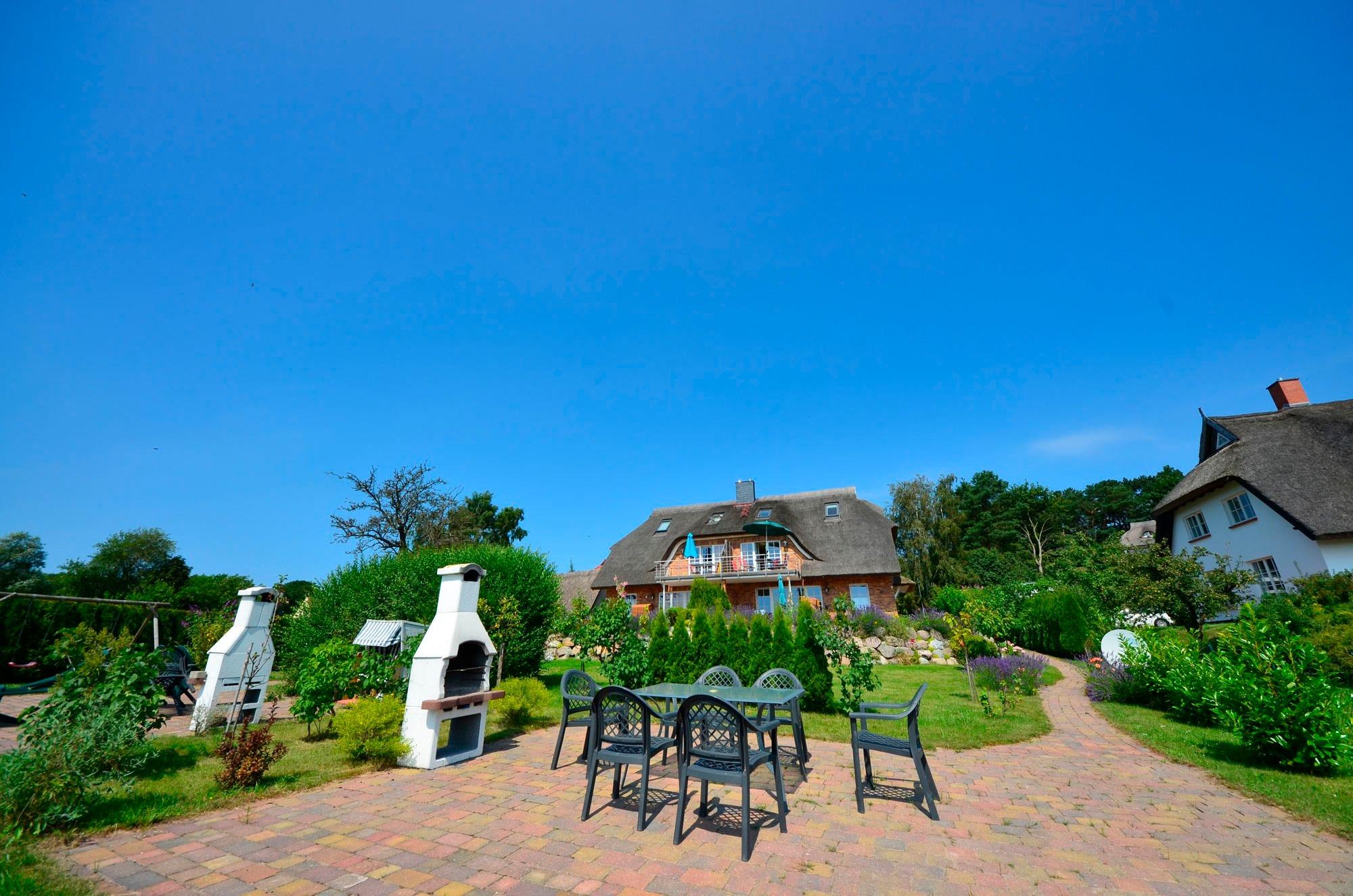 Die Ferienwohnung "Sonnenkliff" im Erdgeschoß in der neuen reetgedeckten und verklinkerten Doppelhaushälfte in Groß Zicker, Boddenstr. 8A. Die Wohnung hat einen eigenen separaten Eingang. Das Haus wurde 2008 neu errichtet.