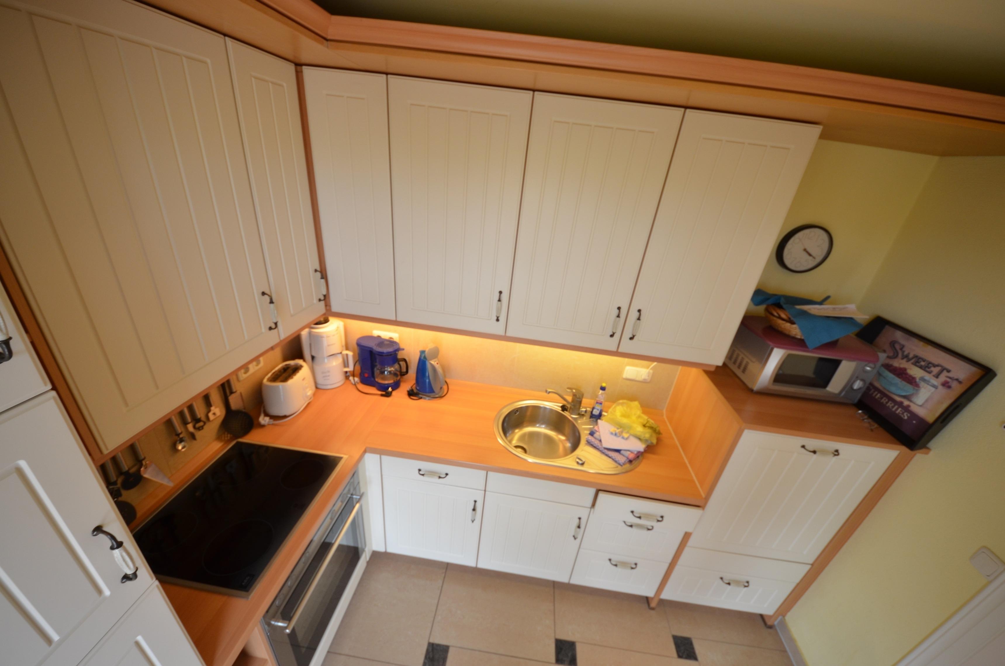 mit Ausgang zur großen Terrasse, schöne moderne Landhaus-Einbauküche in vanillegelb, Geschirrspüler höher gelegt, Mikrowelle, Herd mit Ceran-Kochfeld und Backofen, Turmhaube, Kühlschrank mit 38Ltr. Gefrierteil. 2 Kaffeemaschinen, Wasserkocher, Eierkocher, Toaster, Waffeleisen, Mixer, ausreichend Edelstahl-Töpfe Schnellkochtopf, Gewürze usw. sehr schönes Geschirr, Auswahl an Gläsern (ca. 50Stk.)
