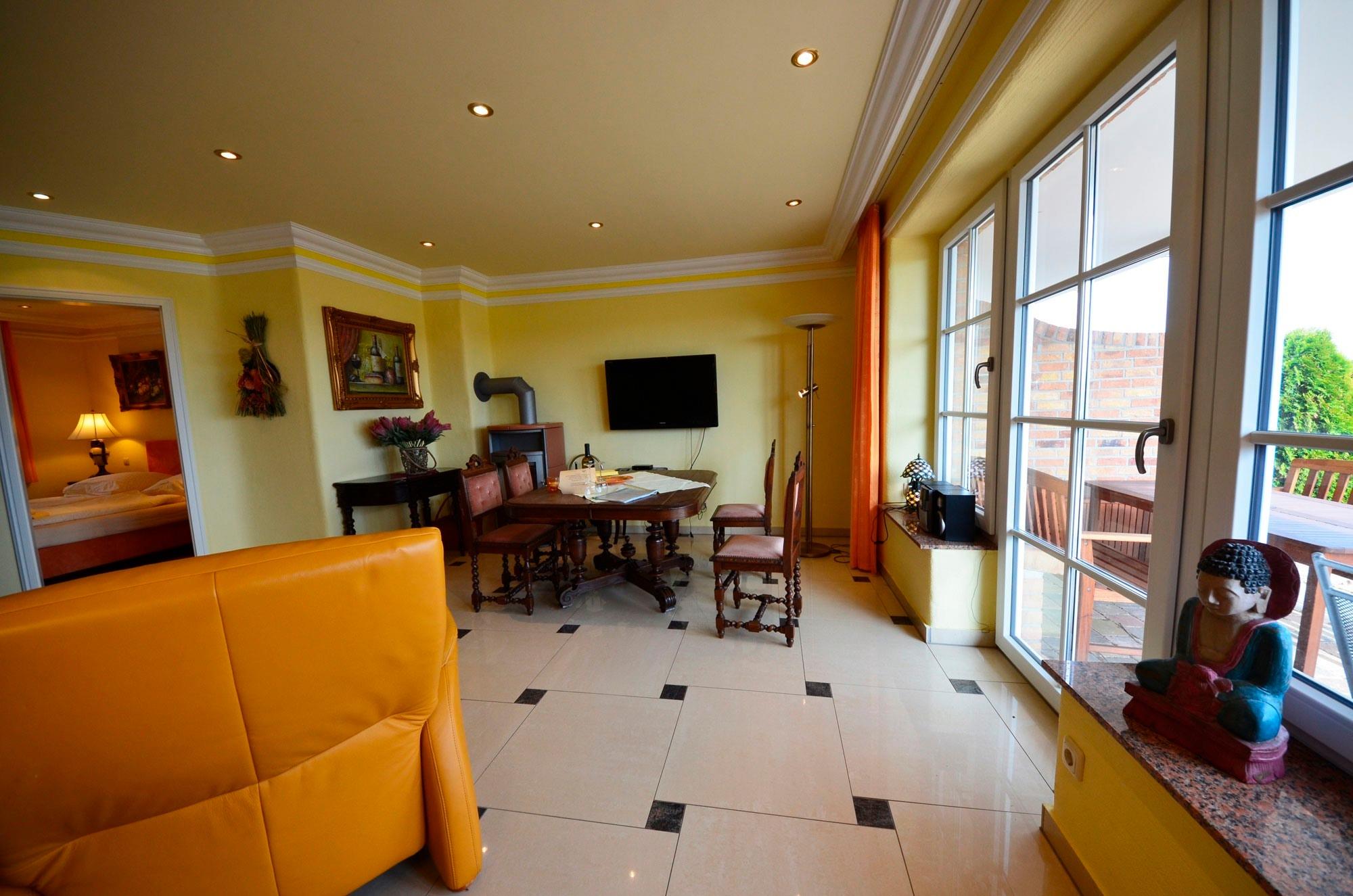 Großzügiges Wohn-Esszimmer mit Ausgang zur großen 80m²-Terrasse. Schöne Ledergarnitur mit Opiumtisch, große Fensterfronten mit direktem Blick auf die Ostsee, den kleinen Hafen von Groß Zicker und die gegenüber der Bucht liegenden Orte Thiessow und Klein Zicker. Antiker Esstisch mit 4 Stühlen, großer Hark-Kaminofen, Gläserschrank, antike Vitrine, kleine Bücherauswahl, Plasma-TV 50" mit 125 cm Großbild, Fußbodenheizung, DVD - Recorder, Stereoanlage, CD-Player, Kinderhochstuhl, Wände dekoriert mit Spiegeln und Gemälden, sehr ansprechende Beleuchtung.