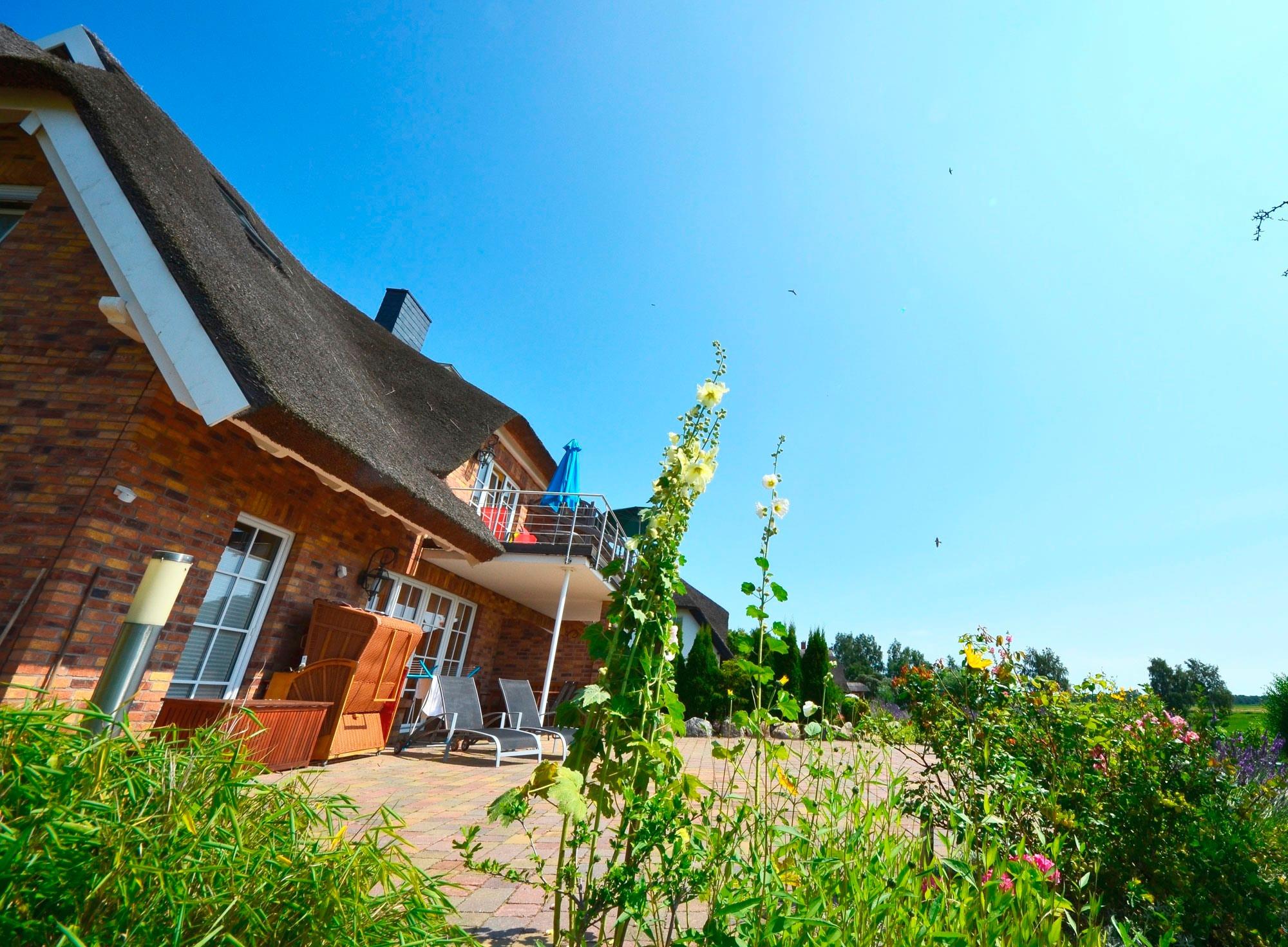 Ferienwohnung "Sonnenkamp" im Erdgeschoß in der neuen reetgedeckten und verklinkerten Doppelhaushälfte in Groß Zicker/Halbinsel Mönchgut auf Rügen, Boddenstr. 8B.