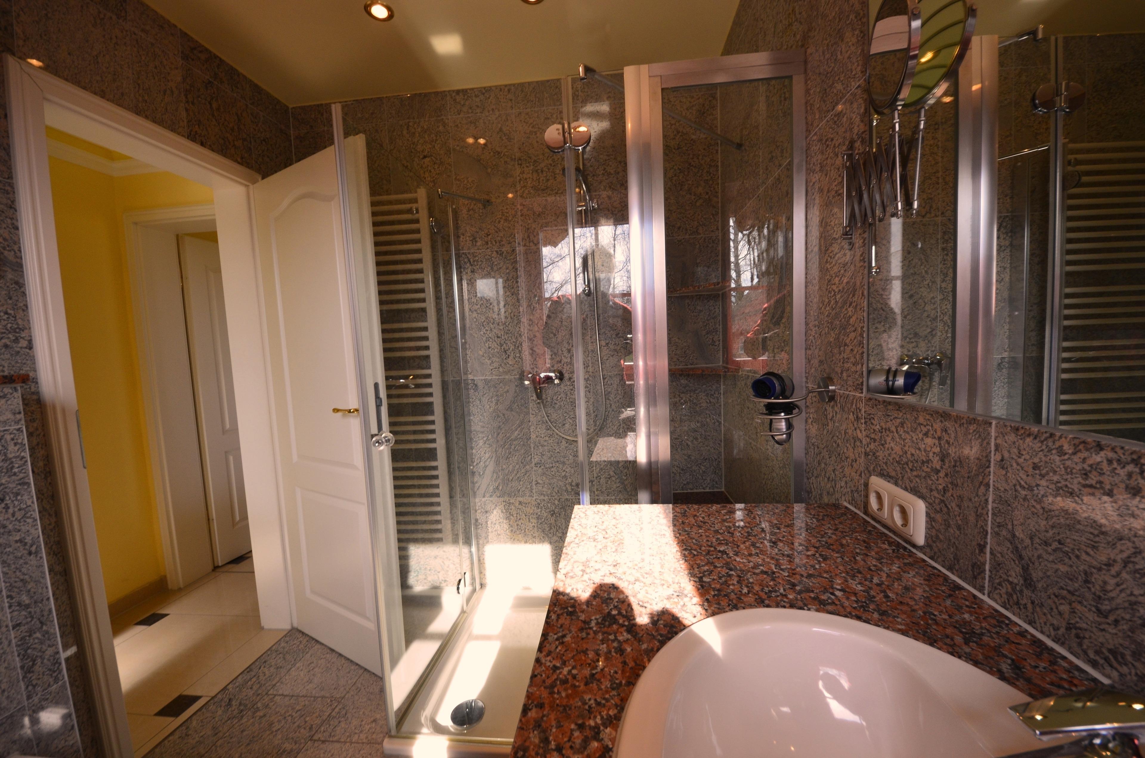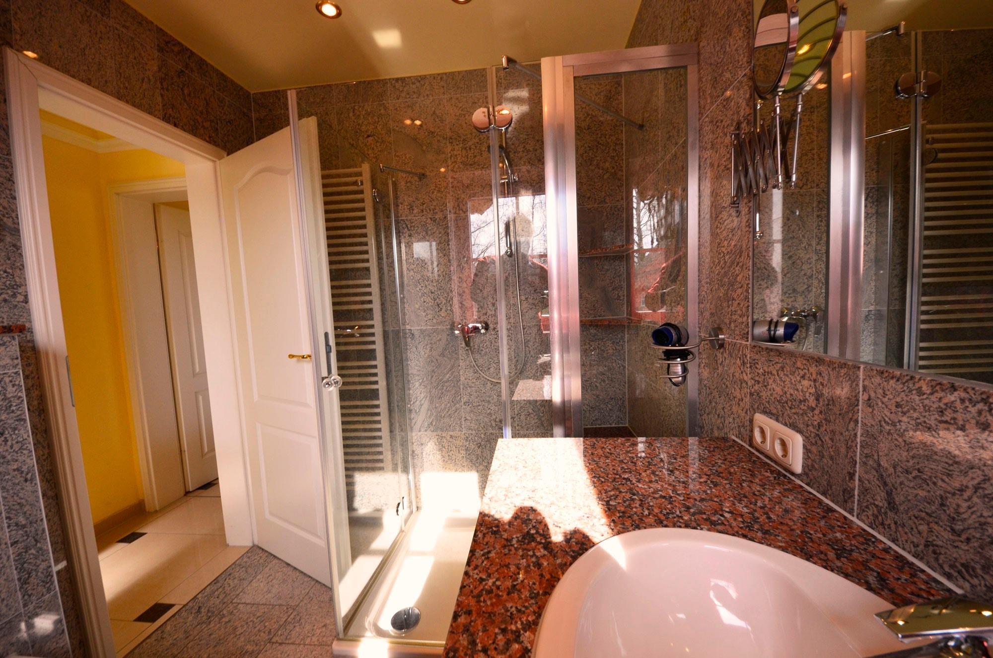 Glas-Dusche mit Sitzbank aus Granit, Fußbodenheizung, Granit-Abdeckungen, große Spiegel, schöne Sanitärausstattung: Toilette und Bidet, Einbau-Waschbecken mit Granit - Abdeckungen, beheizbarer Handtuchhalter, Fön, Schminkspiegel, Glas -Dusche mit Sitzbank, dekorative Beleuchtung.