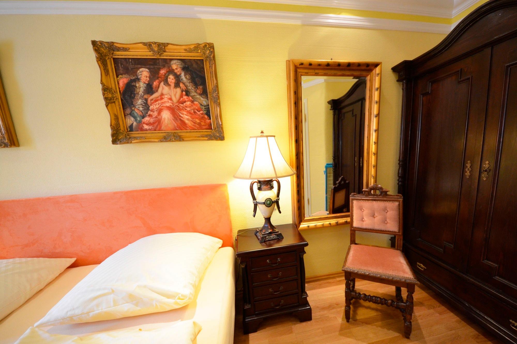 Zwei Doppel-Schlafzimmer mit Doppelbett 180x200 und einmal mit 160x200 und aufgezogener Bettwäsche. Radiowecker, Wände mit Bildern dekoriert, antiker Gründerzeit Wäsche/Kleiderschrank, elektrische Rollläden, Fenster mit Mückenschutz