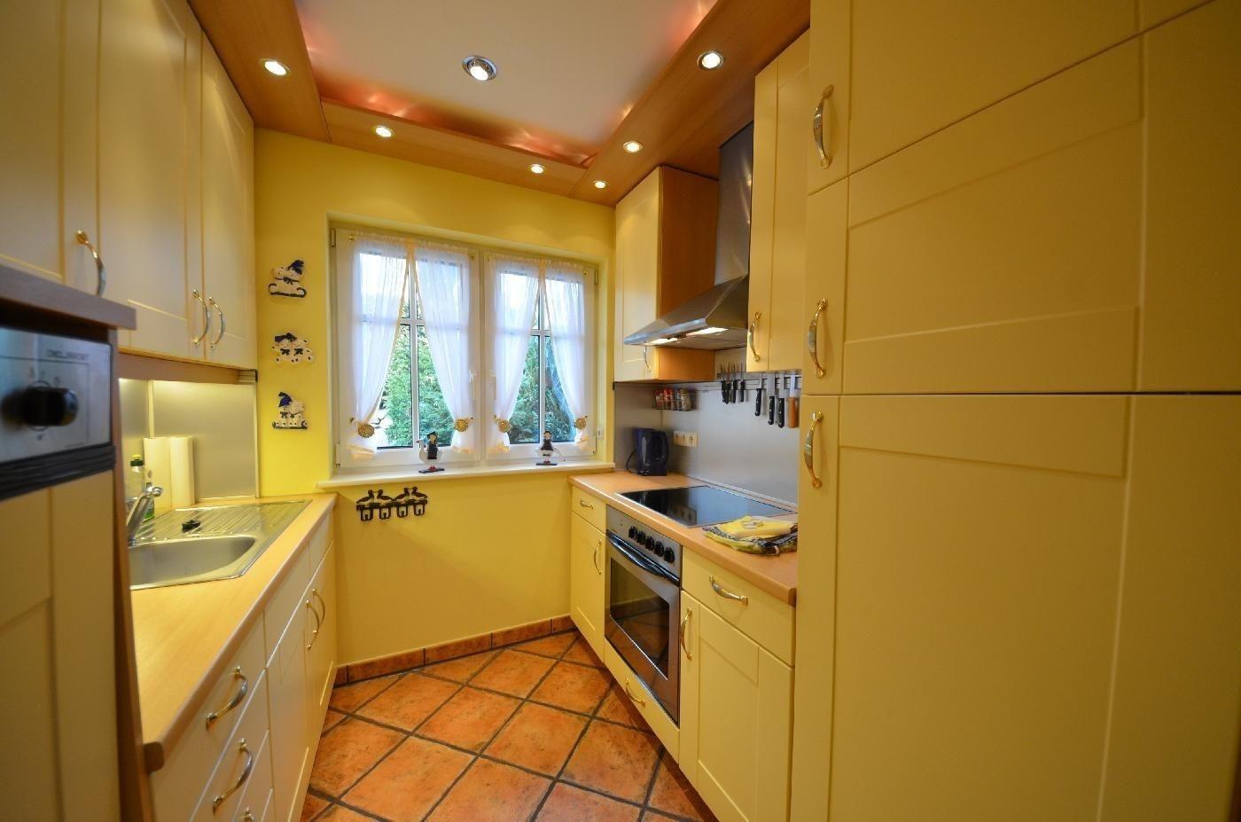 Fußbodenheizung, schöne moderne Einbauküche in arktisgelb, höher gelegter Geschirrspüler, Mikrowelle, Herd mit Ceran - Kochfeld Turmhaube und Backofen, Kühlschrank mit Gefrierteil,