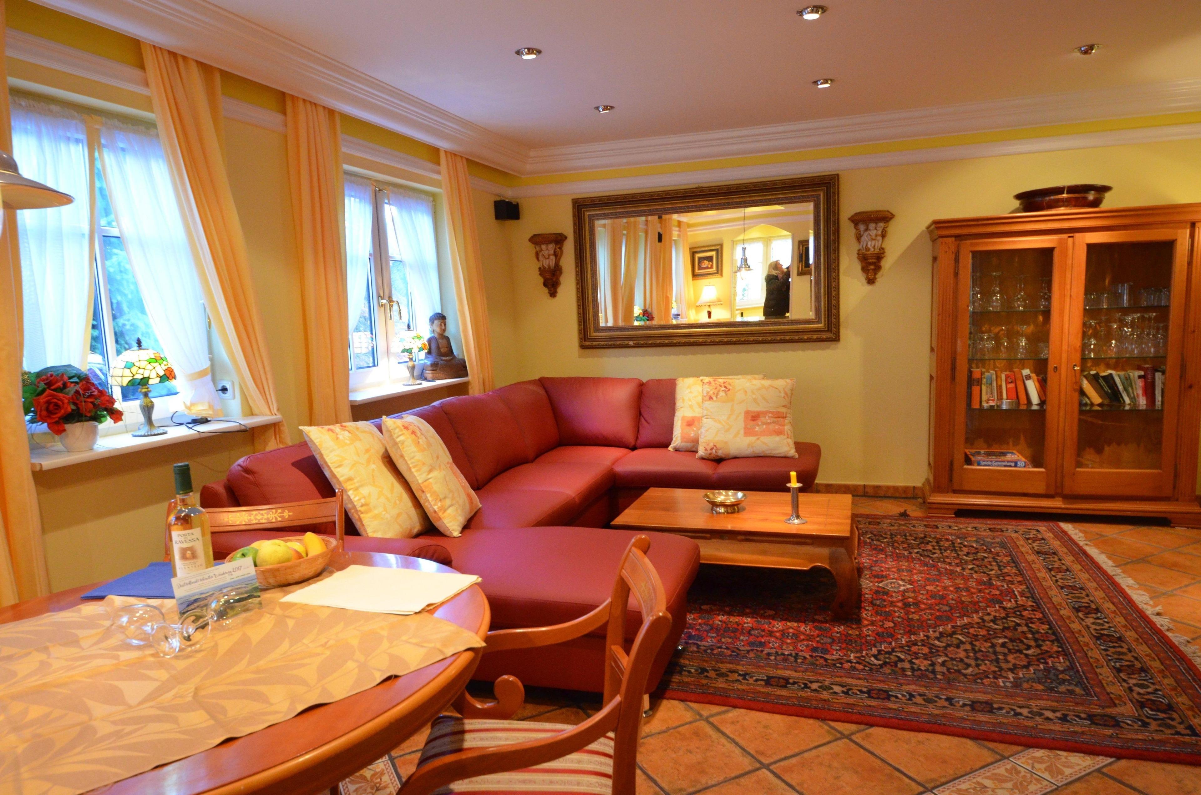 Gemütliches Wohn- Esszimmer, Fußbodenheizung, Esstisch für 4 Personen, schöne Leder-Couch-Garnitur und Opiumtisch, 50" (125cm) TV, WLAN, Stereo / CD, antiker Geschirrschrank, Telefontisch mit Telefon und balinesischem Spiegel, Kinderhochstuhl, Wände dekoriert mit Bildern,
