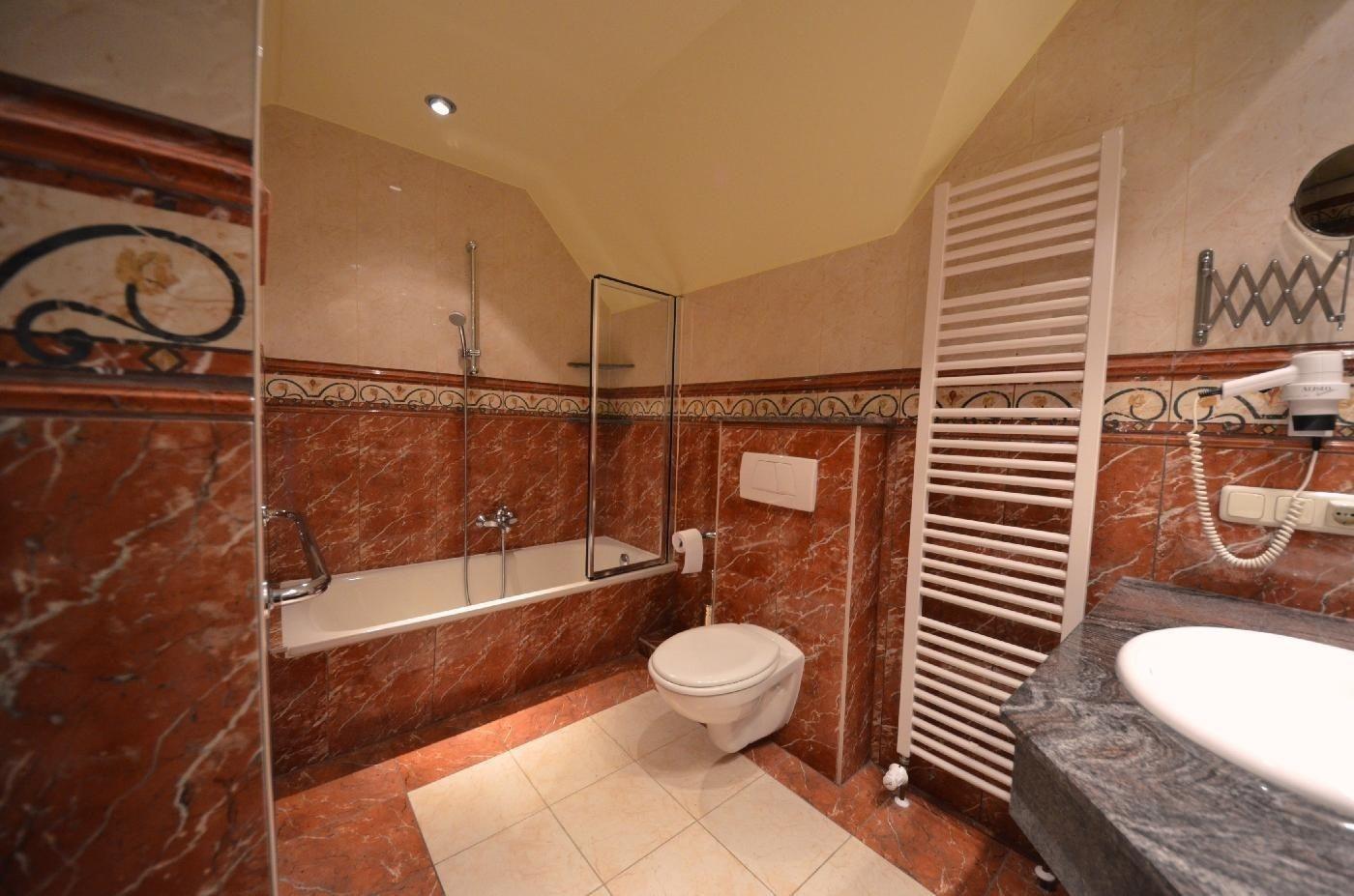 Wanne mit Glas-Duschwand, Fön, Schminkspiegel. Fußbodenheizung, Granit-Natursteinabdeckungen, schöne Sanitärausstattung in Pergamon, beheizbarer Handtuchhalter.
