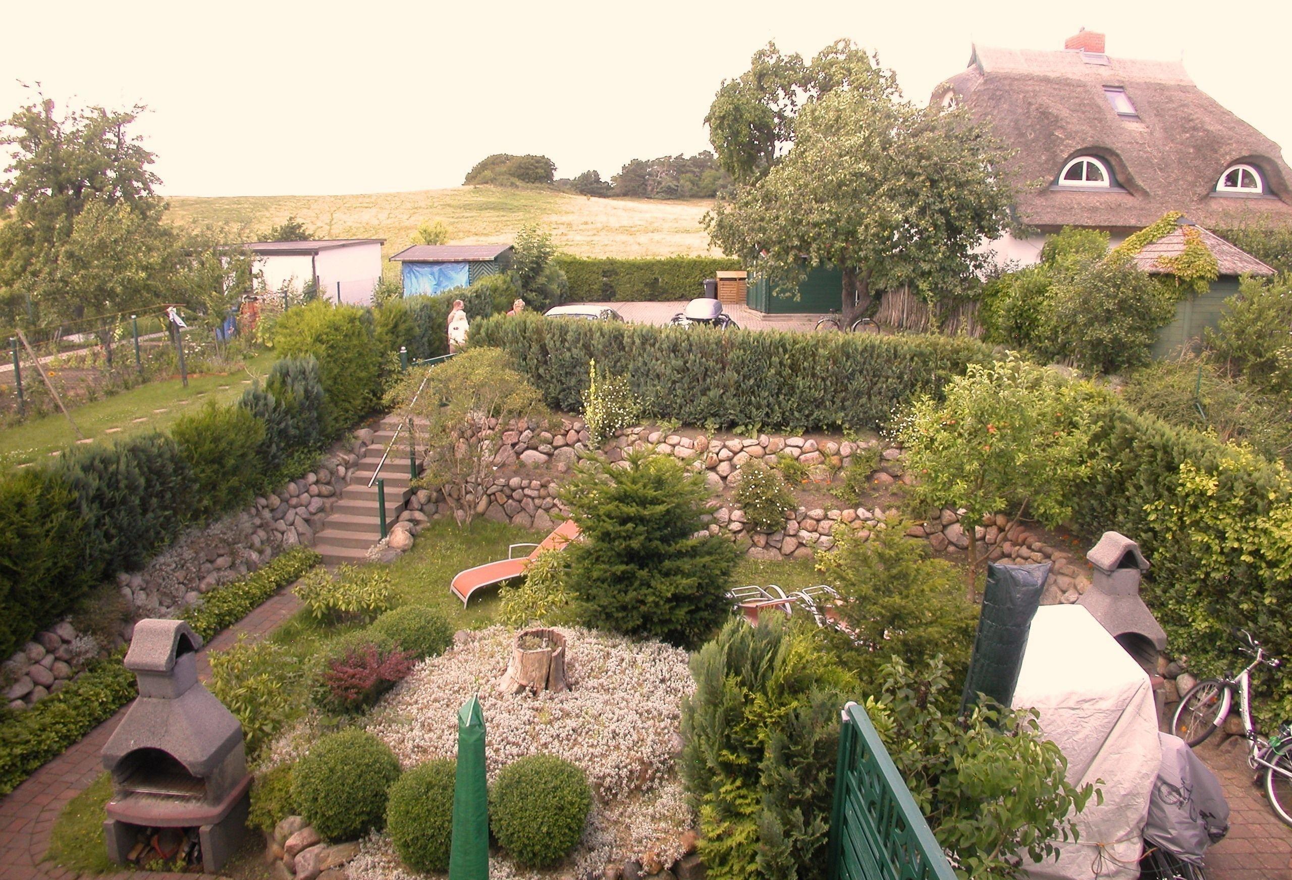 Der kleine Garten liegt seitlich am Haus und verfügt über Terrasse mit Gartenmöbeln, Gartengrill und Liegen.