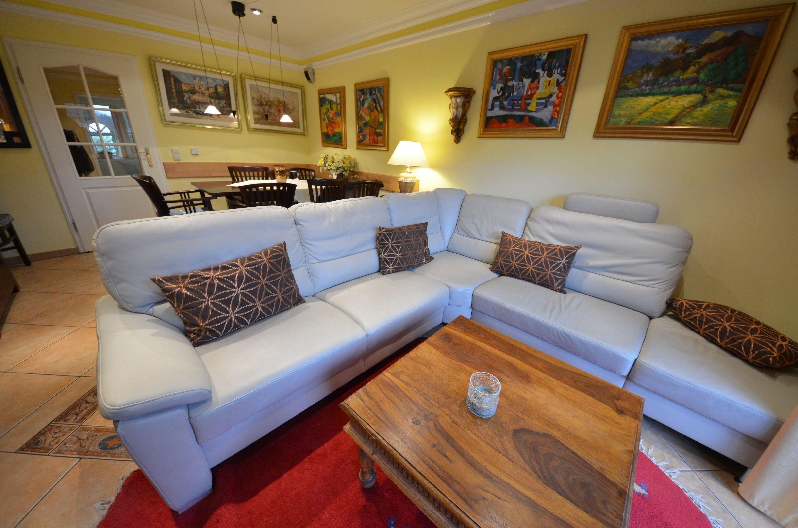 schöne Couch-Garnitur und Opiumtisch, Telefon, 120er - Flachbild - TV,