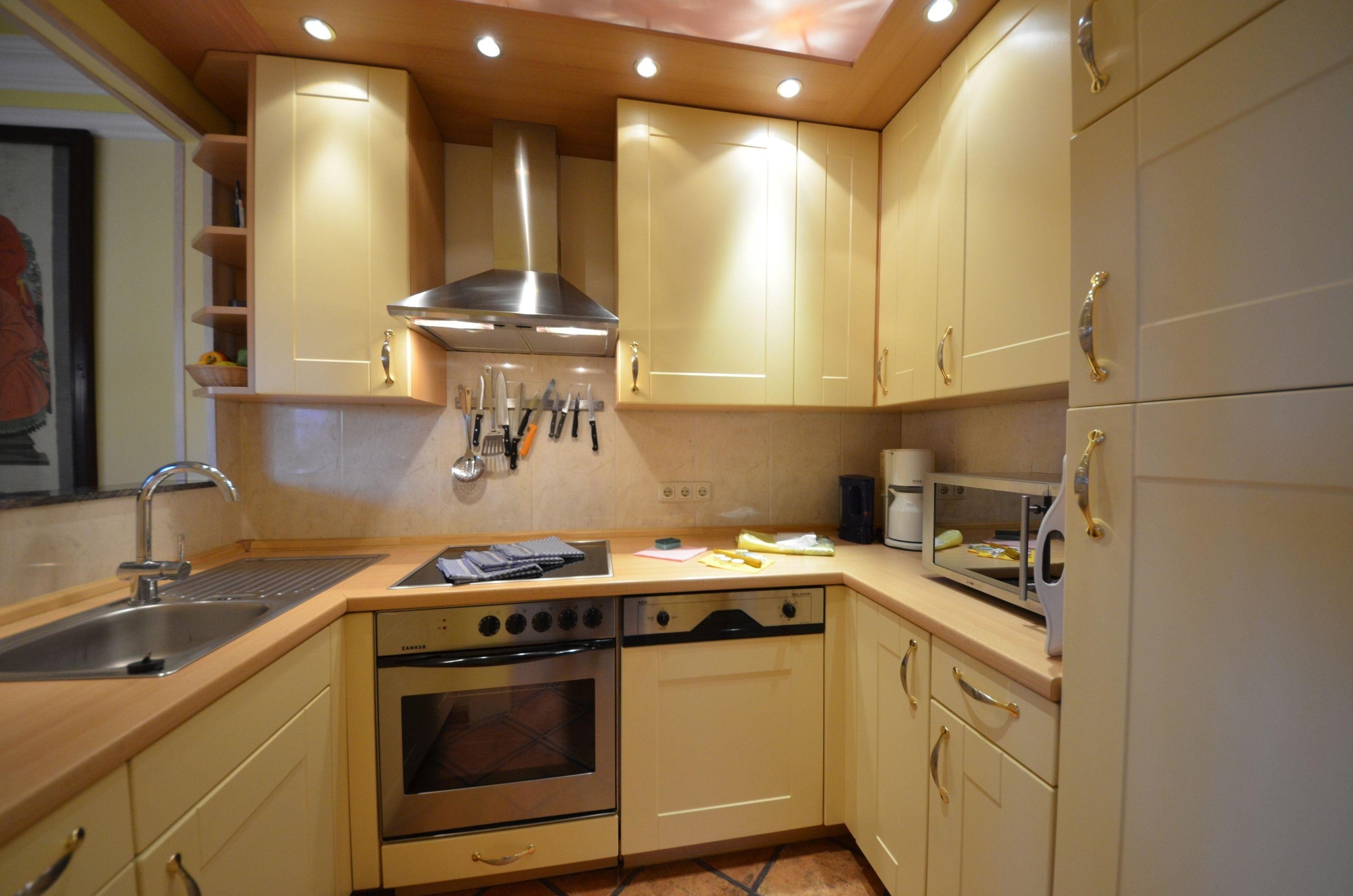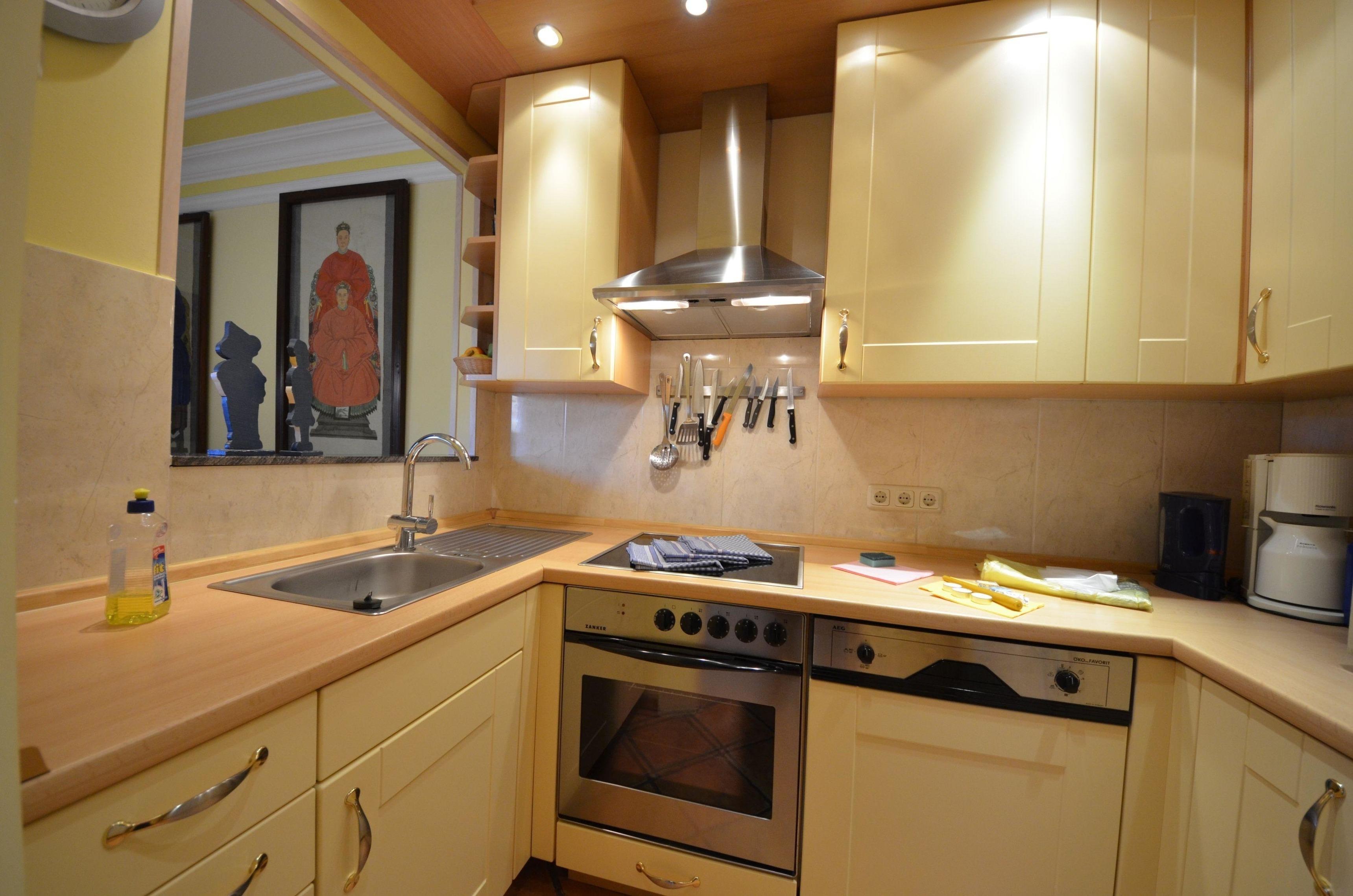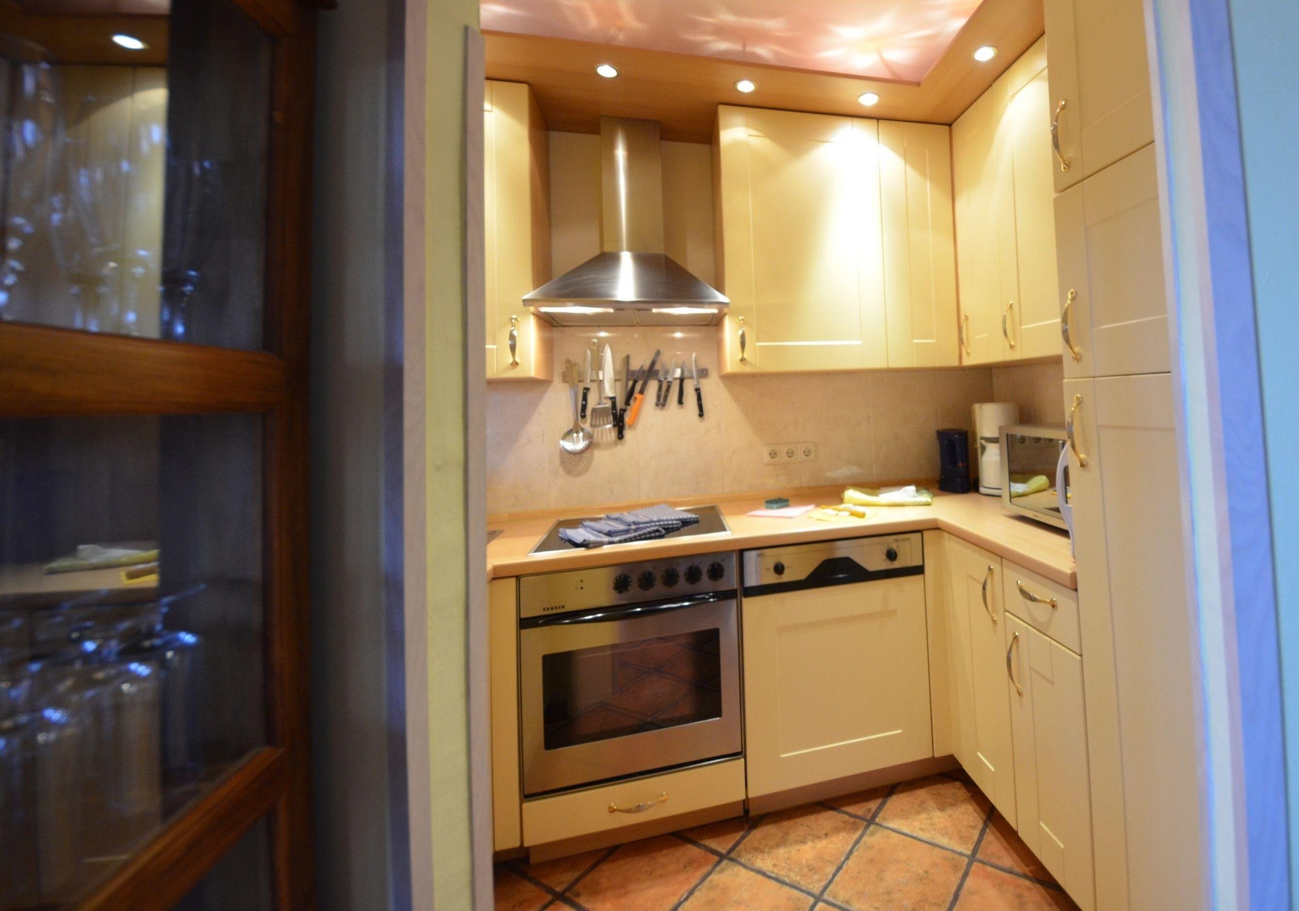 schöne vanillefarbene Landhaus-Einbauküche mit Geschirrspüler, Mikrowelle,
