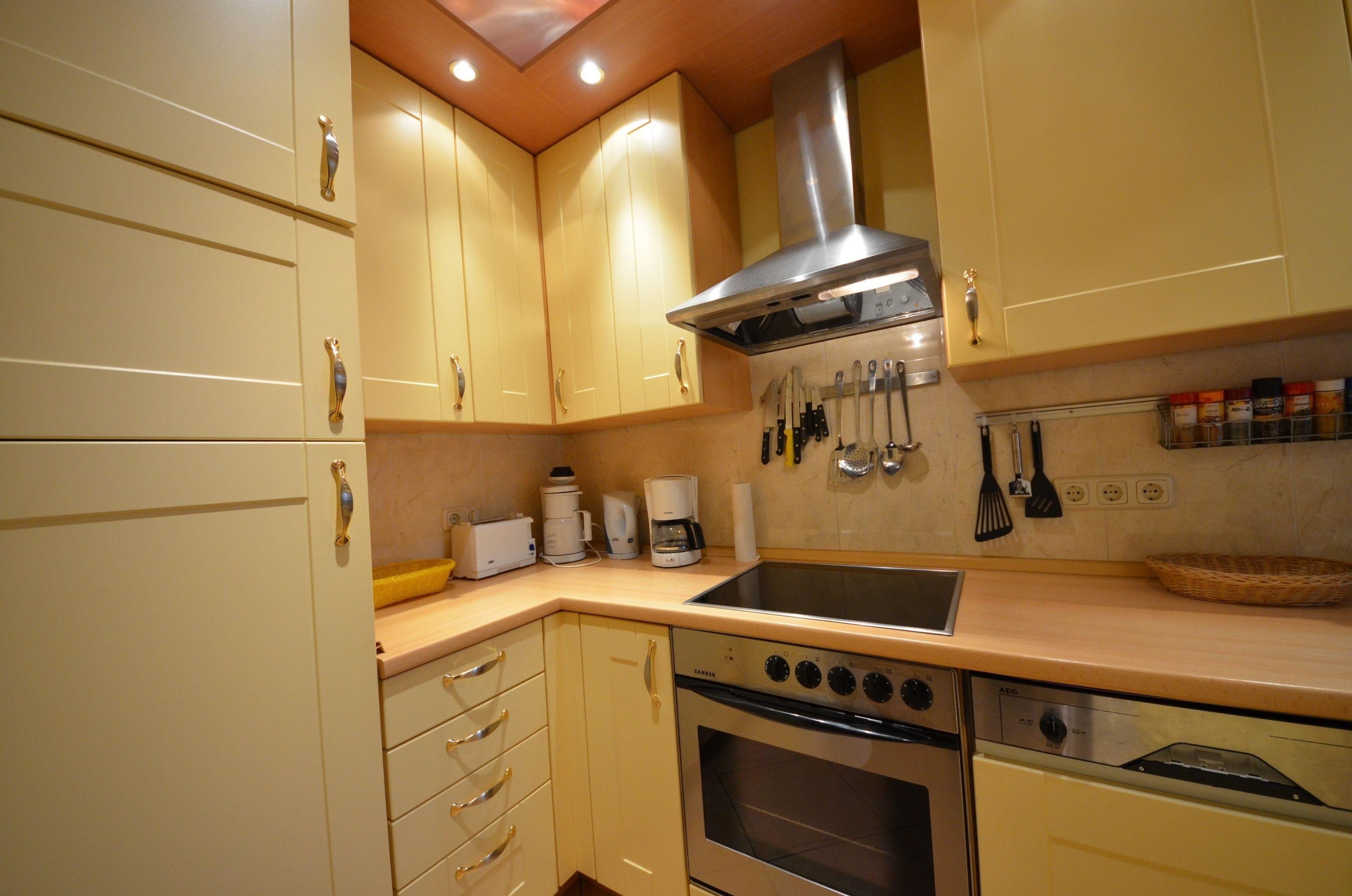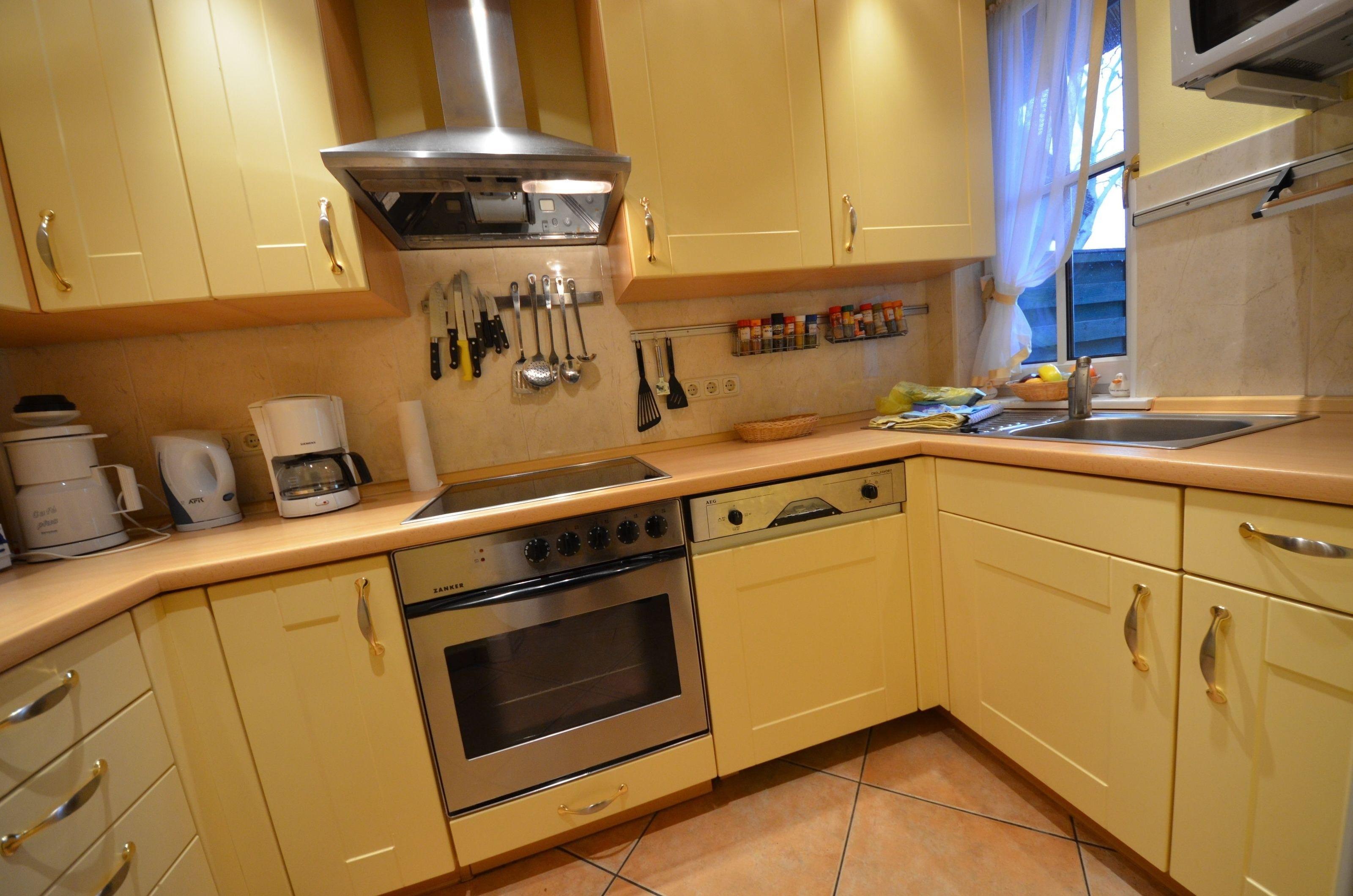 Fußbodenheizung, schöne moderne Einbauküche in arktisgelb, Geschirrspüler höher