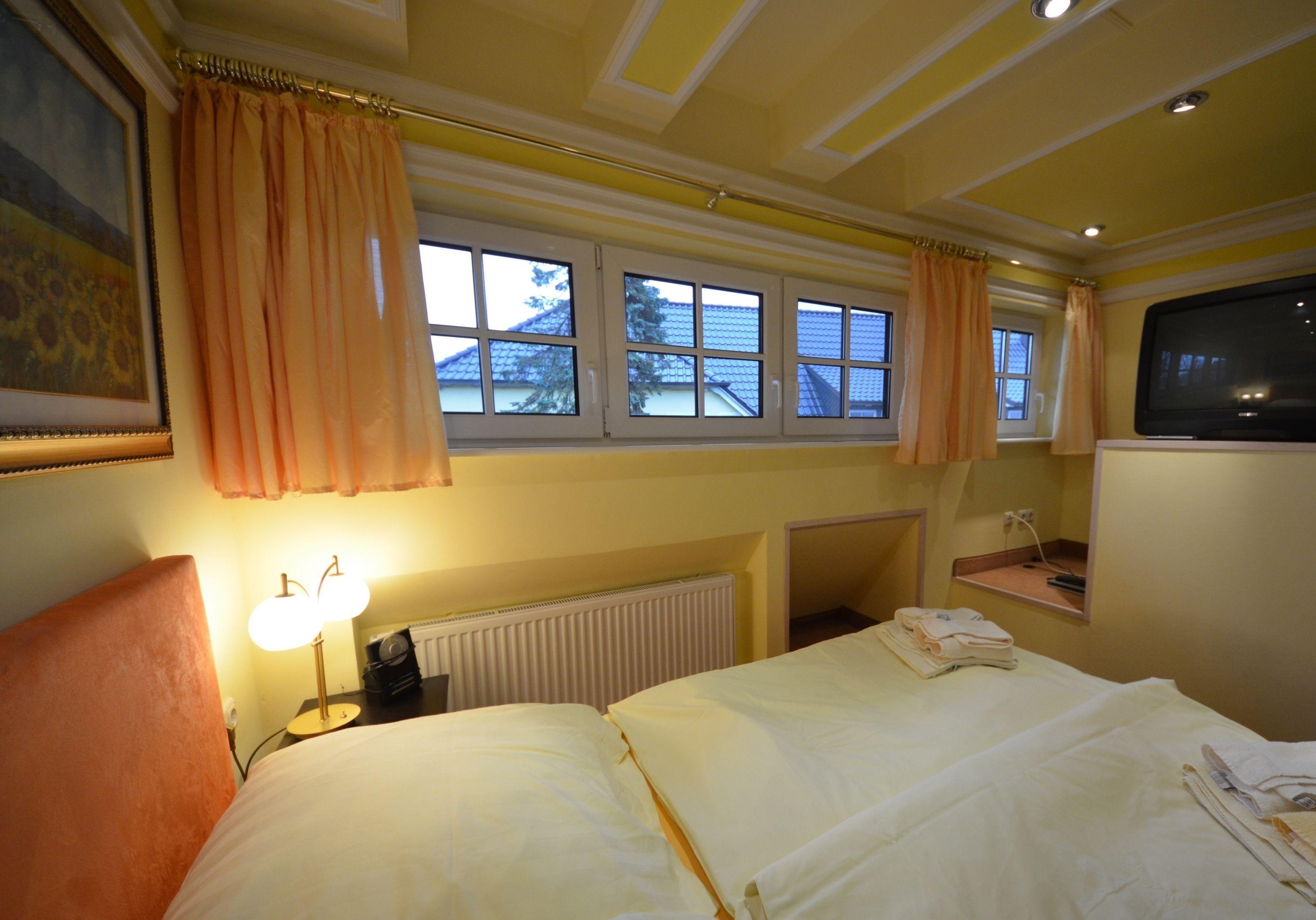 Doppelbetten jeweils 160 x 200 und 180 x 200, mit aufgezogener Bettwäsche. Radiowecker, mit Bildern dekoriert. Große Ganzkörperspiegel.