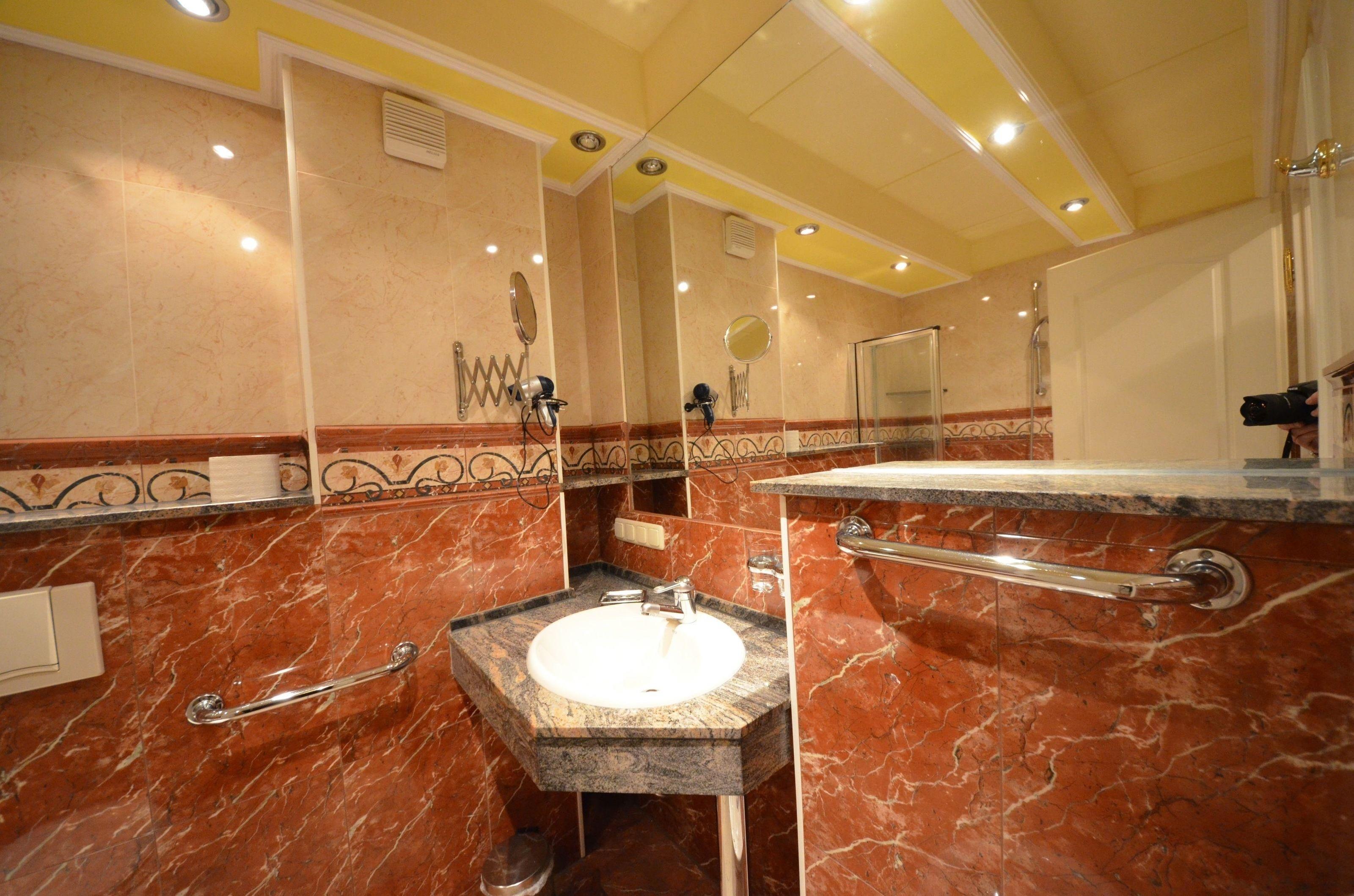 1 Bad mit Wanne / Dusche aus Naturstein / Granit mit Fön und Schminkspiegel.