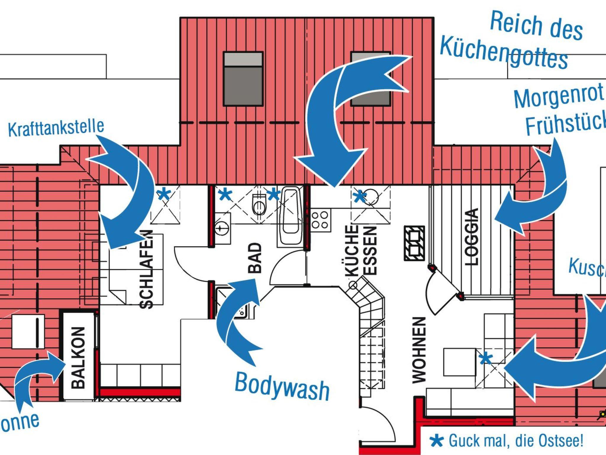 Der Ostsee ganz nah: Beobachten Sie Wellen, Schiffe und Seevögel von der Terrasse aus oder aus Ihrem Wohnzimmerfenster. Hier berührt die Schönheit des Meeres die Seele ohne Umweg, hier können Sie die Ostsee mit allen Sinnen erfahren. Das Rauschen der Brandung, die Rufe der Vögel, das Singen des Windes – das ist Balsam für die Seele und pure Erholung in tiefen Atemzügen.