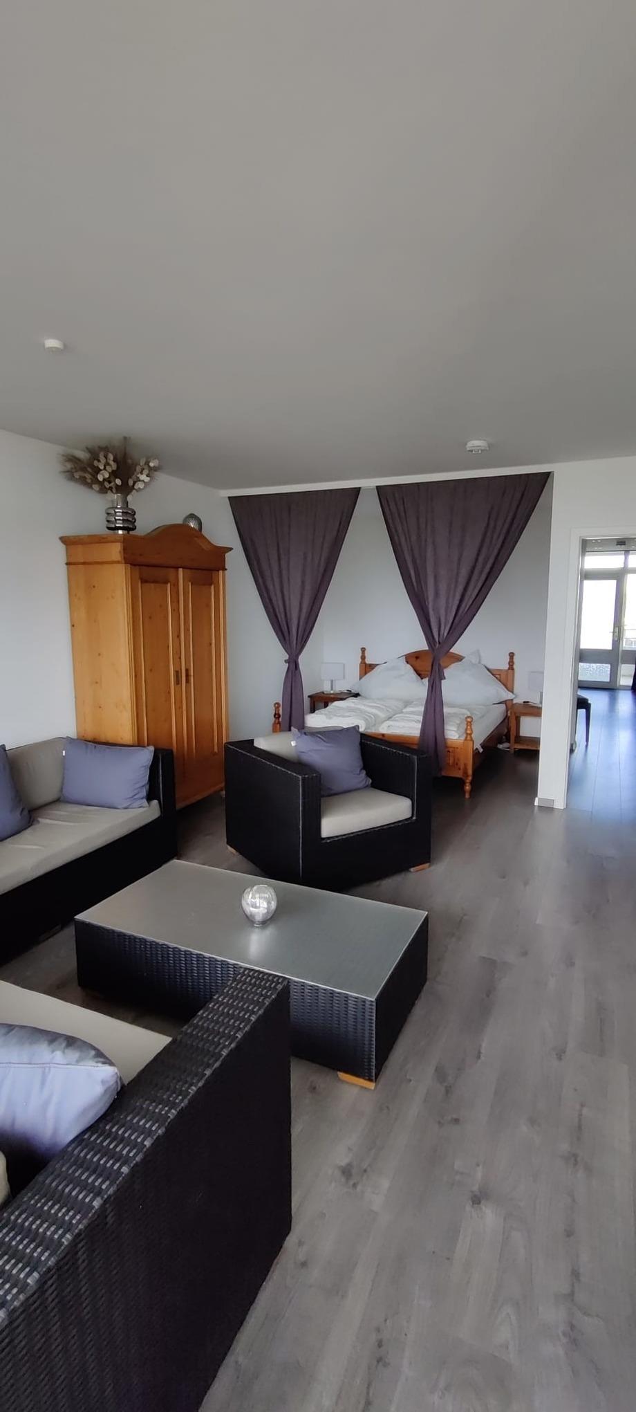 In dem großen Wohnraum steht eine gemütliche und moderne